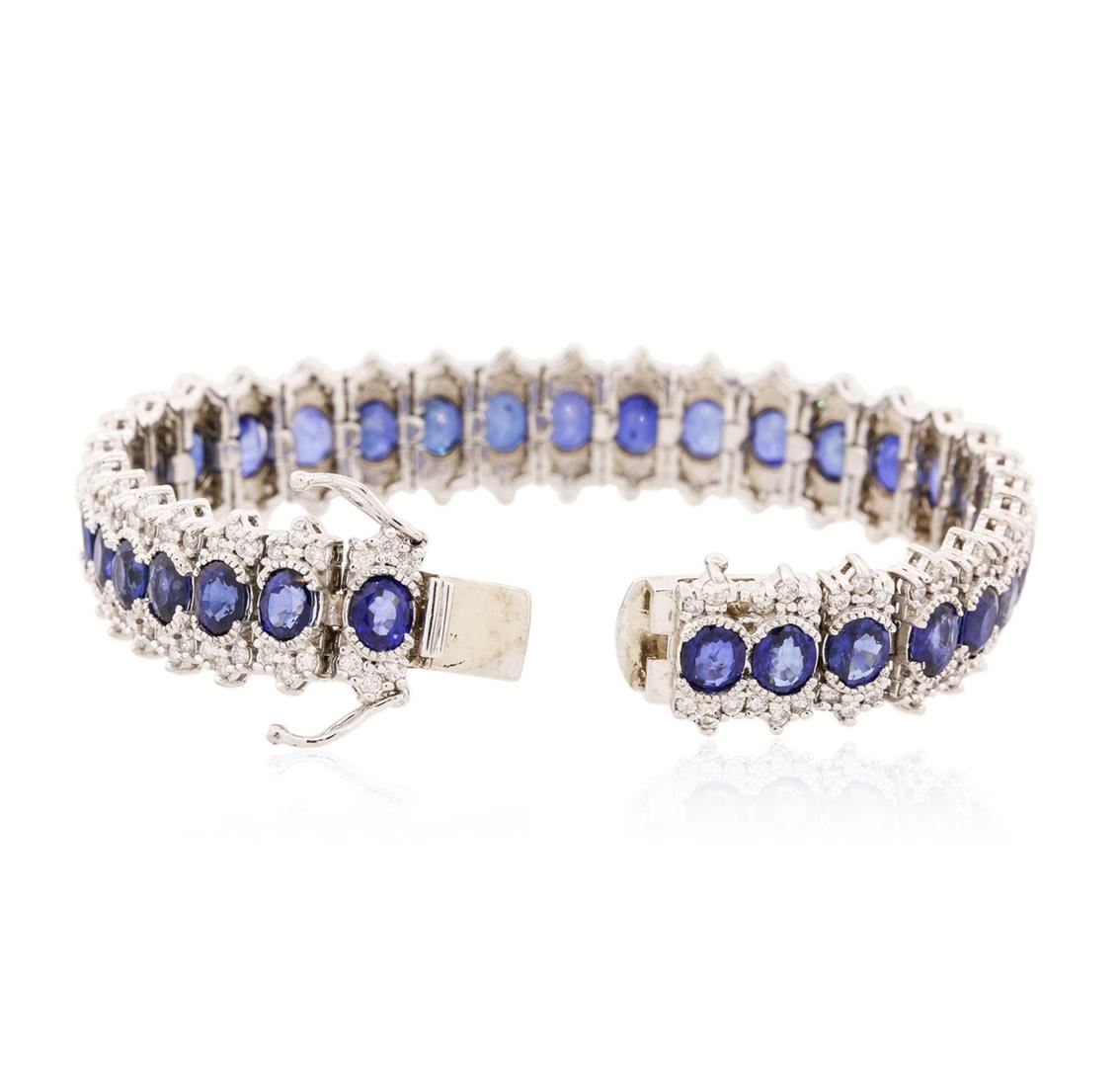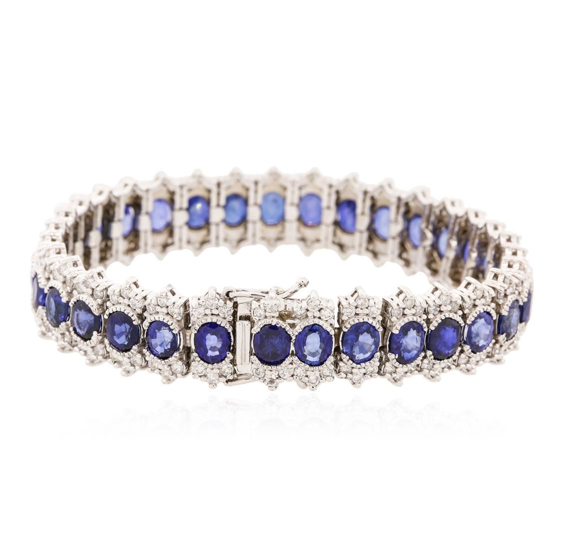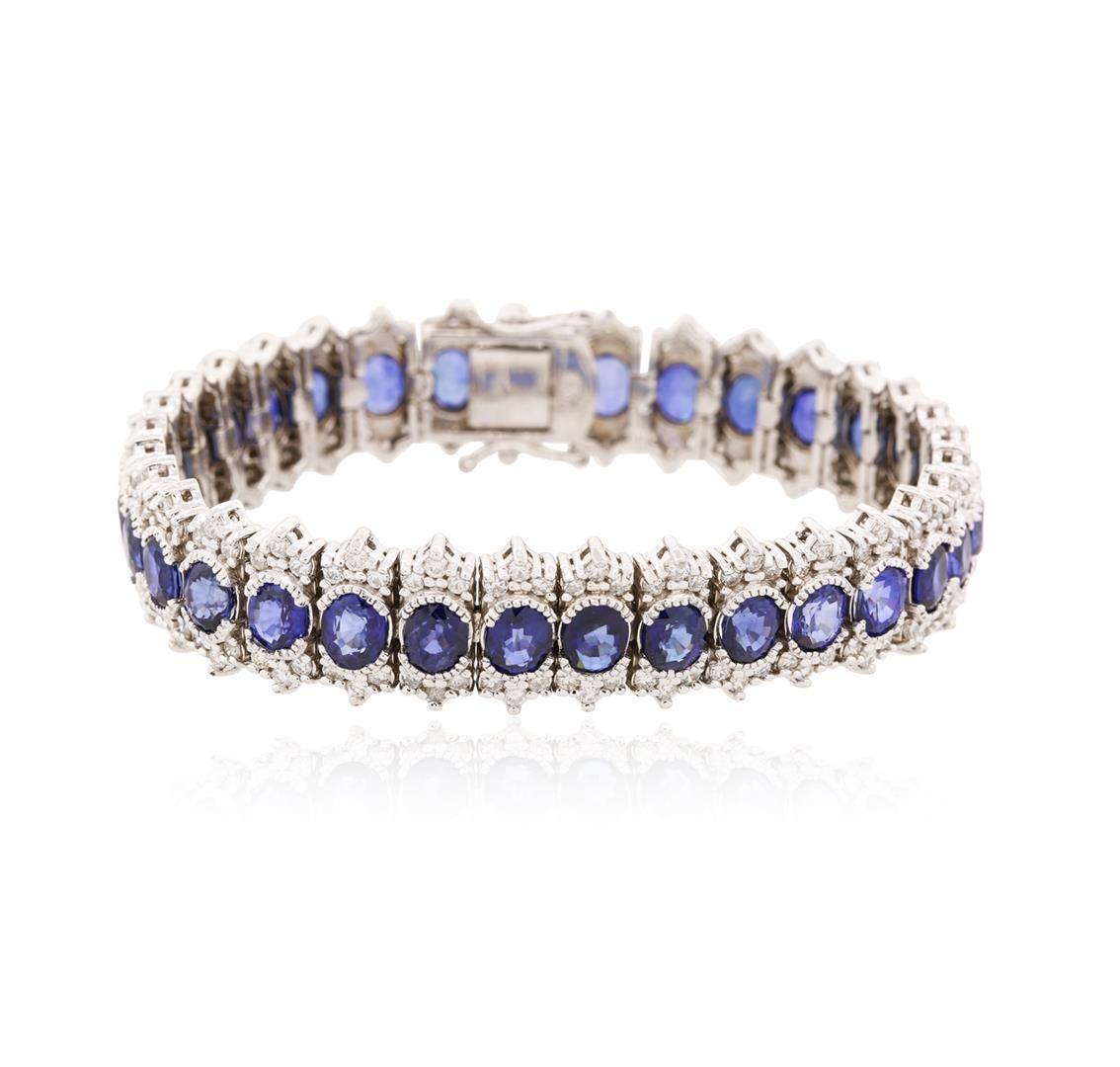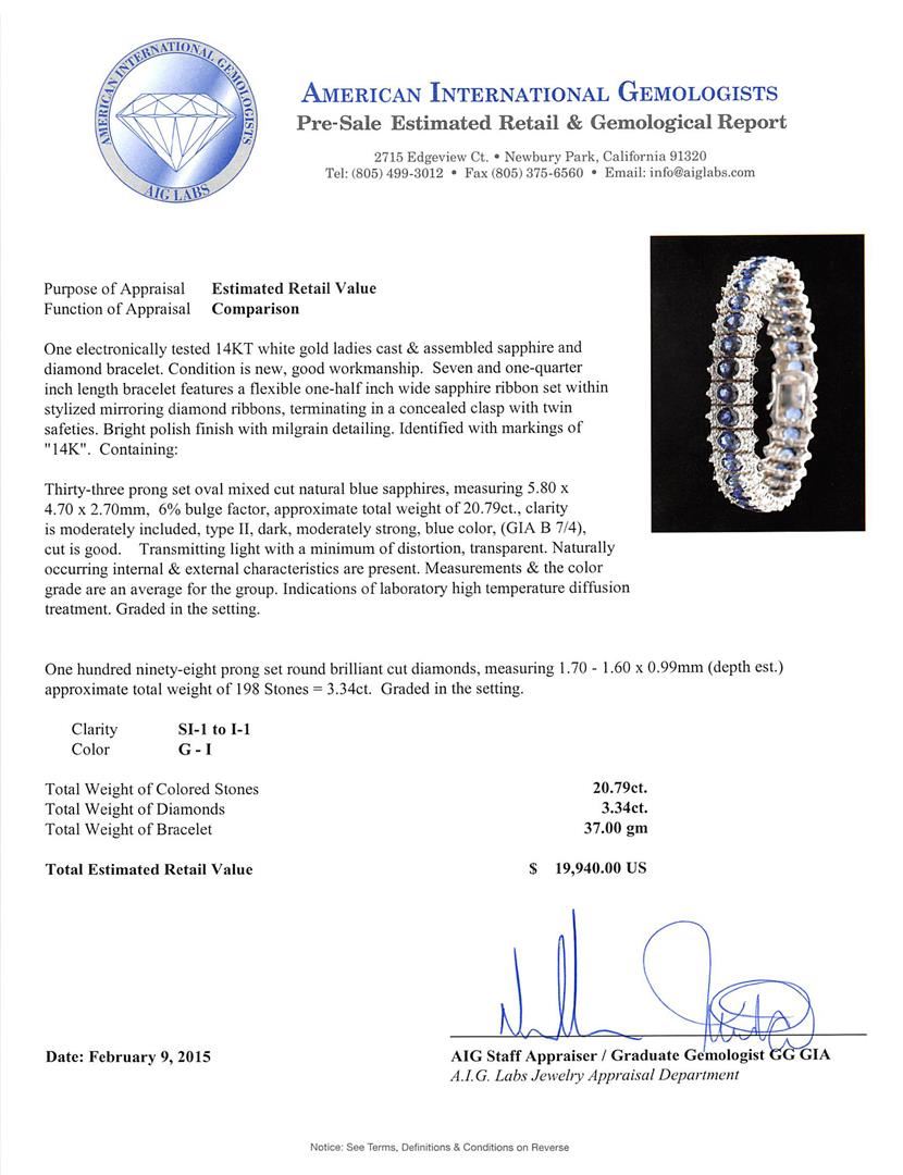 One electronically tested 14KT white gold ladies cast & assembled sapphire and diamond bracelet. Seven and one-quarter inch length bracelet features a flexible one-half inch wide sapphire ribbon set within stylized mirroring diamond ribbons, terminating in a concealed clasp with twin safeties. Bright polish finish with milgrain detailing. Identified with markings of "14K". Condition is new, good workmanship. Containing: Thirty-three prong set oval mixed cut natural blue sapphires, measuring 5.80 x 4.70 x 2.70mm, 6% bulge factor, approximate total weight of 20.79ct., clarity is moderately included, type II, dark, moderately strong, blue color, (GIA B 7/4), cut is good. Transmitting light with a minimum of distortion, transparent. Naturally occurring internal & external characteristics are present. Measurements & the color grade are an average for the group. Indications of laboratory high temperature diffusion treatment. Graded in the setting. One Hundred Ninety-Eight prong set round brilliant cut diamonds, measuring 1.70 - 1.60 x 0.99mm (depth est.) approximate total weight of 198 Stones = 3.34ct. Graded in the setting. Clarity: SI-1 to I-1. Color: G - I. Total Weight of Colored Stones 20.79ct. Total Weight of Diamonds 3.34ct. Total Weight of Bracelet 37.00 grams. AIG Appraised at $19,940.00.