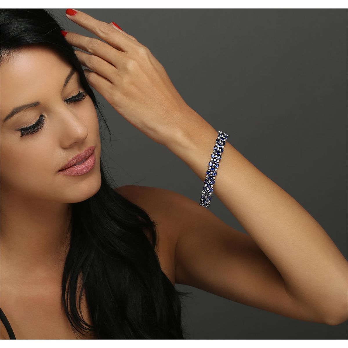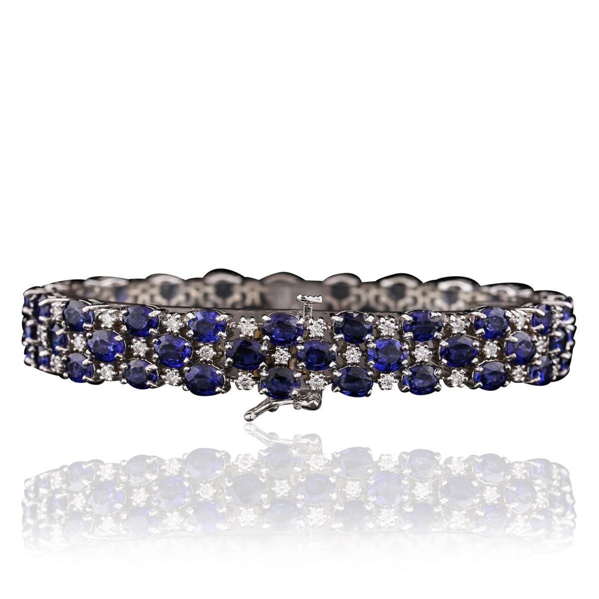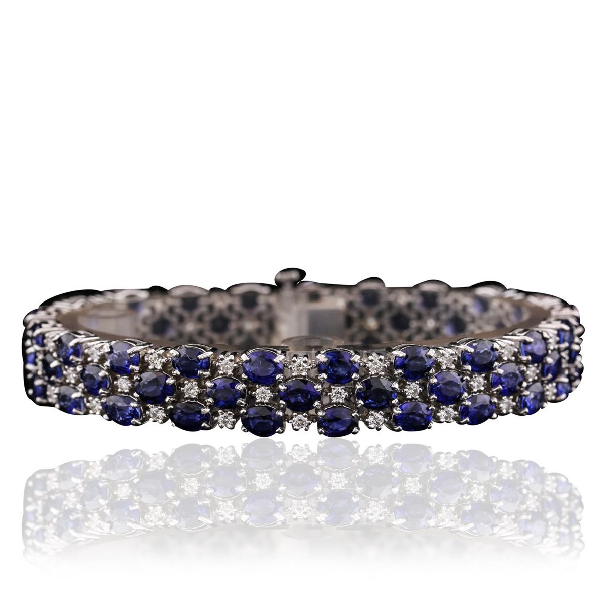 One electronically tested 14KT white gold ladies combination cast & assembled bracelet with a hidden box clasp with a bright polish finish. Measurements: 7" in length Identified with markings of "14K". Condition is new. Containing: Sixty-three prong set oval modified brilliant cut natural blue sapphires, measuring 5.00 x 3.50 x 2.28mm, approximate total weight of 20.79ct., clarity is eye clean, type II, medium, moderately strong, blue color, (GIA B 5/4), cut is good. Sixty-Three prong set round brilliant cut diamonds, measuring 1.50 - 1.50 x 0.90mm (depth est.) approximate total weight of 63 Stones = 0.78ct. Clarity: SI-1 to SI-2. Color: I - J, Cut is Good. Colored gemstones are presumed to have been subjected to commonly used enhancement processes. All diamonds and colored gemstones are graded in the mounting, unless otherwise stated. Total Weight of Colored Stones 20.79ct. Total Weight of Diamonds 0.78ct. Total Weight of Bracelet 32.20 grams. GGL Appraised at $21,025.00.