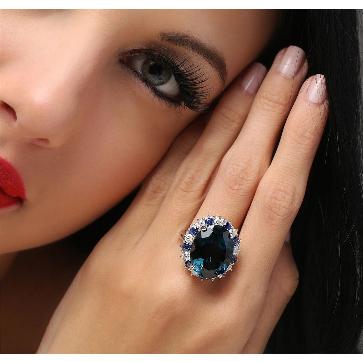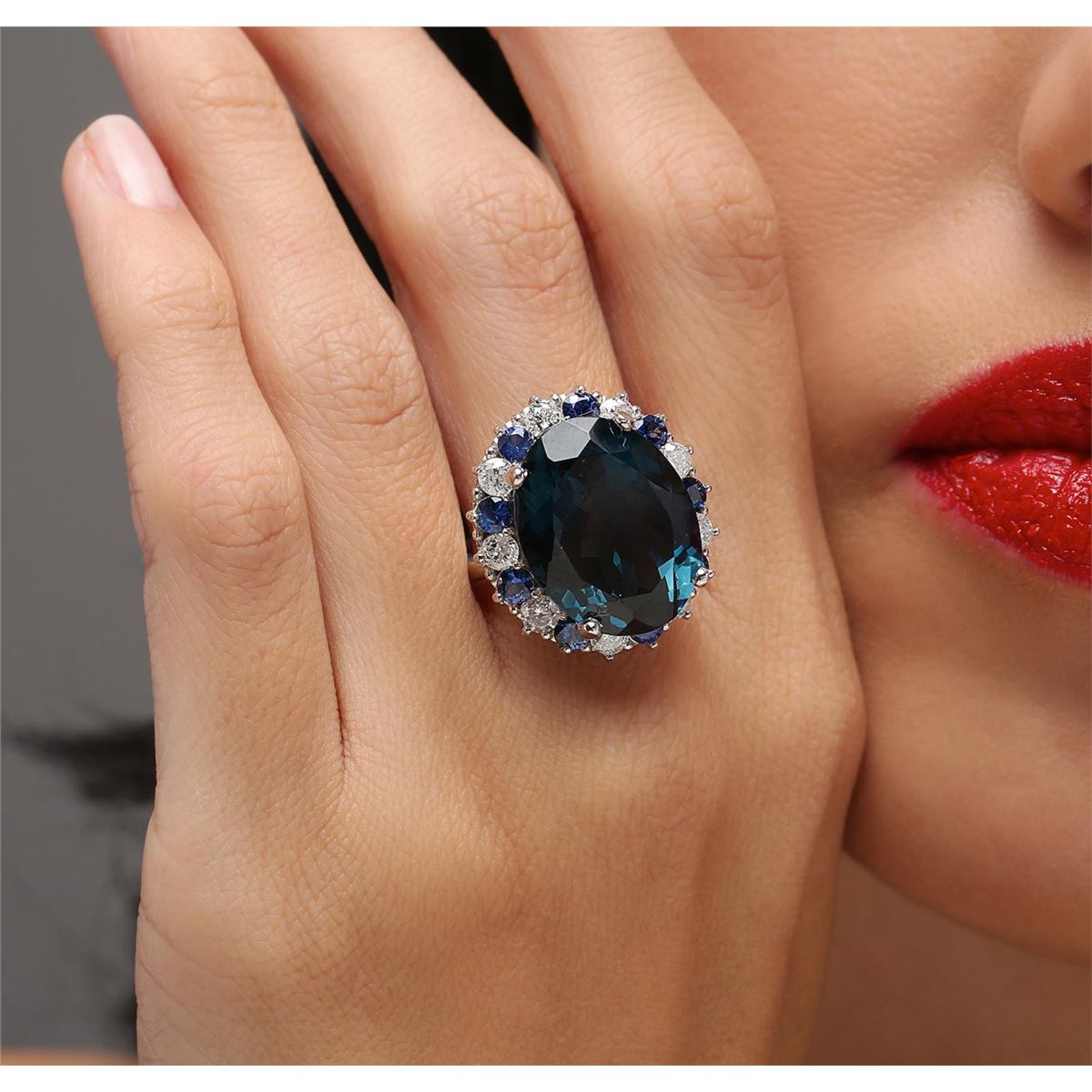 One electronically tested 14KT white gold ladies cast blue topaz, sapphire and diamond ring with a bright polish finish. The featured blue topaz is set within a sapphire and diamond bezel, completed by a two and one-half millimeter wide band. Identified with markings of "K14". Condition is new, good workmanship. Containing: One prong set oval mixed cut natural blue topaz, measuring 19.50 x 15.00 x 9.35mm, 6% bulge factor, approximate weight of 20.82ct., clarity is eye clean, type I, dark, very slightly grayish, very slightly greenish blue color, (GIA vslgB 7/3), cut is good. Transmitting light with no distortion, transparent. Graded in the setting. A deposit of a thin layer has been applied to the topaz to produce the intense color effect. The process utilizes a very high temperature treatment, diffusion of ions into the topaz, plus in some cases neutron bombardment has been used to create the color center. Diffusion processes causes the added ions to become part of the crystal surface with no distinct boundary. Do not put a gem treated in this manner into an ultrasonic cleaner. Nine prong set round brilliant cut natural blue sapphires, measuring 3.10 - 3.00 x 1.98 mm, approximate total weight of 1.35ct., clarity is slightly included, type II, dark, moderately strong, blue color, (GIA B 7/4), cut is good. Transmitting light with a minimum of distortion, transparent. Naturally occurring internal & external characteristics are present. Color grade is an average for the group. Indications of laboratory high temperature diffusion treatment. Graded in the setting. Nine prong set round brilliant cut diamonds, measuring 3.40 - 3.30 x 2.01mm (depth est.) approximate total weight of 9 Stones = 1.33ct. Graded in the setting. Clarity: I-1 to I-2. Color: G - H. Total Weight of Colored Stones 22.17ct. Total Weight of Diamonds 1.33ct. Total Weight of Ring 11.94 grams. AIG Appraised at $5,270.00.