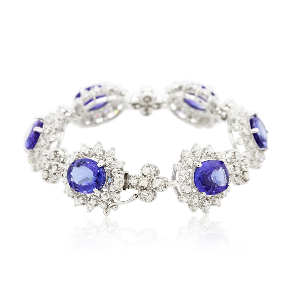One electronically tested 14KT white gold ladies combination cast & assembled bracelet with a hidden box clasp with a bright polish finish. Measurements: 6.85" in length. Identified with markings of "14K". Condition is new. Containing: Six prong set oval modified brilliant cut natural tanzanites, measuring 10.90 x 8.50 x 5.54mm, approximate total weight of 20.94ct., clarity is eye clean, type I, medium, moderately strong, bluish violet color, (GIA bV 5/4), cut is good. One Hundred Sixty-Eight prong set round brilliant cut diamonds, measuring 1.80 - 1.80 x 1.08mm (depth est.) approximate total weight of 168 Stones = 3.58ct. Clarity: SI-1 to I-1. Color: H - I, Cut is Good. Colored gemstones are presumed to have been subjected to commonly used enhancement processes. All diamonds and colored gemstones are graded in the mounting, unless otherwise stated. Total Weight of Colored Stones 20.94ct. Total Weight of Diamonds 3.58ct. Total Weight of Bracelet 27.80 grams. GGL Appraised at $45,210.00.