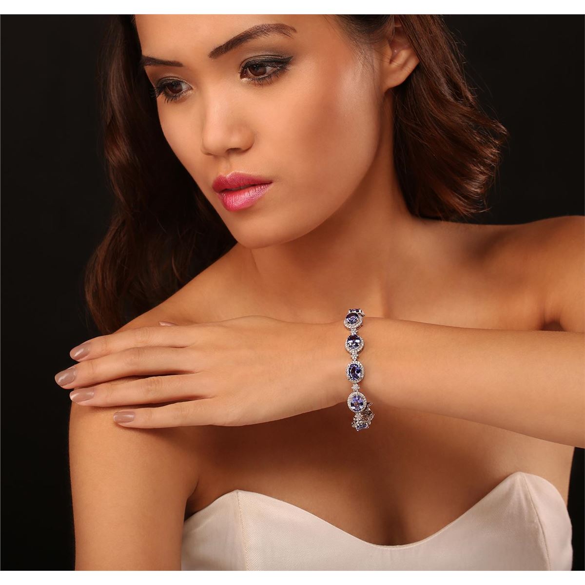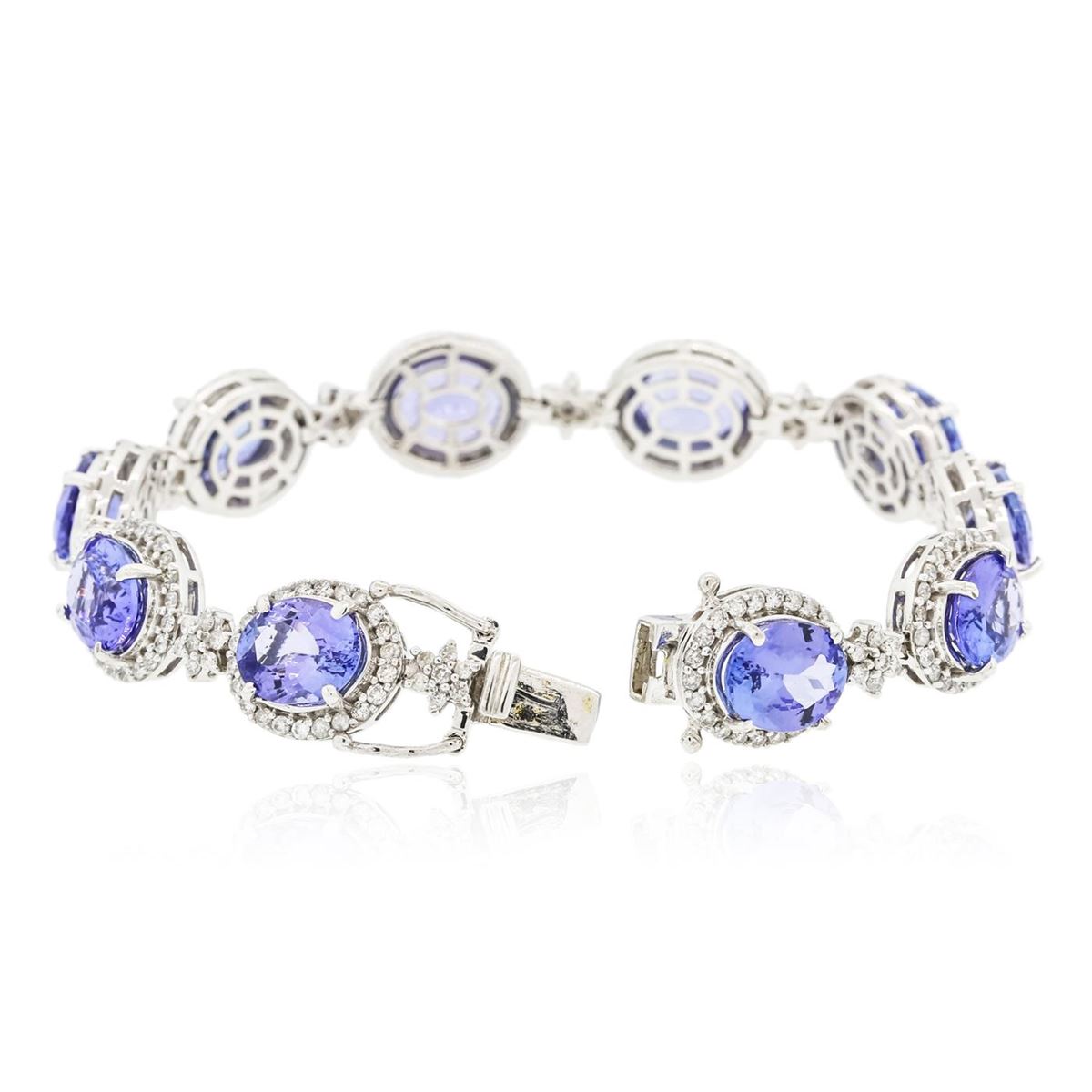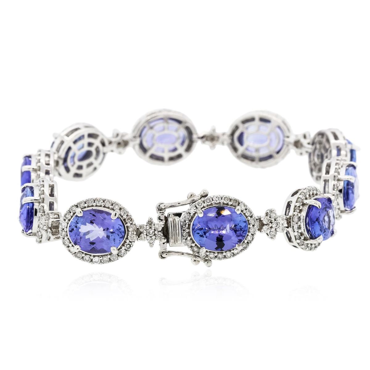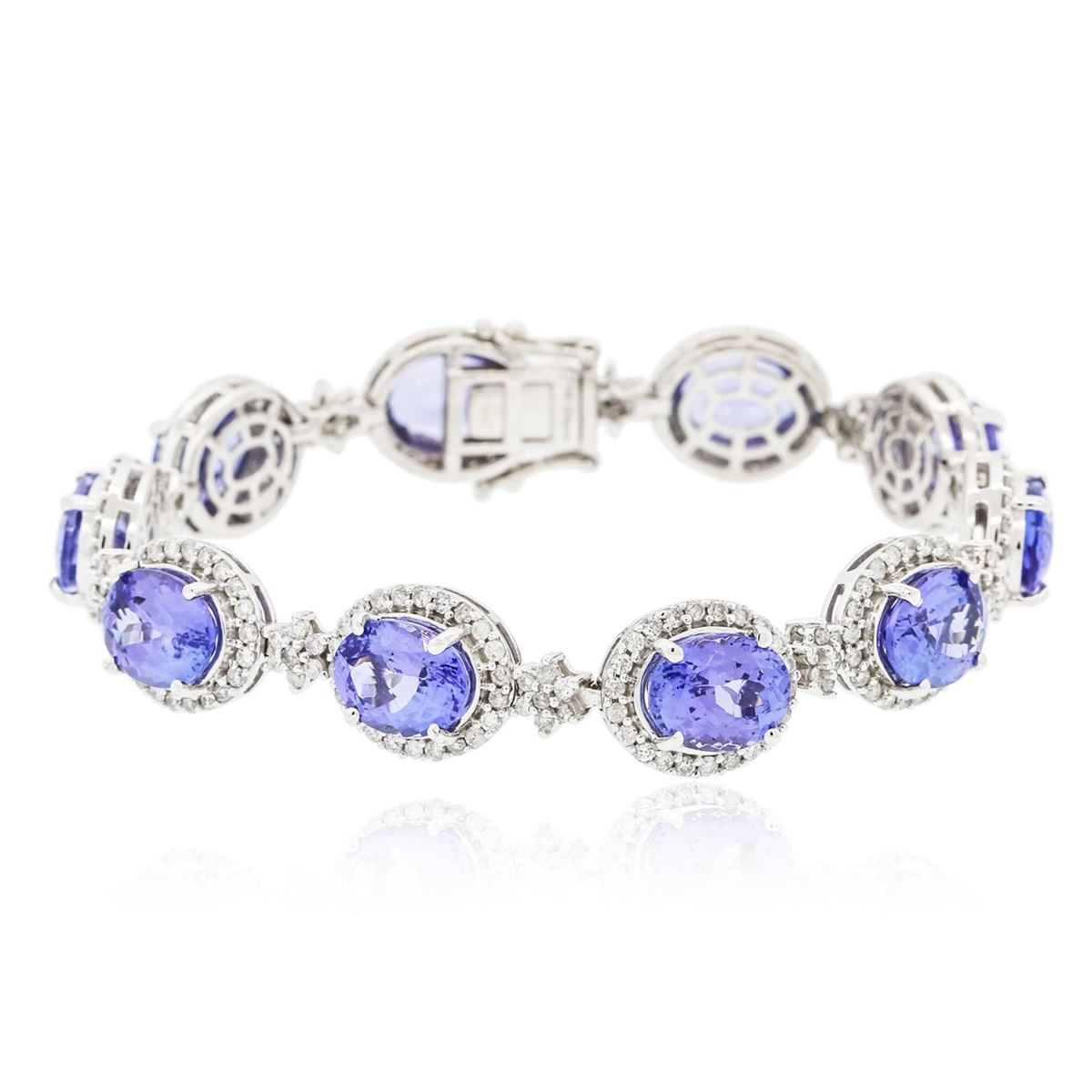 One electronically tested 14KT white gold Ladies combination cast & assembled bracelet with a hidden box clasp with a bright polish finish. Condition is new. Measurements: 7" in length. Identified with markings of "14K". Containing: Ten prong set oval modified brilliant cut natural tanzanites, measuring 9.24 x 7.45 x 4.50mm, approximate. Total Weight of 21.00ct., clarity is eye clean, type I, medium, very slightly grayish, violet color, (GIA V 5/3), cut is very good. Colored gemstones are presumed to have been subjected to commonly used color/clarity enhancement processes. Two Hundred Ninety prong set round brilliant cut diamonds, measuring 1.40 - 1.40 x 0.84mm (depth est.) approximate. Total Weight of 290 Stones = 2.90ct. Clarity: I-1 to I-2. Color: I - J, Cut is Good. Total Weight of Colored Stones 21.00ct. Total Weight of Diamonds 2.90ct. Total Weight of Bracelet 25.30 Grams. GGL Appraised at $43,235.00.