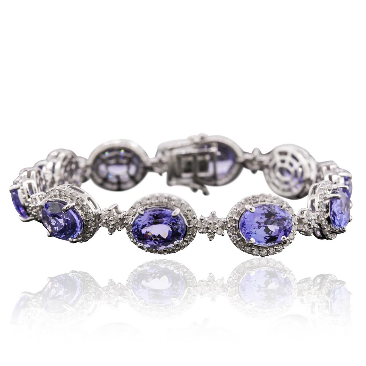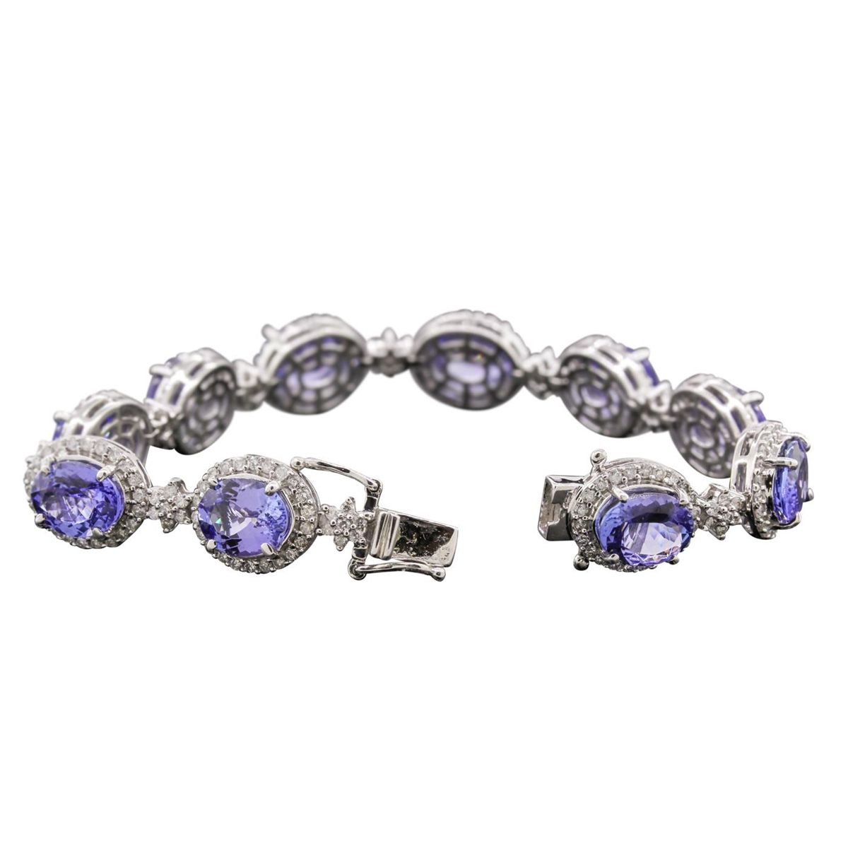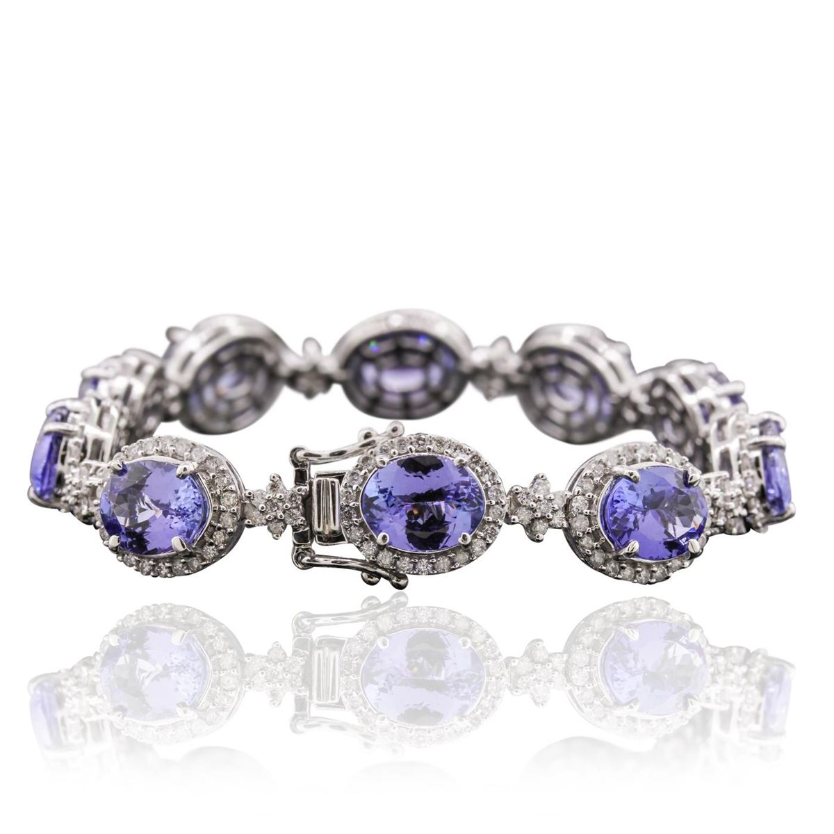 One electronically tested 14KT white gold Ladies combination cast & assembled bracelet with a hidden box clasp with a bright polish finish. Condition is new. Measurements: 7" in length. Identified with markings of "14K". Containing: Ten prong set oval modified brilliant cut natural tanzanites, measuring 9.24 x 7.45 x 4.50mm, approximate. Total Weight of 21.00ct., clarity is eye clean, type I, medium, very slightly grayish, violet color, (GIA V 5/3), cut is very good. Colored gemstones are presumed to have been subjected to commonly used color/clarity enhancement processes. Two Hundred Ninety prong set round brilliant cut diamonds, measuring 1.40 - 1.40 x 0.84mm (depth est.) approximate. Total Weight of 290 Stones = 2.90ct. Clarity: I-1 to I-2. Color: I - J, Cut is Good. Total Weight of Colored Stones 21.00ct. Total Weight of Diamonds 2.90ct. Total Weight of Bracelet 25.30 Grams. GGL Appraised at $43,235.00.