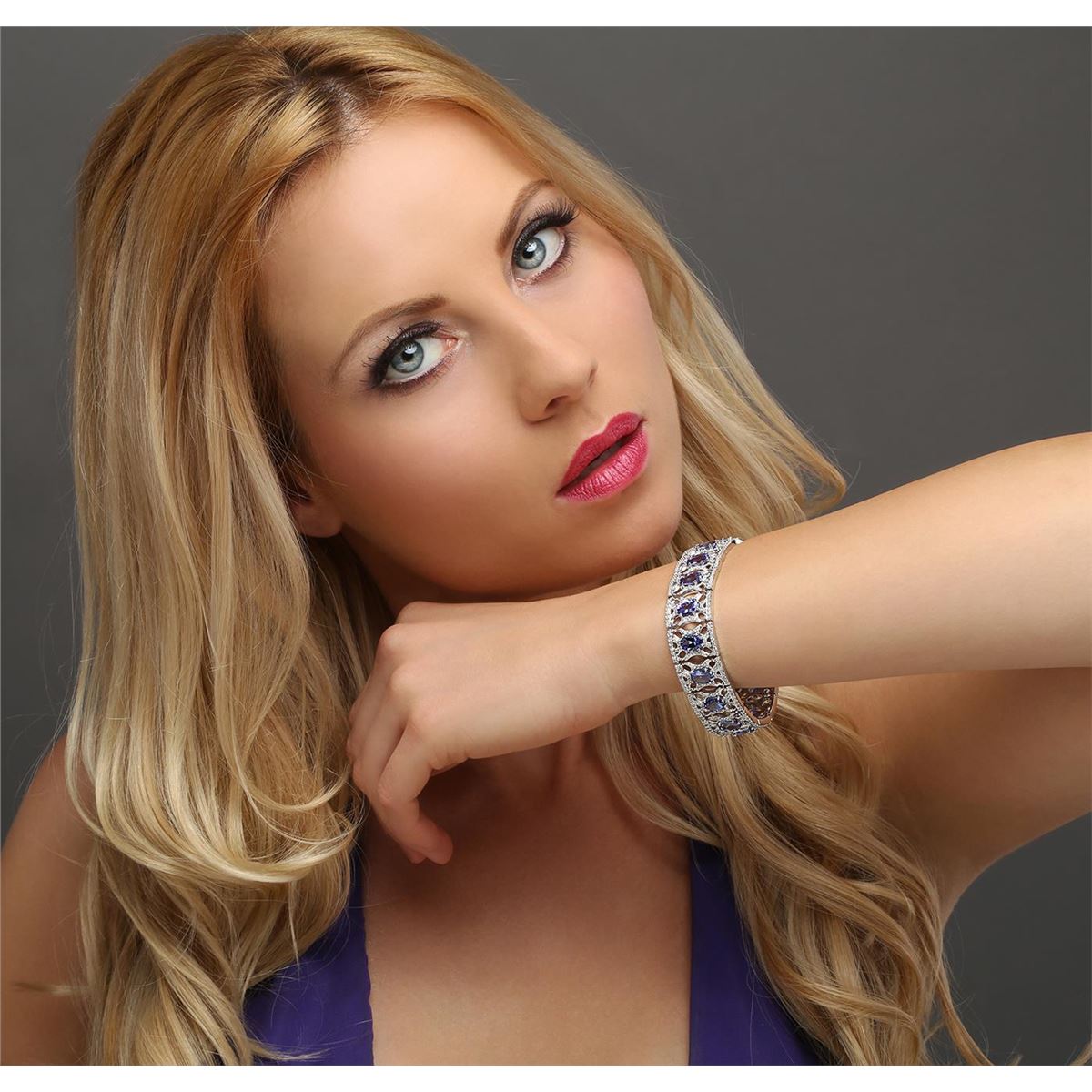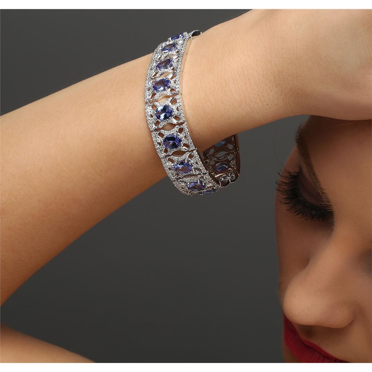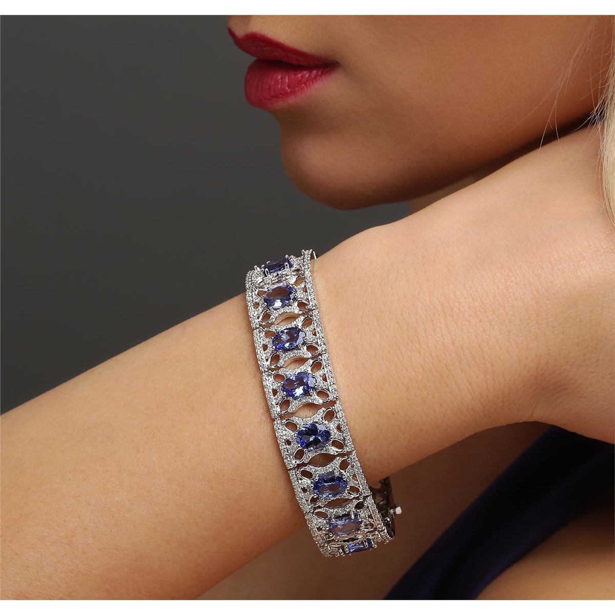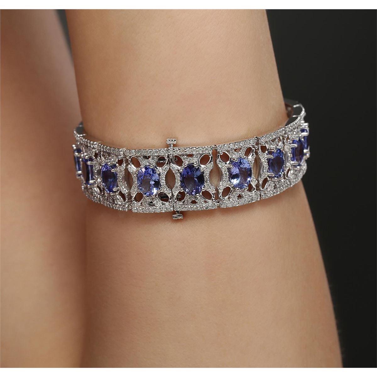 One electronically tested 14KT white gold ladies cast tanzanite and diamond bracelet with a hidden box clasp with a bright polish finish. Measurements: 7.25" in length Condition is new. Containing: Sixteen prong set oval modified brilliant cut natural tanzanites, measuring 8.00 x 6.00 x 3.90mm, approximate total weight of 21.12ct., clarity is eye clean, type I, medium light, very slightly grayish, violet color, (GIA V 4/3), cut is good. Five Hundred Forty-Four prong set round brilliant cut diamonds, measuring 1.20 - 1.20 x 0.72mm (depth est.) approximate total weight of 544 Stones = 3.43ct. Clarity: I-1 to I-2. Color: I - J, Cut is Good. Colored gemstones are presumed to have been subjected to commonly used enhancement processes. All diamonds and colored gemstones are graded in the mounting, unless otherwise stated. Total Weight of Colored Stones 21.12ct. Total Weight of Diamonds 3.43ct. Total Weight of Bracelet 36.50 grams. GGL Appraised at $16,780.00.