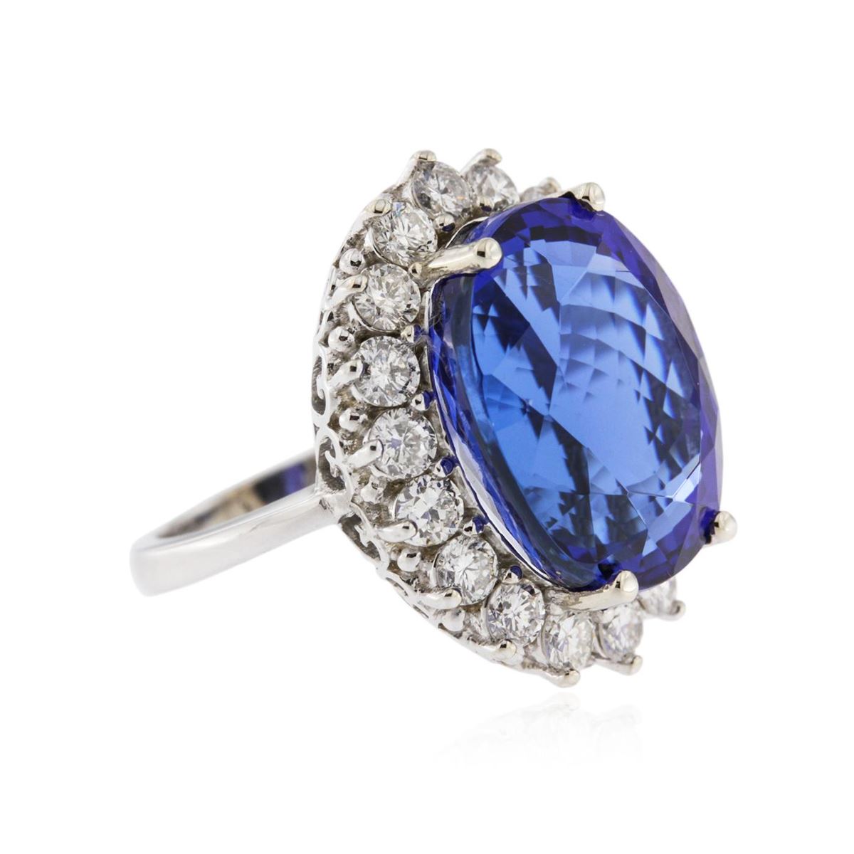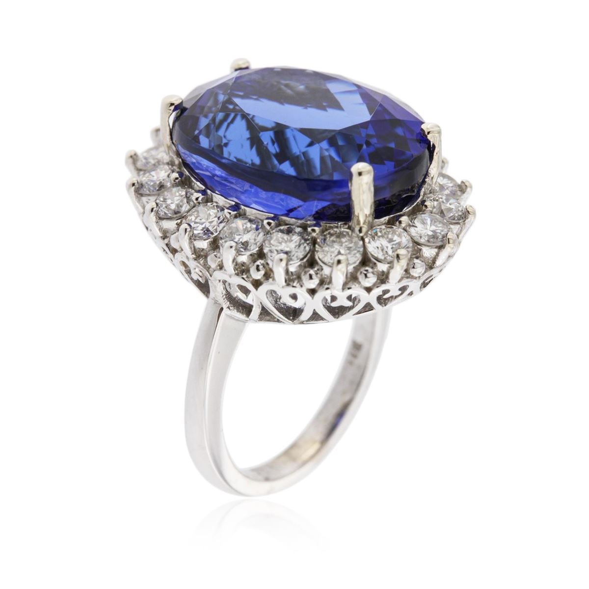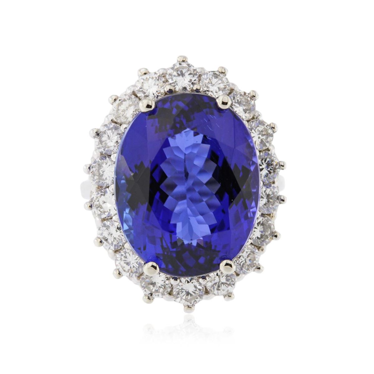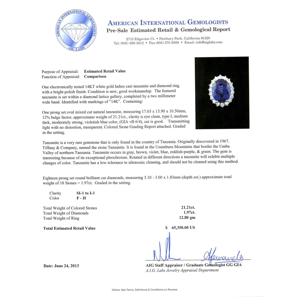 One electronically tested 14KT white gold ladies cast tanzanite and diamond ring with a bright polish finish. Condition is new, good workmanship. The featured tanzanite is set within a diamond lattice gallery, completed by a two millimeter wide band. Identified with markings of "14K". Containing: One prong set oval mixed cut natural tanzanite, measuring 17.65 x 13.90 x 10.50mm, 12% bulge factor, approximate weigh of 21.21ct., clarity is eye clean, type I, medium dark, moderately strong, violetish blue color, (GIA Vb 6/4), cut is good. Transmitting light with no distortion, transparent. Colored stone grading report attached. Graded in the setting. Tanzanite is a very rare gemstone that is only found in the country of Tanzania. Originally discovered in 1967. Tiffany & Company, named the stone tanzanite. It is found in the Usumburu Mountains that border the umba valley of northern tanzanite. Tanzanite occurs in gray, brown, violet, blue, reddish-purplish & green. The gem is interesting because of its exceptional pleochroism. Rotated in different directions a tanzanite will exhibit multiple change of color. Tanzanite has a low tolerance to ultrasonic cleaning, and should not be cleaned using this method. Eighteen prong set round brilliant cut diamonds, measuring 3.10 - 3.00 x 1.83mm (depth est.) approximate total weight of 18 stones = 1.97ct. Graded in the setting. Clarity SI-1 to I-1. Color F-H. Total weight of Tanzanite 21.21ct. Total weight of Diamonds 1.97ct. Total weight of Ring 12.80gm. AIG Appraised at $65,350.00.