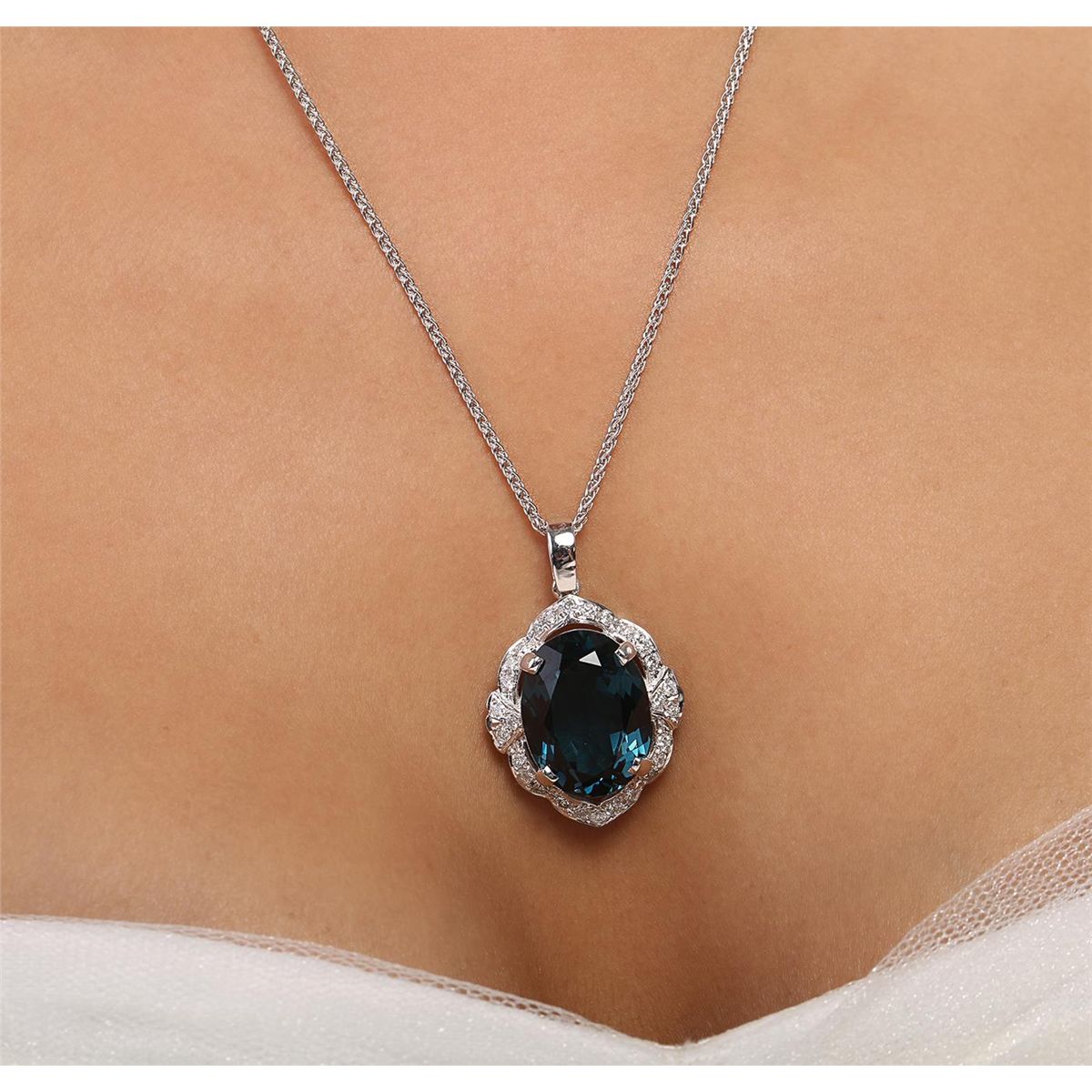 One electronically tested 14KT white gold ladies cast & assembled blue topaz and diamond pendant with chain. Condition is new, good workmanship. The pendant features a blue topaz set within a stylized diamond bezel, completed by a white gold bail. The pendant is supported by an eighteen inch length 14KT white gold designer style chain, terminating in a lobster claw clasp. Bright polish finish. Identified with markings of "14K". Containing: One prong set oval mixed cut natural blue topaz, measuring 20.00 x 15.00 x 9.35mm, 6%. bulge factor, approximate weight of 21.43ct., clarity is eye clean, type I, dark, very slightly grayish, greenish blue color, (GIA gB 7/3), cut is good. Transmitting light with no distortion, transparent. Graded in the setting. A deposit of a thin layer has been applied to the topaz to produce the intense color effect. The process utilizes a very high temperature treatment, diffusion of ions into the topaz, plus in some cases neutron bombardment has been used to create the color center. Diffusion processes causes the added ions to become part of the crystal surface with no distinct boundary. Do not put a gem treated in this manner into an ultrasonic cleaner. Twenty-Eight prong set round brilliant cut diamonds, measuring 1.90 - 1.80 x 1.11mm (depth est.) approximate. Total Weight of 28 Stones = 0.74ct. Graded in the setting. Clarity: SI-2 to I-2. Color: H - J. Total Weight of Colored Stones 21.43ct. Total Weight of Diamonds 0.74ct. Total Weight of Pendant With Chain 15.17 grams. AIG Appraised at $4,590.00.