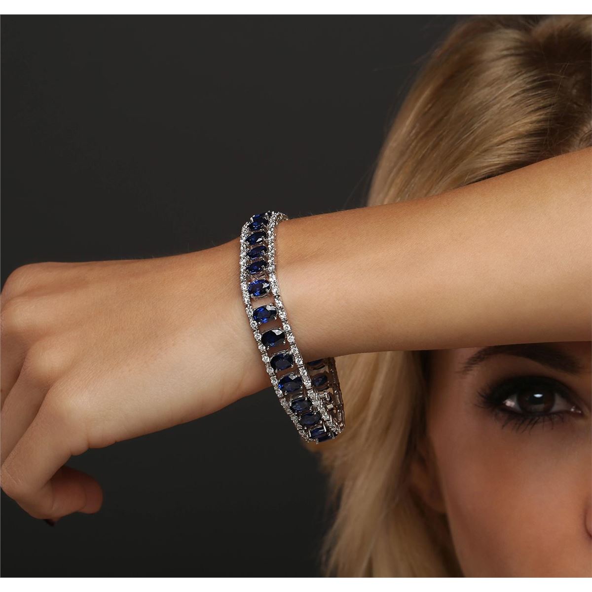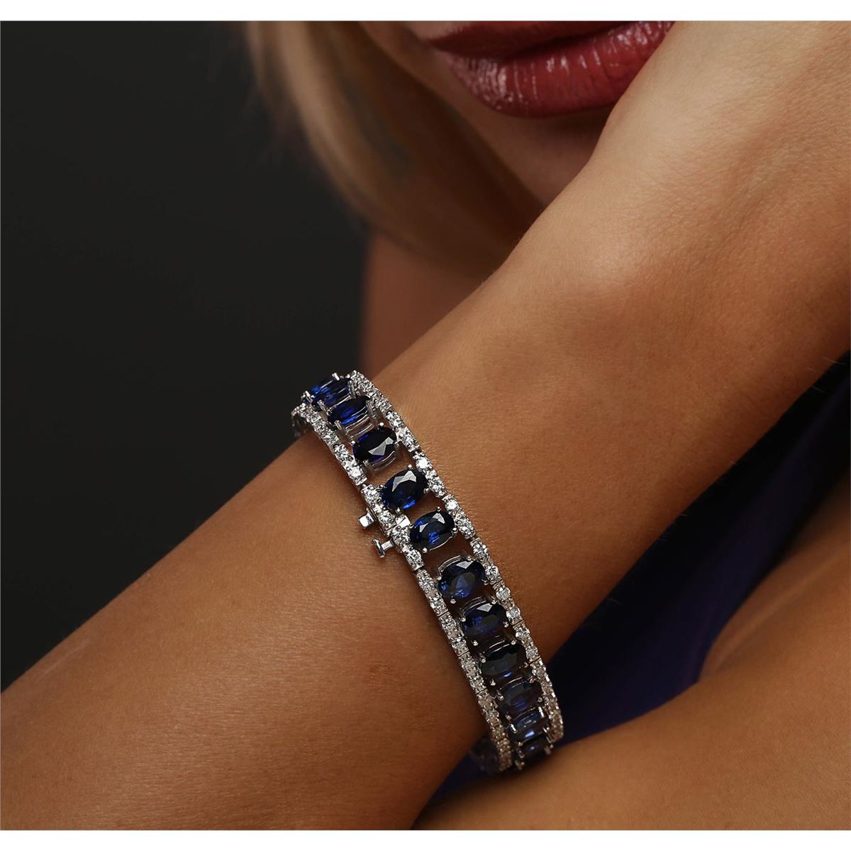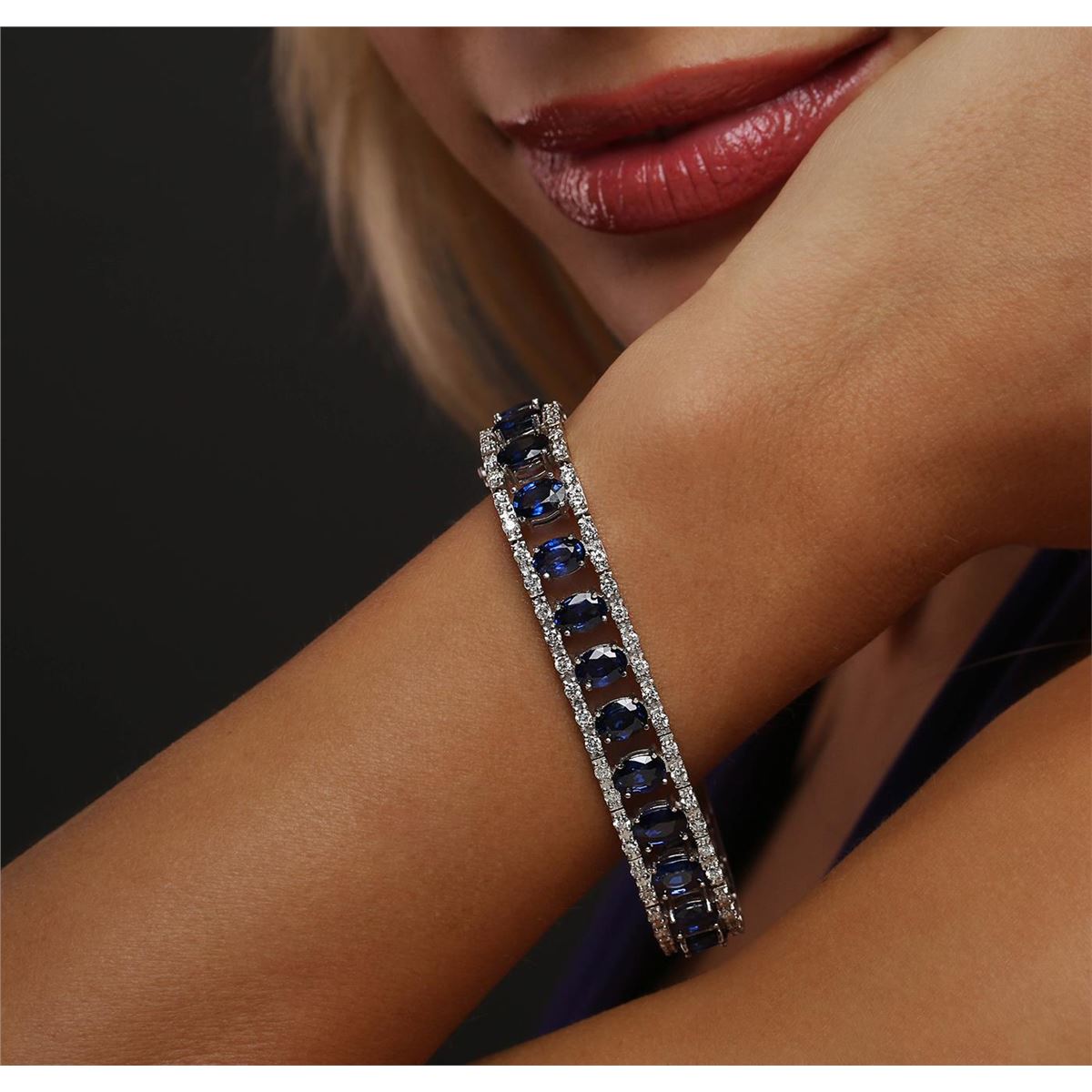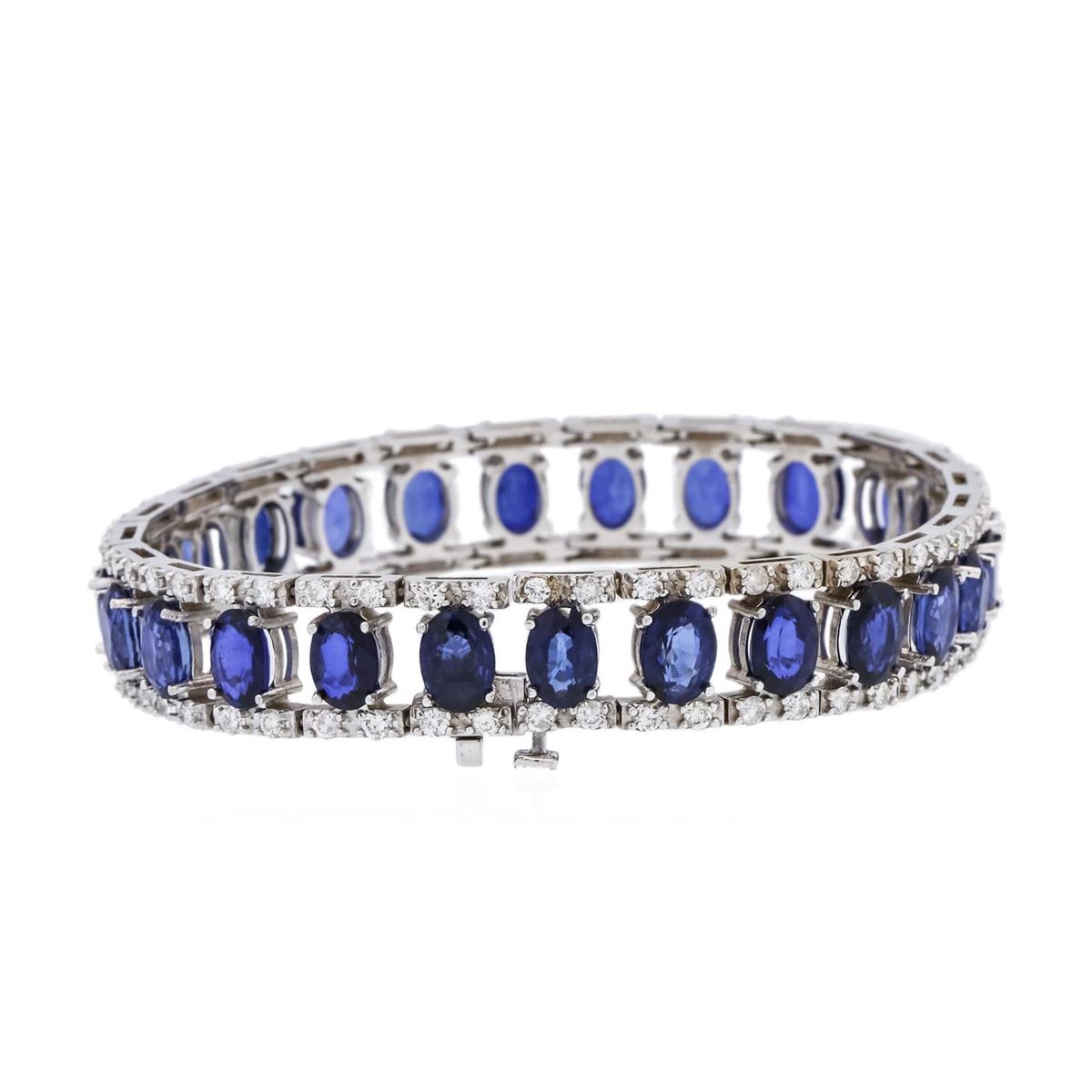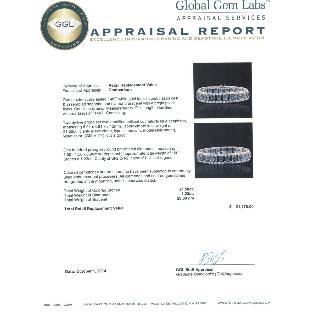 One electronically tested 14KT white gold ladies combination cast & assembled sapphire and diamond bracelet with a bright polish finish. Measurements: 7" in length. Identified with markings of "14K". Condition is new. Containing: Twenty-five prong set oval modified brilliant cut natural blue sapphires, measuring 6.91 x 4.81 x 3.12mm, approximate total weight of 21.50ct., clarity is eye clean, type II, medium, moderately strong, violet color, (GIA V 5/4), cut is good. One Hundred prong set round brilliant cut diamonds, measuring 1.50 - 1.50 x 0.90mm (depth est.) approximate total weight of 100 Stones = 1.23ct. Clarity: SI-2 to I-2. Color: I - J, Cut is Good. Colored gemstones are presumed to have been subjected to commonly used enhancement processes. All diamonds and colored gemstones are graded in the mounting, unless otherwise stated. Total Weight of Colored Stones 21.50ct. Total Weight of Diamonds 1.23ct. Total Weight of Bracelet 28.60 grams. GGL Appraised at $21,170.00.