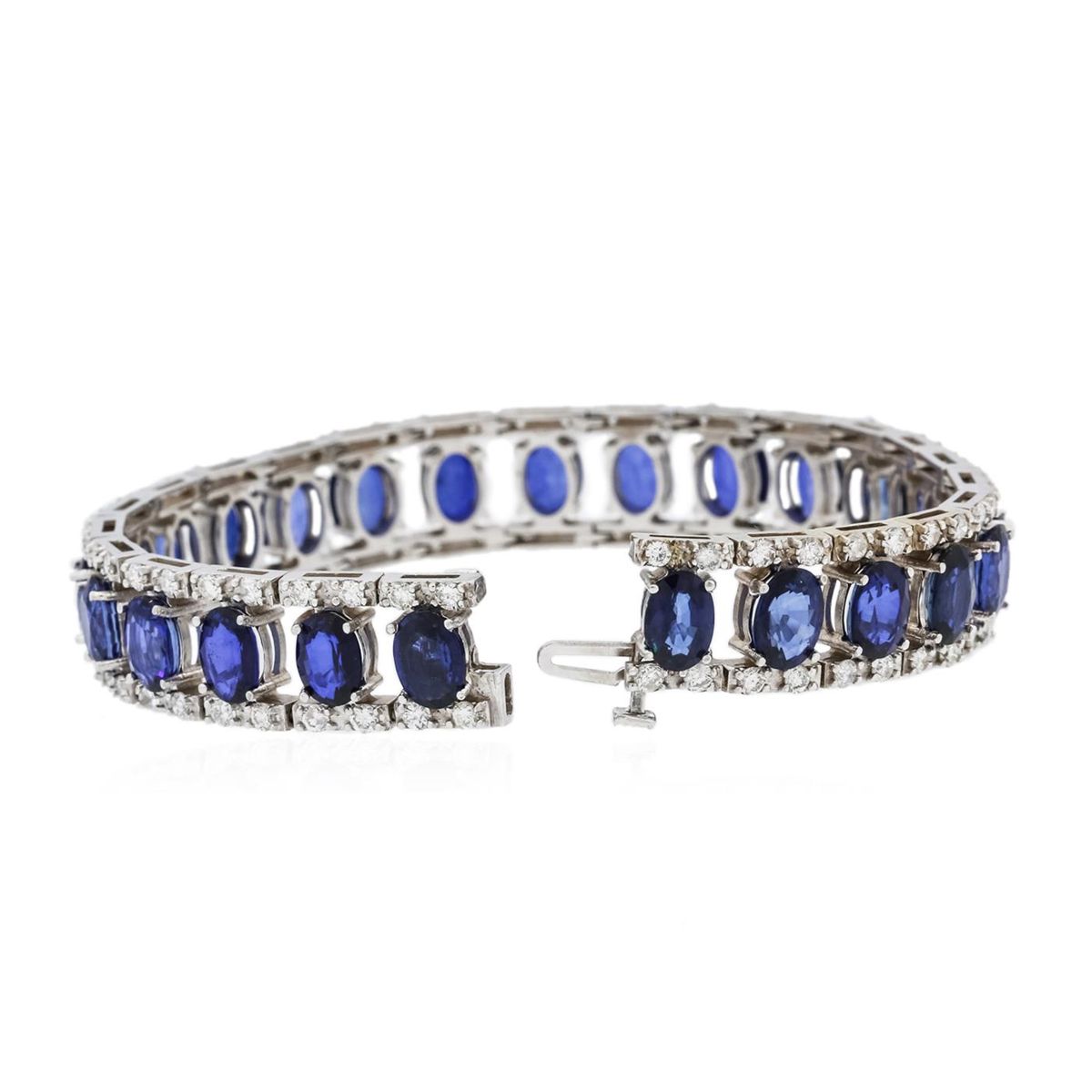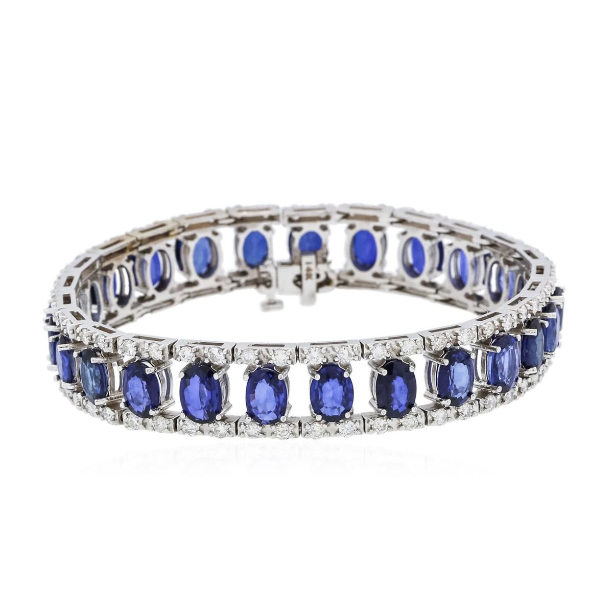 One electronically tested 14KT white gold ladies combination cast & assembled sapphire and diamond bracelet with a bright polish finish. Measurements: 7" in length. Identified with markings of "14K". Condition is new. Containing: Twenty-five prong set oval modified brilliant cut natural blue sapphires, measuring 6.91 x 4.81 x 3.12mm, approximate total weight of 21.50ct., clarity is eye clean, type II, medium, moderately strong, violet color, (GIA V 5/4), cut is good. One Hundred prong set round brilliant cut diamonds, measuring 1.50 - 1.50 x 0.90mm (depth est.) approximate total weight of 100 Stones = 1.23ct. Clarity: SI-2 to I-2. Color: I - J, Cut is Good. Colored gemstones are presumed to have been subjected to commonly used enhancement processes. All diamonds and colored gemstones are graded in the mounting, unless otherwise stated. Total Weight of Colored Stones 21.50ct. Total Weight of Diamonds 1.23ct. Total Weight of Bracelet 28.60 grams. GGL Appraised at $21,170.00.