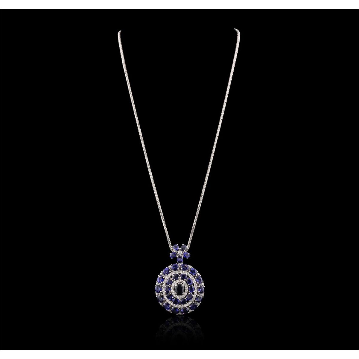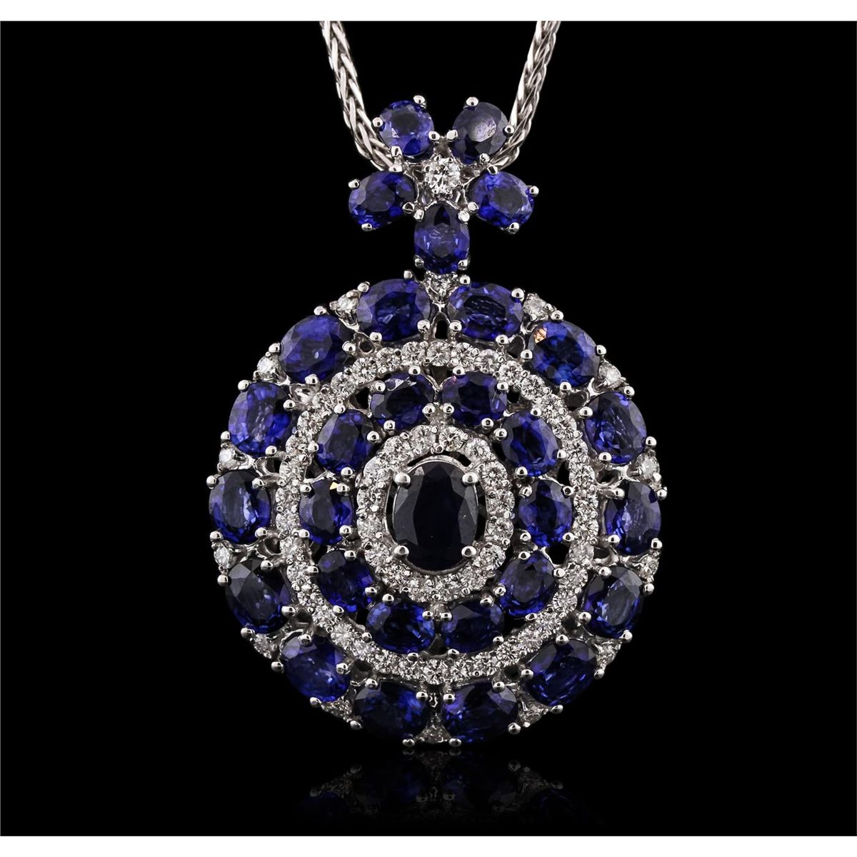 One electronically tested 14KT white gold ladies combination cast & assembled pendant & chain 18.0" long, medium fancy link with a lobster claw clasp with a bright polish finish. Identified with markings of "585". Condition is new. Containing: Thirty-two prong set oval modified brilliant cut natural blue sapphires, measuring 5.50 x 4.00 x 2.60mm, approximate total weight of 20.00ct., clarity is eye clean, type II, medium, moderately strong, blue color, (GIA B 5/4), cut is good. One prong set oval modified brilliant cut natural blue sapphire, measuring 8.00 x 6.00 x 3.90mm, approximate weight of 1.53ct., clarity is eye clean, type II, medium, moderately strong, blue color, (GIA B 5/4), cut is good. Sixty-Eight prong set round brilliant cut diamonds, measuring 2.20 - 1.80 x 1.20mm (depth est.) approximate total weight of 68 Stones = 1.12ct. Clarity: SI-1 to I-1. Color: I - J, Cut is Good. Colored gemstones are presumed to have been subjected to commonly used enhancement processes. All diamonds and colored gemstones are graded in the mounting, unless otherwise stated. Total Weight of Colored Stones 21.53ct. Total Weight of Diamonds 1.12ct. Total Weight of Pendant & Chain 26.00 grams. GGL Appraised at $17,460.00.