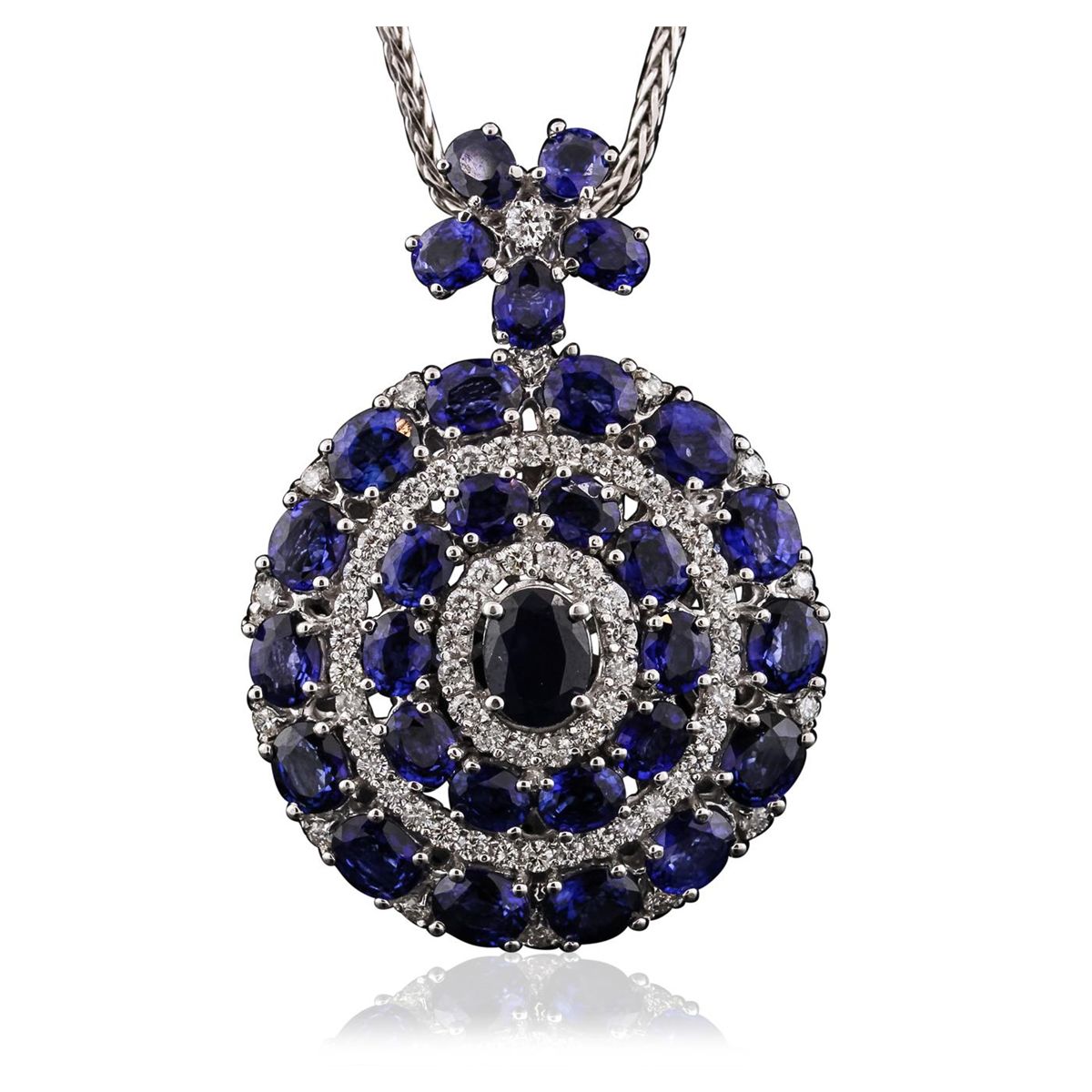 One electronically tested 14KT white gold ladies combination cast & assembled pendant & chain 18.0" long, medium fancy link with a lobster claw clasp with a bright polish finish. Identified with markings of "585". Condition is new. Containing: Thirty-two prong set oval modified brilliant cut natural blue sapphires, measuring 5.50 x 4.00 x 2.60mm, approximate total weight of 20.00ct., clarity is eye clean, type II, medium, moderately strong, blue color, (GIA B 5/4), cut is good. One prong set oval modified brilliant cut natural blue sapphire, measuring 8.00 x 6.00 x 3.90mm, approximate weight of 1.53ct., clarity is eye clean, type II, medium, moderately strong, blue color, (GIA B 5/4), cut is good. Sixty-Eight prong set round brilliant cut diamonds, measuring 2.20 - 1.80 x 1.20mm (depth est.) approximate total weight of 68 Stones = 1.12ct. Clarity: SI-1 to I-1. Color: I - J, Cut is Good. Colored gemstones are presumed to have been subjected to commonly used enhancement processes. All diamonds and colored gemstones are graded in the mounting, unless otherwise stated. Total Weight of Colored Stones 21.53ct. Total Weight of Diamonds 1.12ct. Total Weight of Pendant & Chain 26.00 grams. GGL Appraised at $17,460.00.