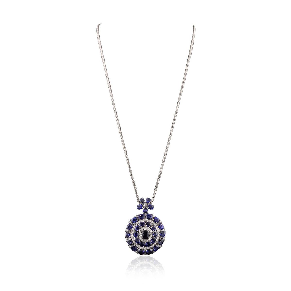 One electronically tested 14KT white gold ladies combination cast & assembled pendant & chain 18.0" long, medium fancy link with a lobster claw clasp with a bright polish finish. Identified with markings of "585". Condition is new. Containing: Thirty-two prong set oval modified brilliant cut natural blue sapphires, measuring 5.50 x 4.00 x 2.60mm, approximate total weight of 20.00ct., clarity is eye clean, type II, medium, moderately strong, blue color, (GIA B 5/4), cut is good. One prong set oval modified brilliant cut natural blue sapphire, measuring 8.00 x 6.00 x 3.90mm, approximate weight of 1.53ct., clarity is eye clean, type II, medium, moderately strong, blue color, (GIA B 5/4), cut is good. Sixty-Eight prong set round brilliant cut diamonds, measuring 2.20 - 1.80 x 1.20mm (depth est.) approximate total weight of 68 Stones = 1.12ct. Clarity: SI-1 to I-1. Color: I - J, Cut is Good. Colored gemstones are presumed to have been subjected to commonly used enhancement processes. All diamonds and colored gemstones are graded in the mounting, unless otherwise stated. Total Weight of Colored Stones 21.53ct. Total Weight of Diamonds 1.12ct. Total Weight of Pendant & Chain 26.00 grams. GGL Appraised at $17,460.00.