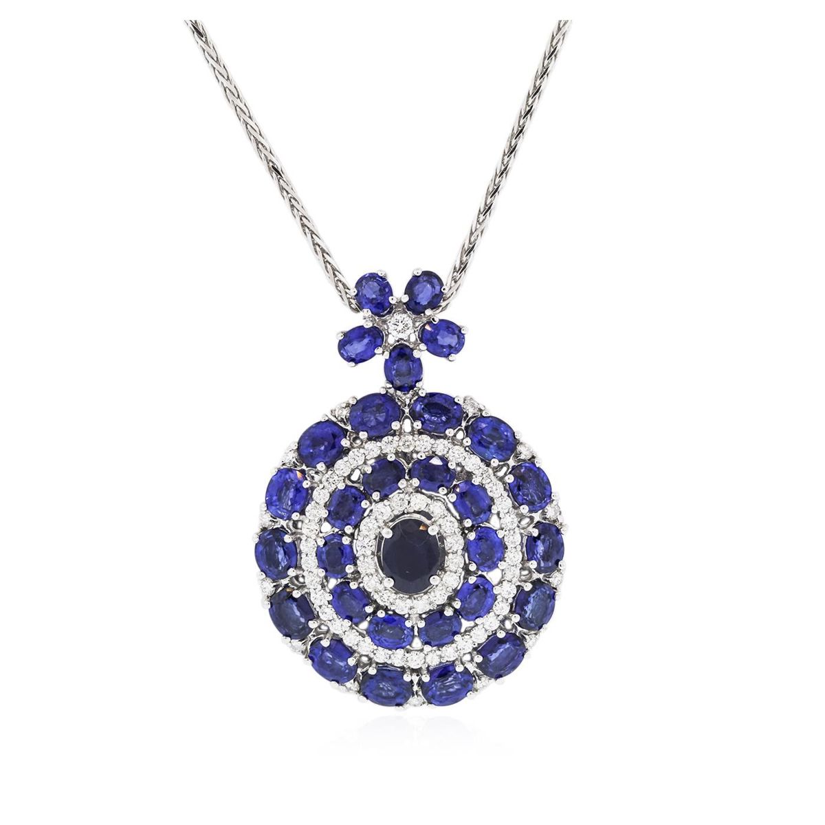 One electronically tested 14KT white gold ladies combination cast & assembled pendant & chain 18.0" long, medium fancy link with a lobster claw clasp with a bright polish finish. Identified with markings of "585". Condition is new. Containing: Thirty-two prong set oval modified brilliant cut natural blue sapphires, measuring 5.50 x 4.00 x 2.60mm, approximate total weight of 20.00ct., clarity is eye clean, type II, medium, moderately strong, blue color, (GIA B 5/4), cut is good. One prong set oval modified brilliant cut natural blue sapphire, measuring 8.00 x 6.00 x 3.90mm, approximate weight of 1.53ct., clarity is eye clean, type II, medium, moderately strong, blue color, (GIA B 5/4), cut is good. Sixty-Eight prong set round brilliant cut diamonds, measuring 2.20 - 1.80 x 1.20mm (depth est.) approximate total weight of 68 Stones = 1.12ct. Clarity: SI-1 to I-1. Color: I - J, Cut is Good. Colored gemstones are presumed to have been subjected to commonly used enhancement processes. All diamonds and colored gemstones are graded in the mounting, unless otherwise stated. Total Weight of Colored Stones 21.53ct. Total Weight of Diamonds 1.12ct. Total Weight of Pendant & Chain 26.00 grams. GGL Appraised at $17,460.00.