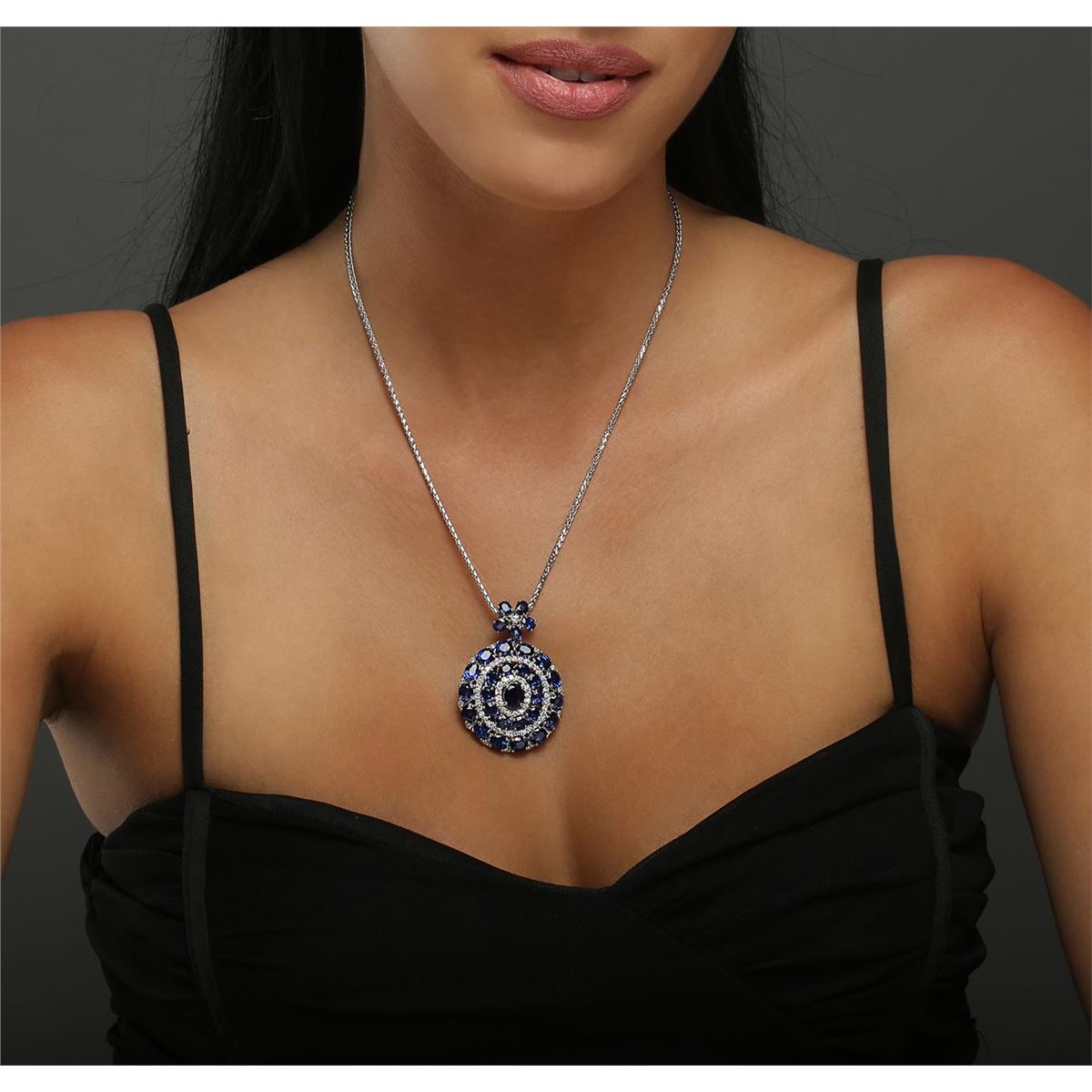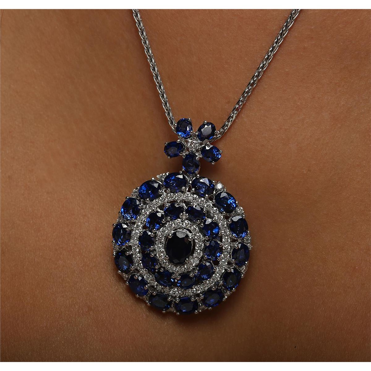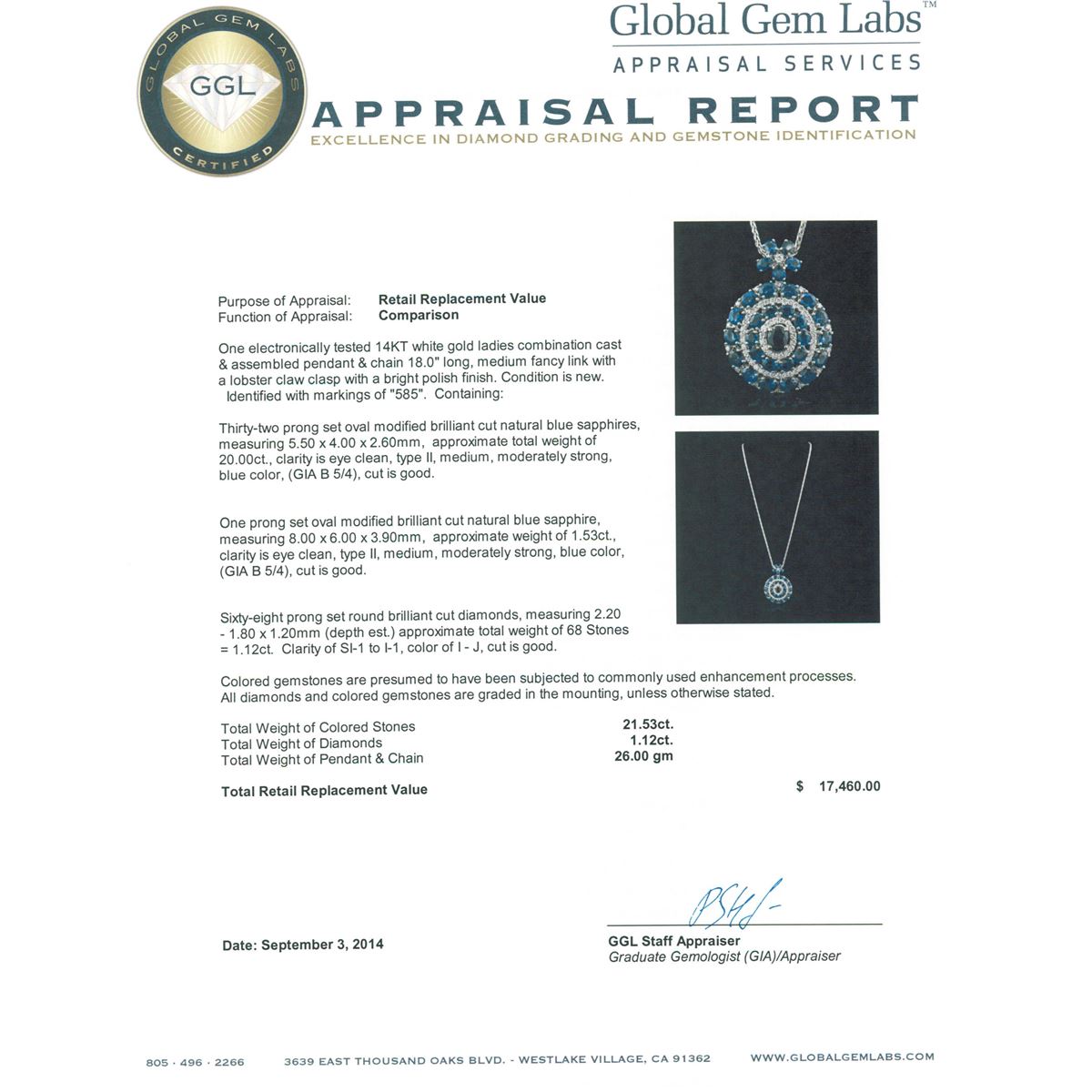 One electronically tested 14KT white gold ladies combination cast & assembled pendant & chain 18.0" long, medium fancy link with a lobster claw clasp with a bright polish finish. Identified with markings of "585". Condition is new. Containing: Thirty-two prong set oval modified brilliant cut natural blue sapphires, measuring 5.50 x 4.00 x 2.60mm, approximate total weight of 20.00ct., clarity is eye clean, type II, medium, moderately strong, blue color, (GIA B 5/4), cut is good. One prong set oval modified brilliant cut natural blue sapphire, measuring 8.00 x 6.00 x 3.90mm, approximate weight of 1.53ct., clarity is eye clean, type II, medium, moderately strong, blue color, (GIA B 5/4), cut is good. Sixty-Eight prong set round brilliant cut diamonds, measuring 2.20 - 1.80 x 1.20mm (depth est.) approximate total weight of 68 Stones = 1.12ct. Clarity: SI-1 to I-1. Color: I - J, Cut is Good. Colored gemstones are presumed to have been subjected to commonly used enhancement processes. All diamonds and colored gemstones are graded in the mounting, unless otherwise stated. Total Weight of Colored Stones 21.53ct. Total Weight of Diamonds 1.12ct. Total Weight of Pendant & Chain 26.00 grams. GGL Appraised at $17,460.00.