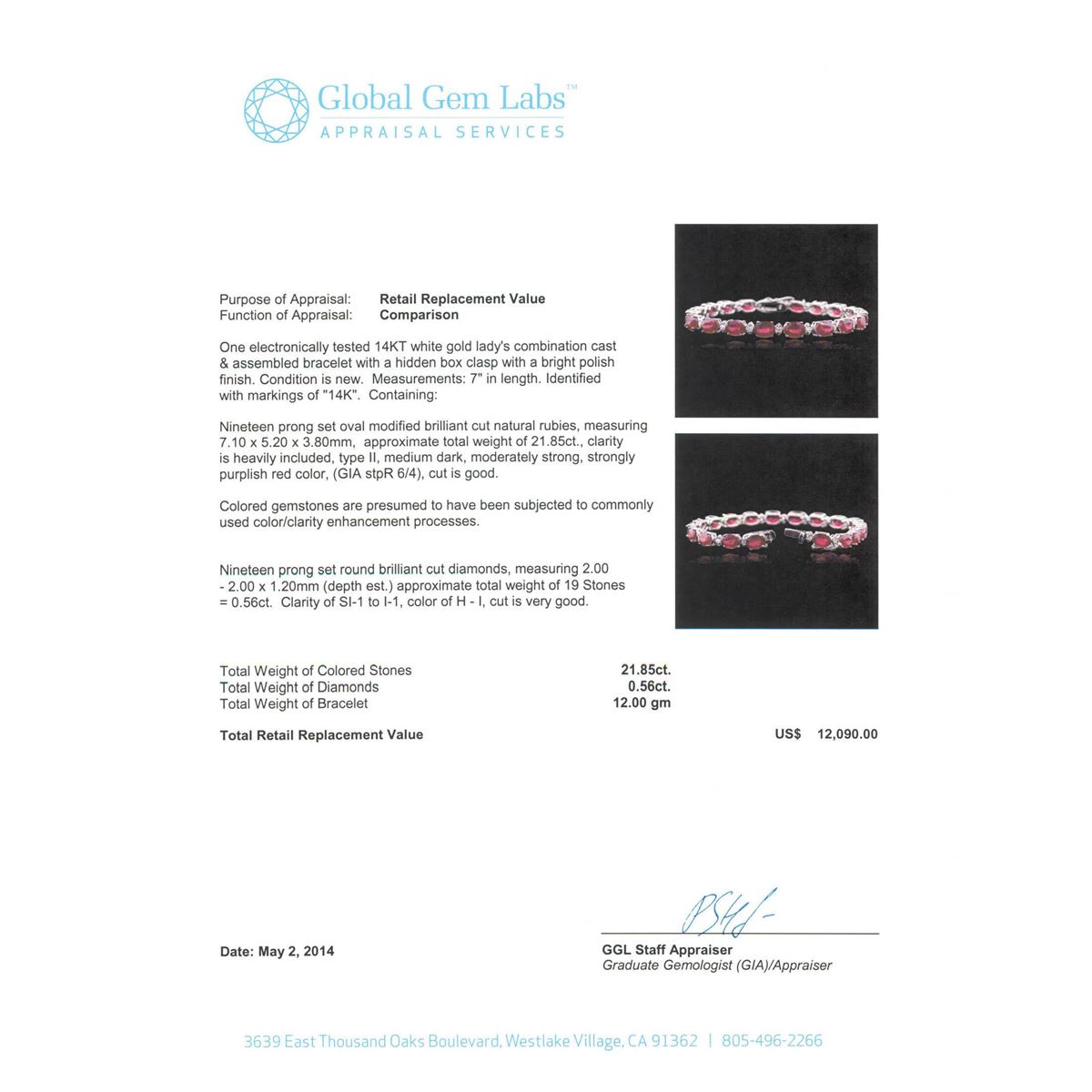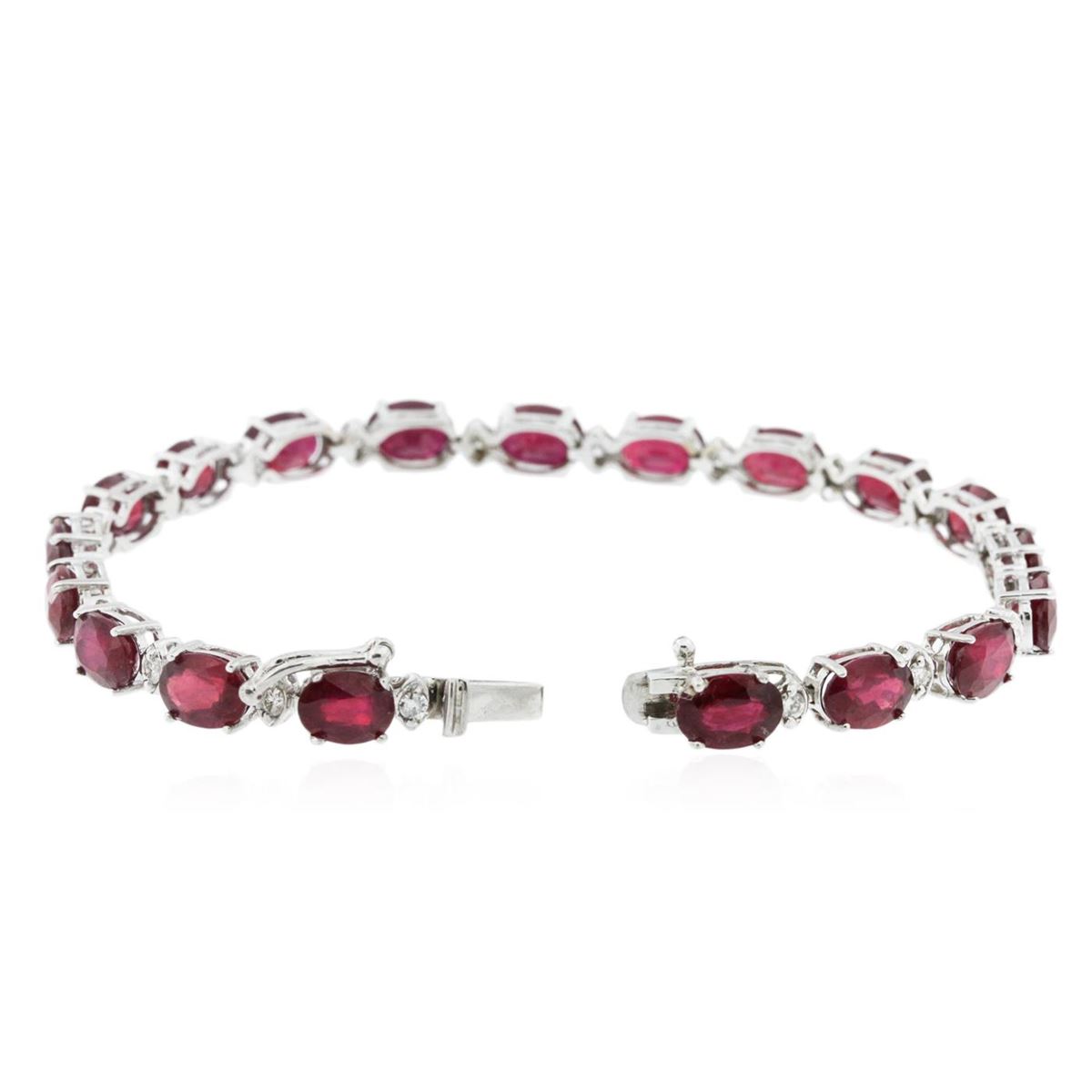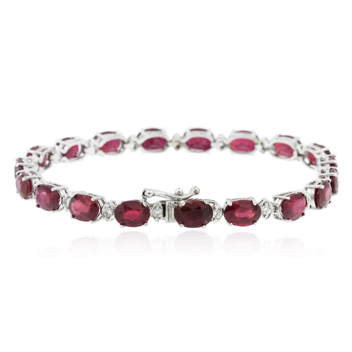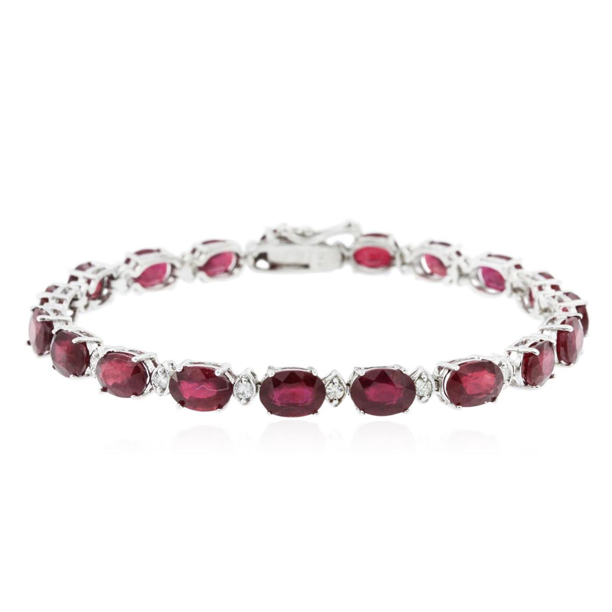 One electronically tested 14KT white gold Ladies combination cast & assembled bracelet with a hidden box clasp with a bright polish finish. Condition is new. Measurements: 7" in length. Identified with markings of "14K". Containing: Nineteen prong set oval modified brilliant cut natural rubies, measuring 7.10 x 5.20 x 3.80mm, approximate. Total Weight of 21.85ct., clarity is heavily included, type II, medium dark, moderately strong, strongly purplish red color, (GIA stpR 6/4), cut is good. Colored gemstones are presumed to have been subjected to commonly used color/clarity enhancement processes. Nineteen prong set round brilliant cut diamonds, measuring 2.00 - 2.00 x 1.20mm (depth est.) approximate. Total Weight of 19 Stones = 0.56ct. Clarity: SI-1 to I-1. Color: H - I, Cut is Very Good. Total Weight of Colored Stones 21.85ct. Total Weight of Diamonds 0.56ct. Total Weight of Bracelet 12.00 grams. GGL Appraised at $12,090.00.