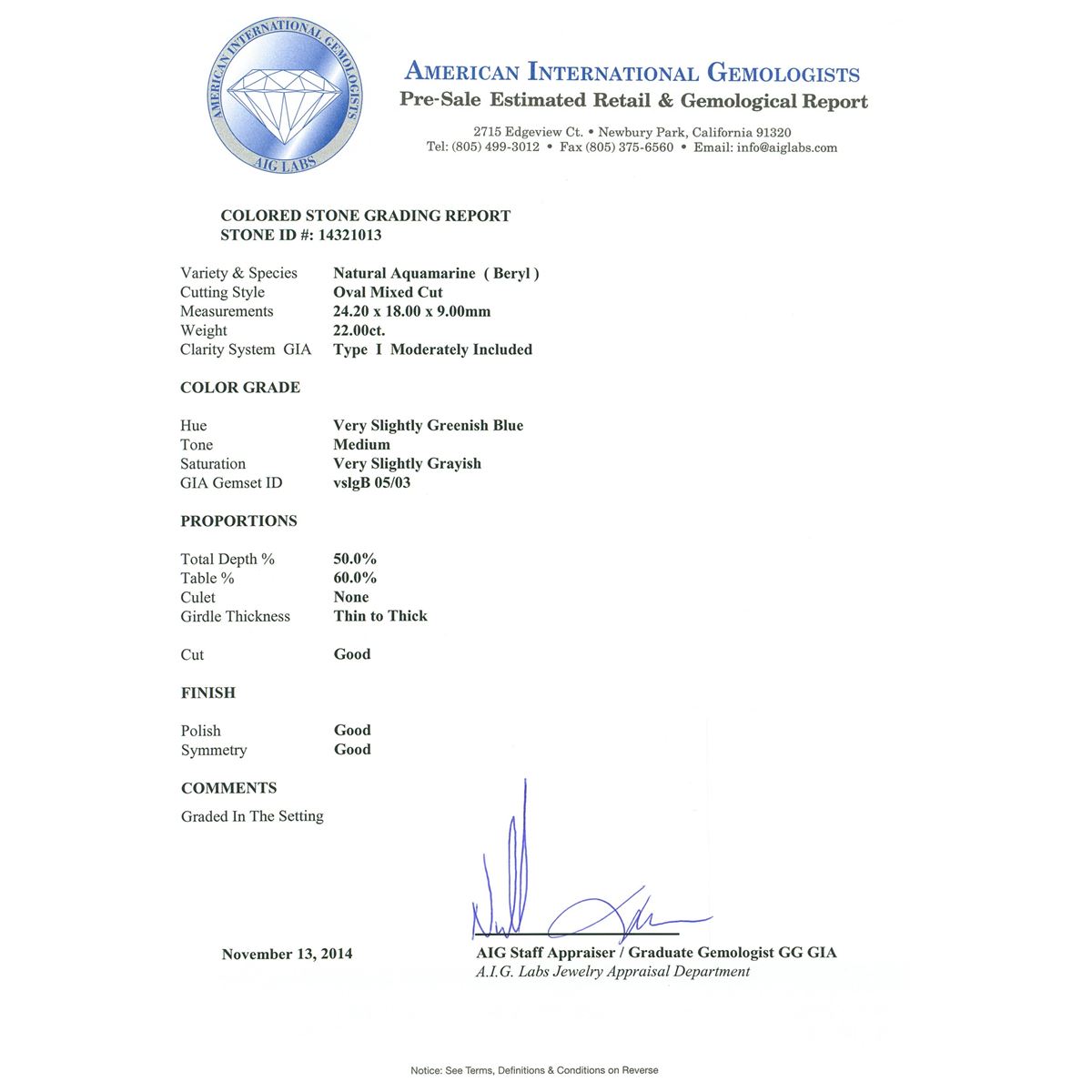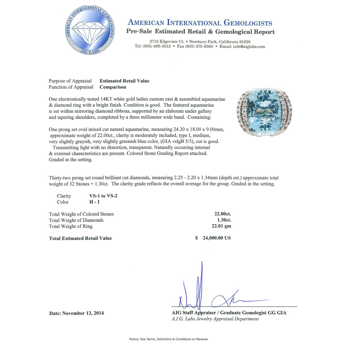 One electronically tested 14KT white gold ladies custom cast & assembled aquamarine & diamond ring with a bright finish. The featured aquamarine is set within mirroring diamond ribbons, supported by an elaborate under gallery and tapering shoulders, completed by a three millimeter wide band. Condition is good. Containing: One prong set oval mixed cut natural aquamarine, measuring 24.20 x 18.00 x 9.00mm, approximate weight of 22.00ct., clarity is moderately included, type I, medium, very slightly grayish, very slightly greenish blue color, (GIA vslgB 5/3), cut is good. Transmitting light with no distortion, transparent. Naturally occurring internal & external characteristics are present. Colored Stone Grading Report attached. Graded in the setting. Thirty-Two prong set round brilliant cut diamonds, measuring 2.25 - 2.20 x 1.34mm (depth est.) approximate total weight of 32 Stones = 1.30ct. The clarity grade reflects the overall average for the group. Graded in the setting. Clarity VS-1 to VS-2. Color H - I. Total Weight of Colored Stones 22.00ct. Total Weight of Diamonds 1.30ct. Total Weight of Ring 22.01 grams. AIG Appraised at $24,000.00.