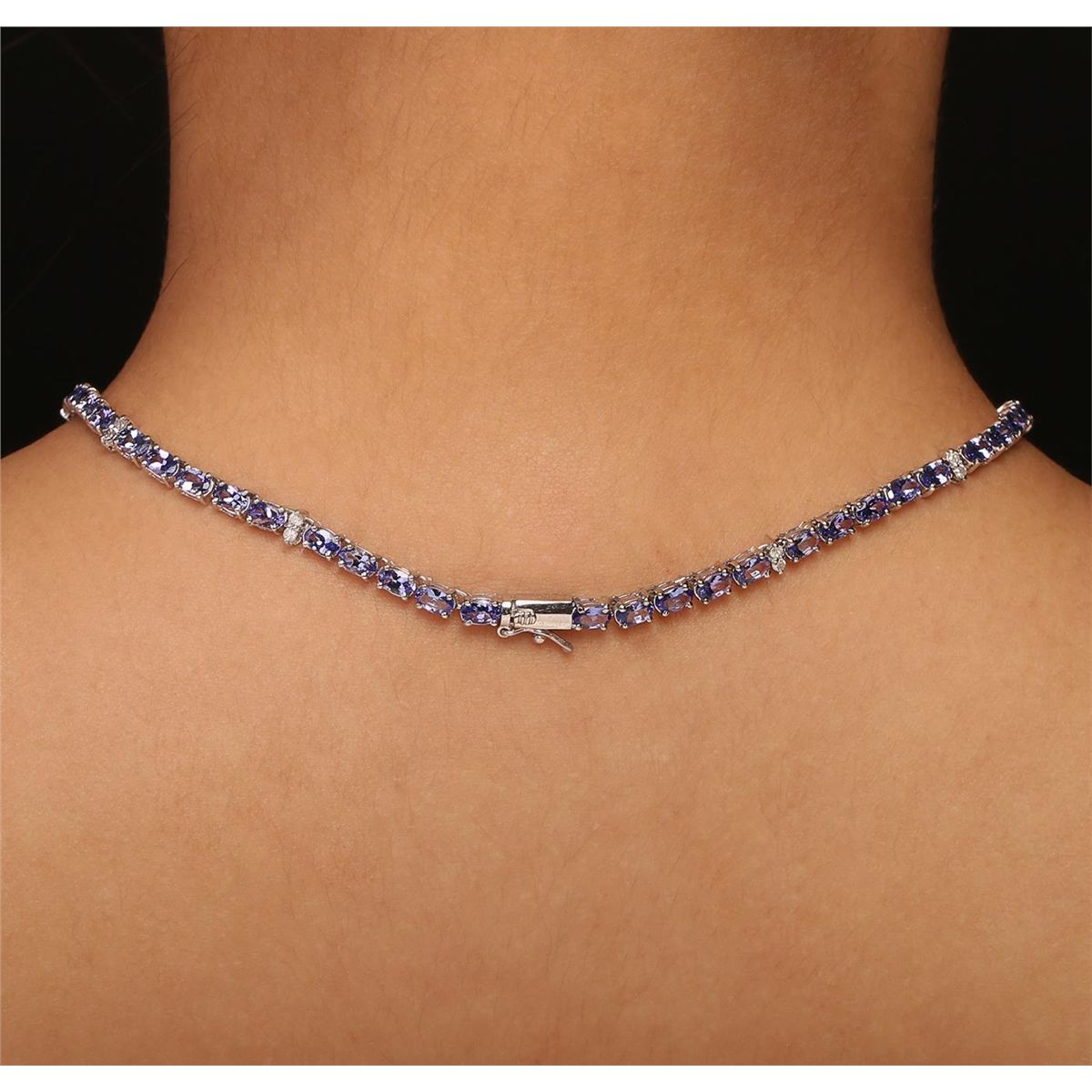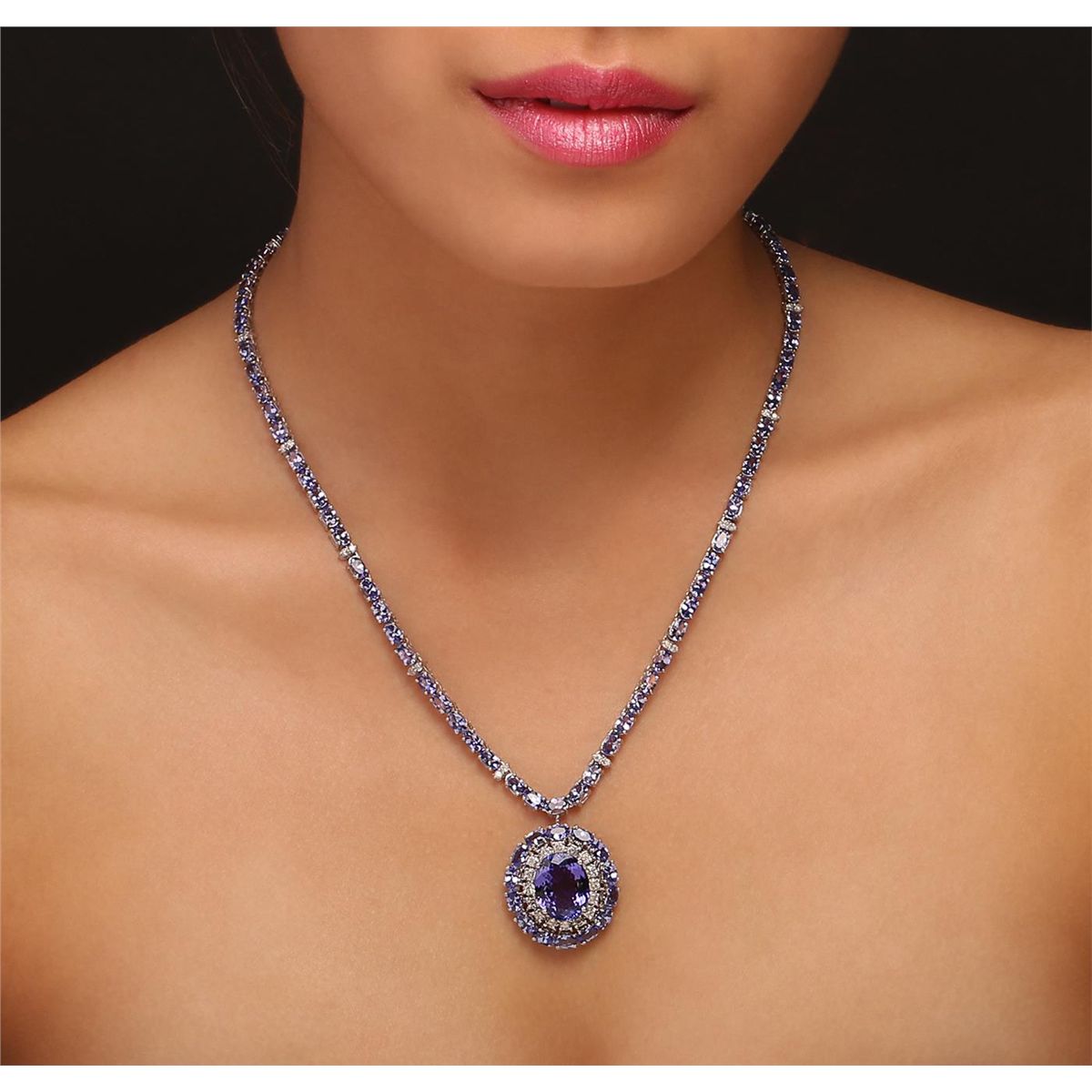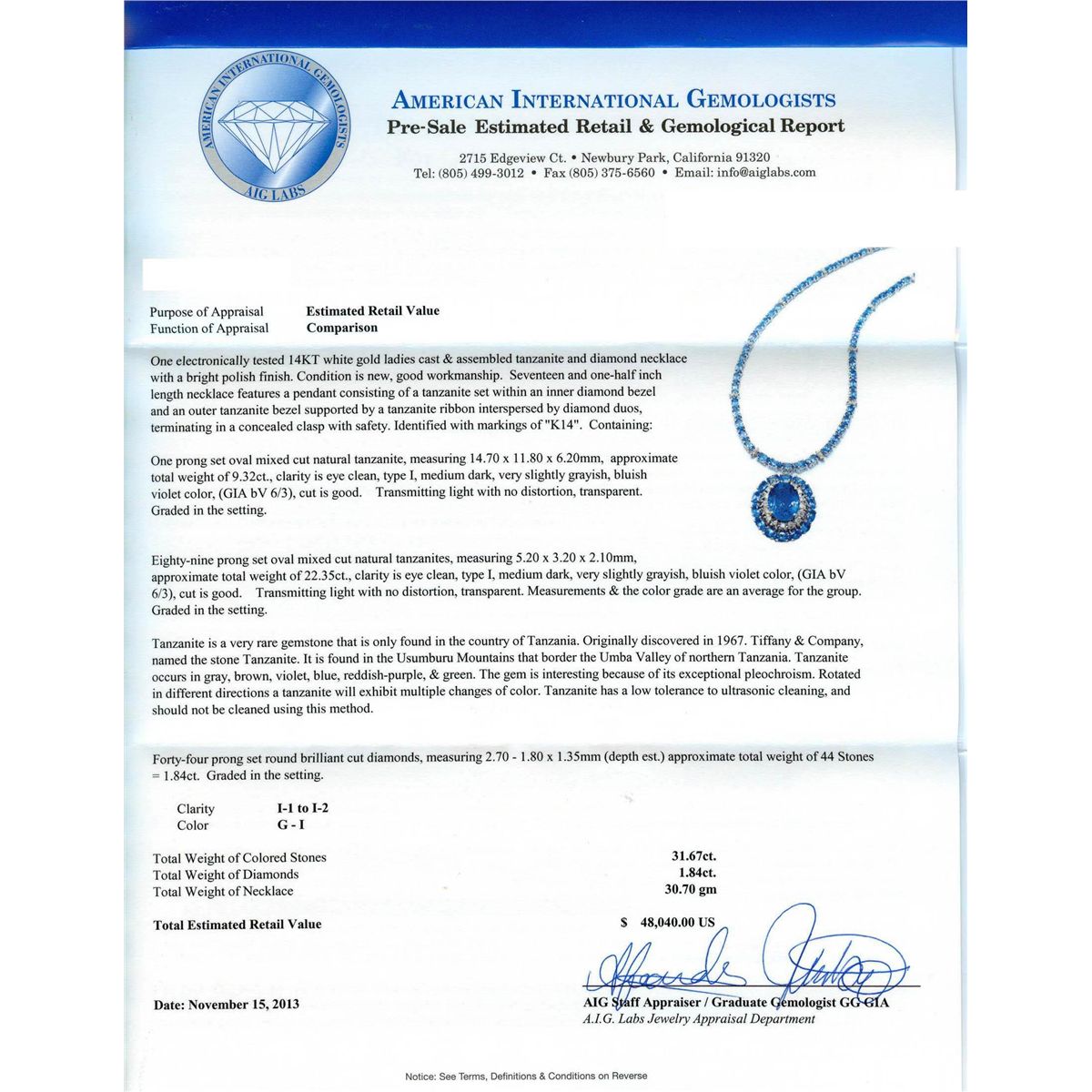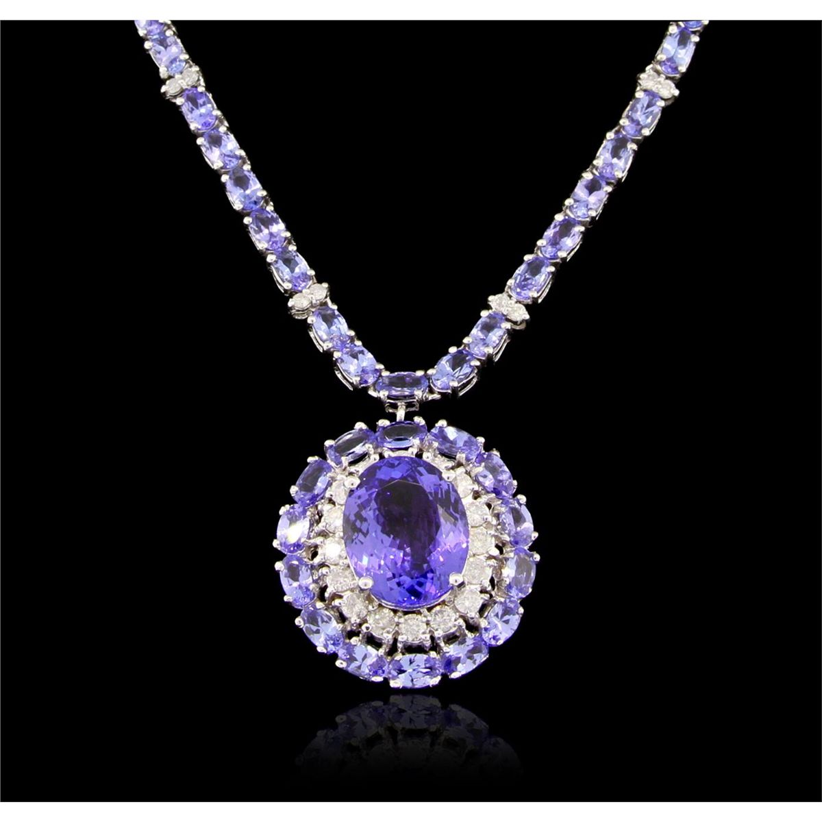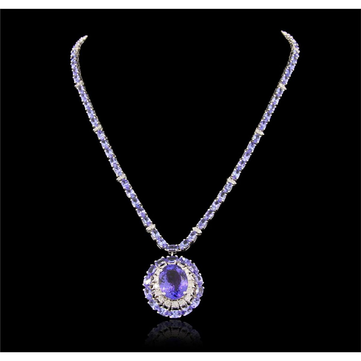 One electronically tested 14KT white gold ladies cast & assembled tanzanite and diamond necklace with a bright polish finish. Seventeen and one-half inch length necklace features a pendant consisting of a tanzanite set within an inner diamond bezel and an outer tanzanite bezel supported by a tanzanite ribbon interspersed by diamond duos, terminating in a concealed clasp with safety. Identified with markings of "K14". Condition is new, good workmanship. Containing: One prong set oval mixed cut natural tanzanite, measuring 14.70 x 11.80 x 6.20mm, approximate. Total Weight of 9.32ct., clarity is eye clean, type I, medium dark, very slightly grayish, bluish violet color, (GIA bV 6/3), cut is good. Transmitting light with no distortion, transparent. Graded in the setting. Eighty-nine prong set oval mixed cut natural tanzanites, measuring 5.20 x 3.20 x 2.10mm, approximate. Total Weight of 22.35ct., clarity is eye clean, type I, medium dark, very slightly grayish, bluish violet color, (GIA bV 6/3), cut is good. Transmitting light with no distortion, transparent. Measurements & the color grade are an average for the group. Graded in the setting. Tanzanite is a very rare gemstone that is only found in the country of Tanzania. Originally discovered in 1967. Tiffany & Company, named the stone Tanzanite. It is found in the Usumburu Mountains that border the Umba Valley of northern Tanzania. Tanzanite occurs in gray, brown, violet, blue, reddish-purple, & green. The gem is interesting because of its exceptional pleochroism. Rotated in different directions a tanzanite will exhibit multiple changes of color. Tanzanite has a low tolerance to ultrasonic cleaning, and should not be cleaned using this method. Forty-Four prong set round brilliant cut diamonds, measuring 2.70 - 1.80 x 1.35mm (depth est.) approximate. Total Weight of 44 Stones = 1.84ct. Graded in the setting. Clarity: I-1 to I-2. Color: G - I. Total Weight of Colored Stones 31.67ct.. Total Weight of Diamonds 1.84ct. AIG Appraised at $48,040.00.