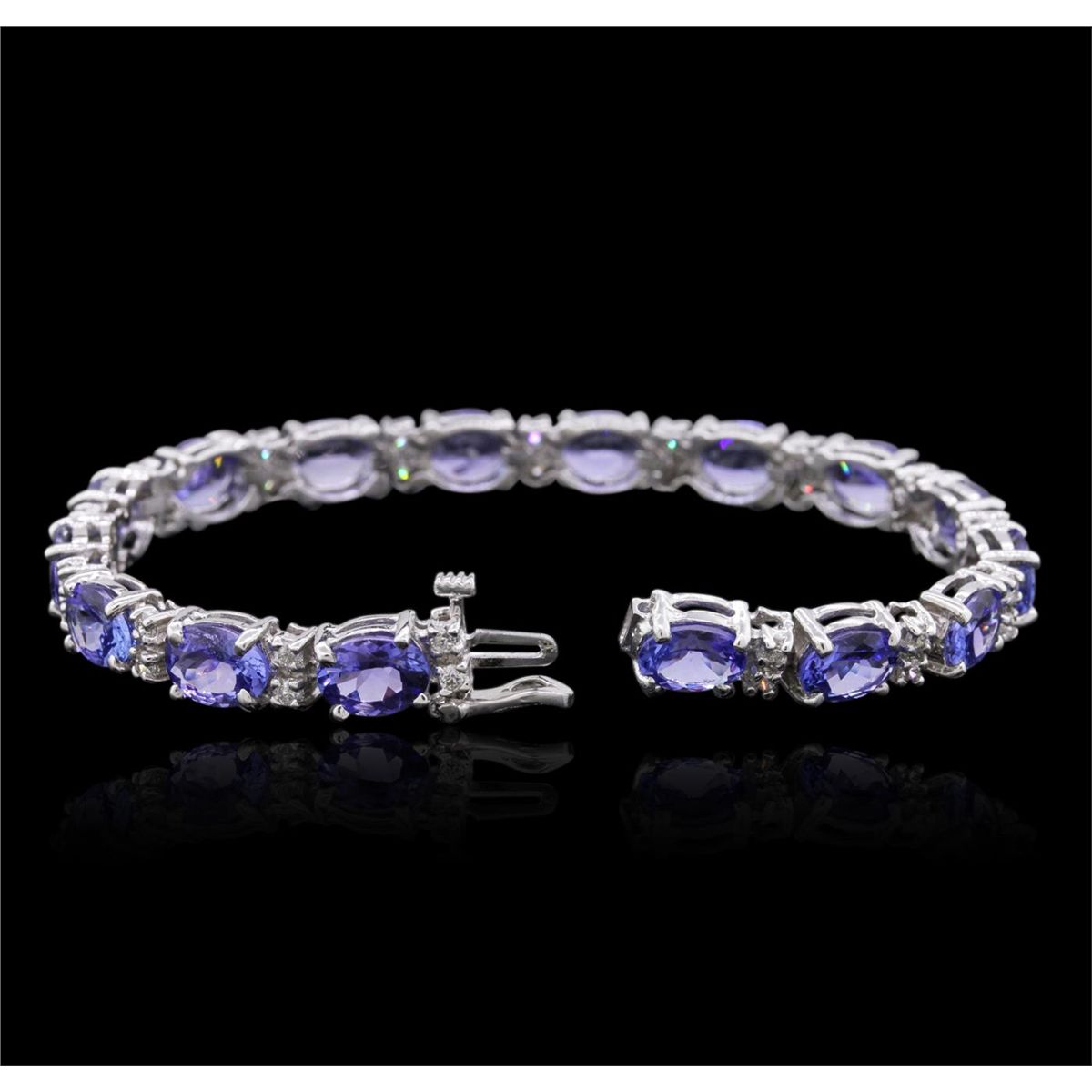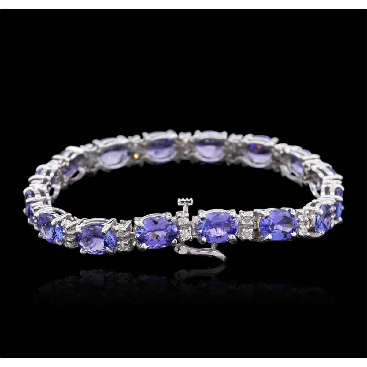 One electronically tested 14KT white gold ladies combination cast & assembled tanzanite and diamond bracelet with a hidden box clasp with a bright polish finish. Measurements: 7" in length. Identified with markings of "14K". Condition is new. Containing: Sixteen prong set oval modified brilliant cut natural tanzanites, measuring 8.05 x 6.03 x 4.22mm, approximate total weight of 22.40ct., clarity is eye clean, type I, medium, moderately strong, violet color, (GIA V 5/4), cut is good. Thirty-Two prong set round brilliant cut diamonds, measuring 2.00 - 2.00 x 1.20mm (depth est.) approximate total weight of 32 Stones = 0.93ct. Clarity: SI-2 to I-1. Color: I - J, Cut is Good. Colored gemstones are presumed to have been subjected to commonly used enhancement processes. All diamonds and colored gemstones are graded in the mounting, unless otherwise stated. Total Weight of Colored Stones 22.40ct. Total Weight of Diamonds 0.93ct. Total Weight of Bracelet 19.90 grams. GGL Appraised at $18,350.00.