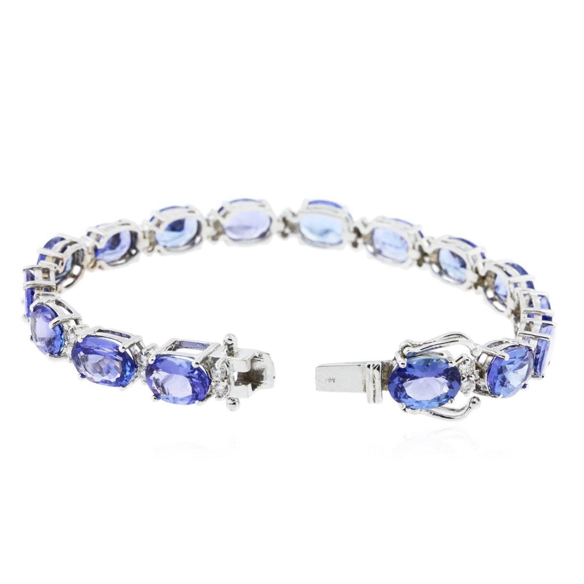 One electronically tested 14KT white gold Ladies combination cast & assembled bracelet with a hidden box clasp with a bright polish finish. Condition is new. Measurements: 7" in length. Identified with markings of "14K". Containing: Sixteen prong set oval modified brilliant cut natural tanzanites, measuring 8.80 x 6.70 x 3.50mm, approximate. Total Weight of 22.56ct., clarity is eye clean, type I, medium light, moderately strong, violet color, (GIA V 4/4), cut is very good. Colored gemstones are presumed to have been subjected to commonly used color/clarity enhancement processes. Thirty-Two prong set round brilliant cut diamonds, measuring 2.00 - 2.00 x 1.20mm (depth est.) approximate. Total Weight of 32 Stones = 1.00ct. Clarity: SI-2 to I-1. Color: H - I, Cut is Very Good. Total Weight of Colored Stones 22.56ct. Total Weight of Diamonds 1.00ct. Total Weight of Bracelet 18.60 grams. GGL Appraised at $39,195.00.