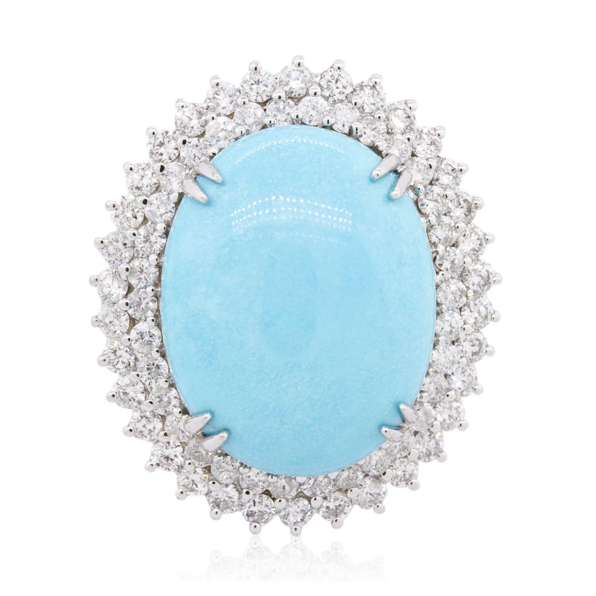One electronically tested 14KT white gold ladies combination cast & assembled turquoise and diamond ring with a bright polish finish. Identified with markings of "K14". Condition is new. Containing: One prong set oval cabochon cut natural turquoise, measuring 24.25 x 19.00 x 6.70mm, approximate weight of 23.00ct., clarity is severely included, light, very slightly grayish, blue color, (GIA B 3/3), cut is good. Sixty-Eight prong set round brilliant cut diamonds, measuring 2.20 - 2.00 x 1.26mm (depth est.) approximate total weight of 68 Stones = 2.31ct. Clarity: SI-2 to I-1. Color: I - J, Cut is Good. Colored gemstones are presumed to have been subjected to commonly used enhancement processes. All diamonds and colored gemstones are graded in the mounting, unless otherwise stated. Total Weight of Colored Stones 23.00ct. Total Weight of Diamonds 2.31ct. Total Weight of Ring 18.70 grams. GGL Appraised at $7,285.00.
