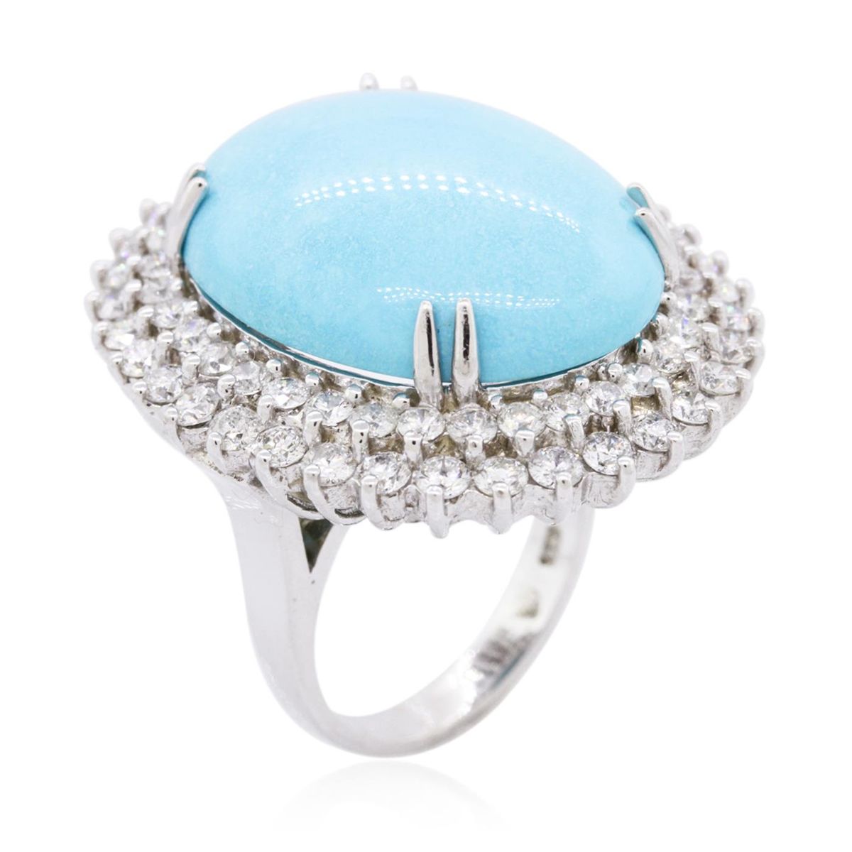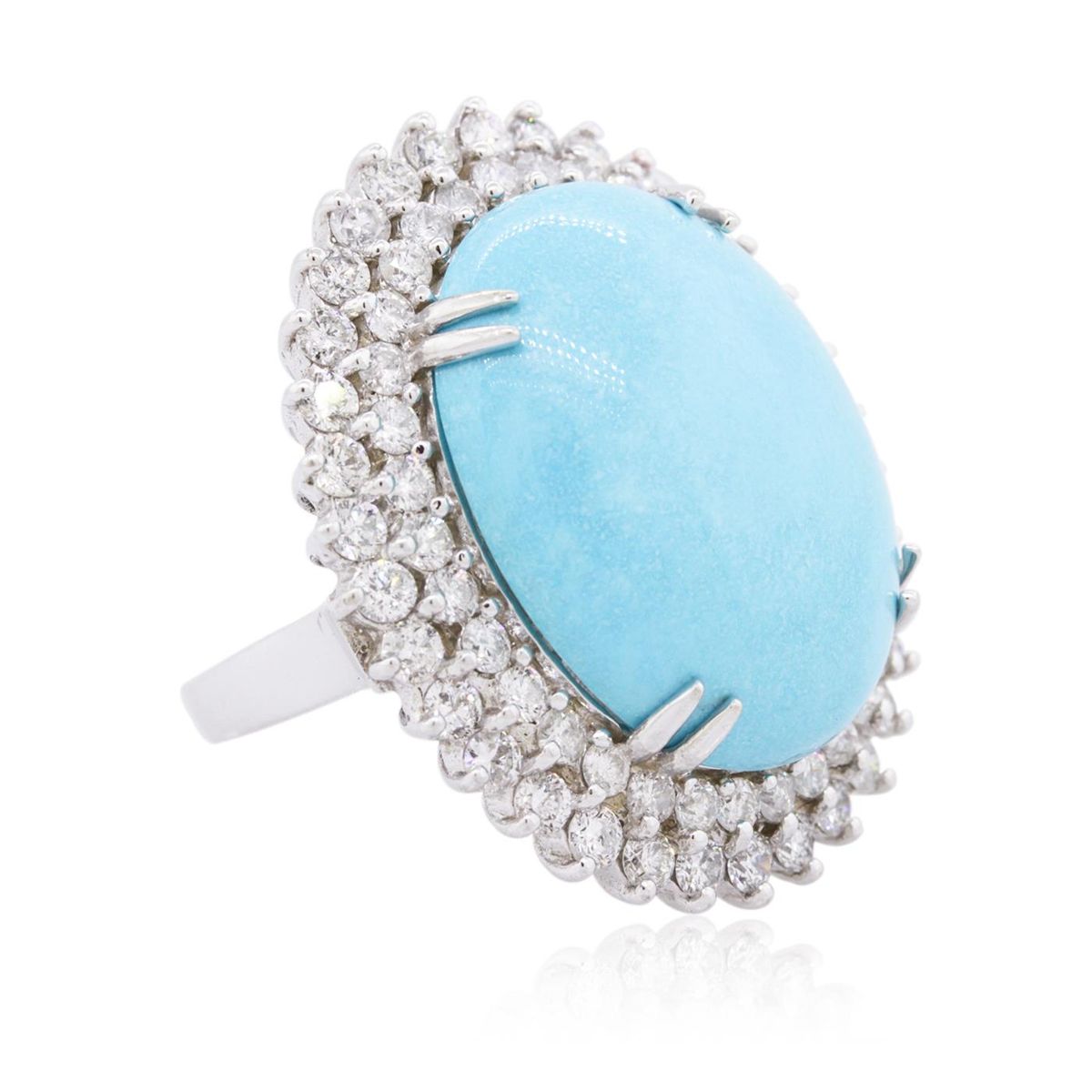 One electronically tested 14KT white gold ladies combination cast & assembled turquoise and diamond ring with a bright polish finish. Identified with markings of "K14". Condition is new. Containing: One prong set oval cabochon cut natural turquoise, measuring 24.25 x 19.00 x 6.70mm, approximate weight of 23.00ct., clarity is severely included, light, very slightly grayish, blue color, (GIA B 3/3), cut is good. Sixty-Eight prong set round brilliant cut diamonds, measuring 2.20 - 2.00 x 1.26mm (depth est.) approximate total weight of 68 Stones = 2.31ct. Clarity: SI-2 to I-1. Color: I - J, Cut is Good. Colored gemstones are presumed to have been subjected to commonly used enhancement processes. All diamonds and colored gemstones are graded in the mounting, unless otherwise stated. Total Weight of Colored Stones 23.00ct. Total Weight of Diamonds 2.31ct. Total Weight of Ring 18.70 grams. GGL Appraised at $7,285.00.