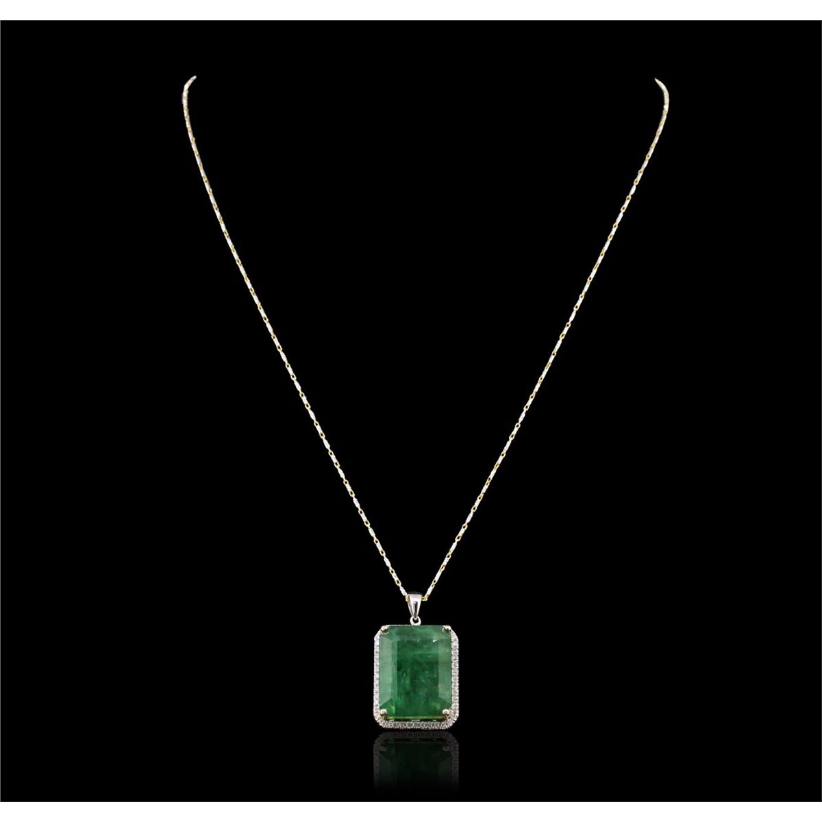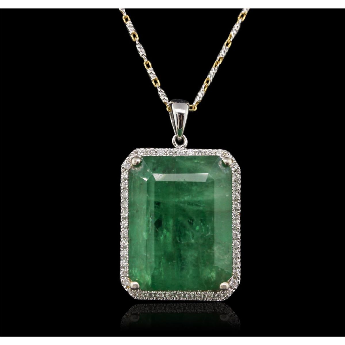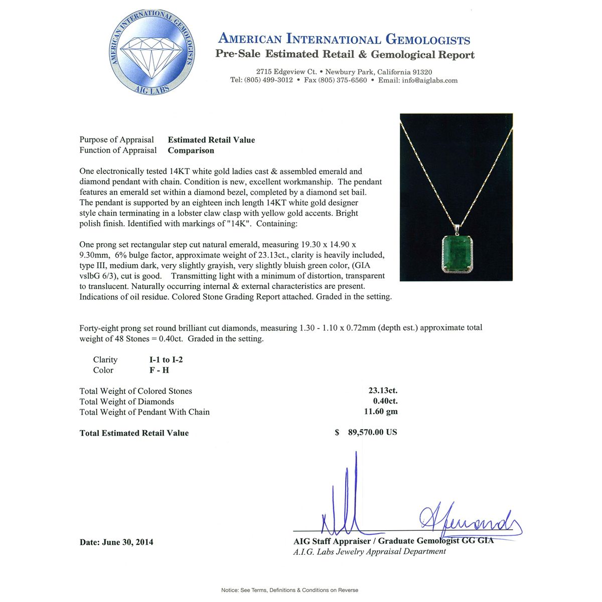 One electronically tested 14KT white gold ladies cast & assembled emerald and diamond pendant with chain. Condition is new, excellent workmanship. The pendant features an emerald set within a diamond bezel, completed by a diamond set bail. The pendant is supported by an eighteen inch length 14KT white gold designer style chain terminating in a lobster claw clasp with yellow gold accents. Bright polish finish. Identified with markings of "14K". Containing: One prong set rectangular step cut natural emerald, measuring 19.30 x 14.90 x 9.30mm, 6%. bulge factor, approximate weight of 23.13ct., clarity is heavily included, type III, medium dark, very slightly grayish, very slightly bluish green color, (GIA vslbG 6/3), cut is good. Transmitting light with a minimum of distortion, transparent to translucent. Naturally occurring internal & external characteristics are present. Indications of oil residue. Colored Stone Grading Report attached. Graded in the setting. Forty-Eight prong set round brilliant cut diamonds, measuring 1.30 - 1.10 x 0.72mm (depth est.) approximate. Total Weight of 48 Stones = 0.40ct. Graded in the setting. Clarity: I-1 to I-2. Color: F - H. Total Weight of Colored Stones 23.13ct. Total Weight of Diamonds 0.40ct. Total Weight of Pendant With Chain 11.60 grams. AIG Appraised at $89,570.00.