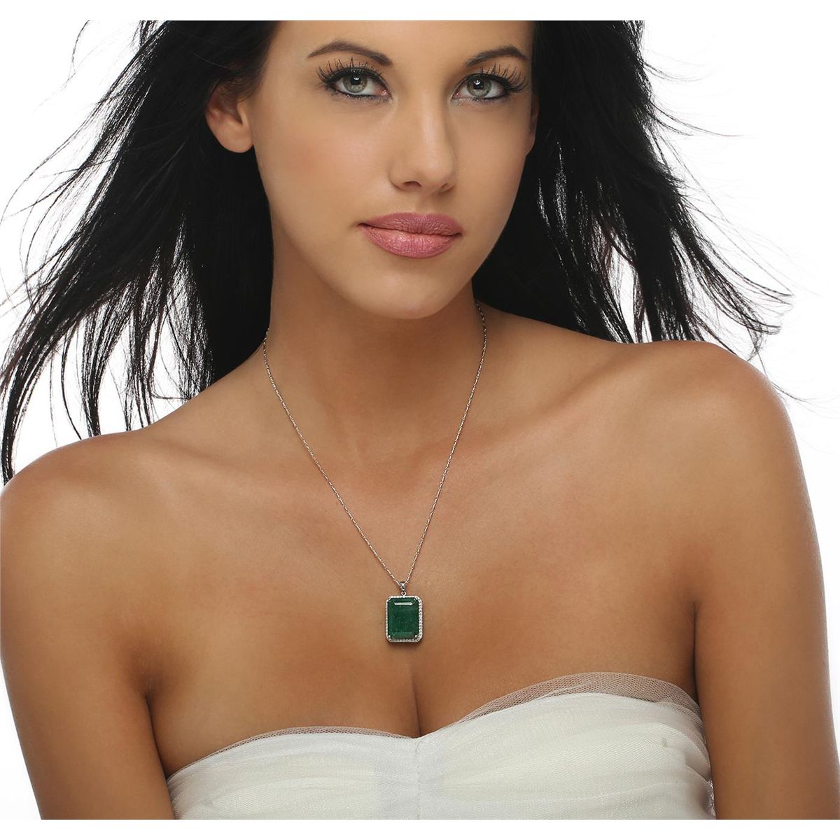 One electronically tested 14KT white gold ladies cast & assembled emerald and diamond pendant with chain. Condition is new, excellent workmanship. The pendant features an emerald set within a diamond bezel, completed by a diamond set bail. The pendant is supported by an eighteen inch length 14KT white gold designer style chain terminating in a lobster claw clasp with yellow gold accents. Bright polish finish. Identified with markings of "14K". Containing: One prong set rectangular step cut natural emerald, measuring 19.30 x 14.90 x 9.30mm, 6%. bulge factor, approximate weight of 23.13ct., clarity is heavily included, type III, medium dark, very slightly grayish, very slightly bluish green color, (GIA vslbG 6/3), cut is good. Transmitting light with a minimum of distortion, transparent to translucent. Naturally occurring internal & external characteristics are present. Indications of oil residue. Colored Stone Grading Report attached. Graded in the setting. Forty-Eight prong set round brilliant cut diamonds, measuring 1.30 - 1.10 x 0.72mm (depth est.) approximate. Total Weight of 48 Stones = 0.40ct. Graded in the setting. Clarity: I-1 to I-2. Color: F - H. Total Weight of Colored Stones 23.13ct. Total Weight of Diamonds 0.40ct. Total Weight of Pendant With Chain 11.60 grams. AIG Appraised at $89,570.00.