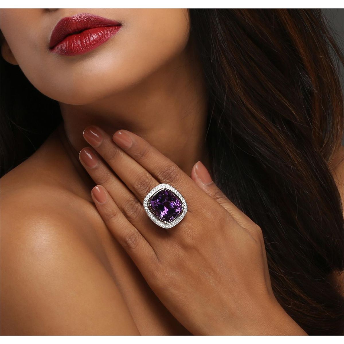 One electronically tested 14KT white gold ladies combination cast & assembled ring with a bright polish finish. Identified with markings of "14KT". Condition is new. Containing: One prong set rectangular cushion modified brilliant cut natural amethyst, measuring 20.00 x 16.50 x 11.50mm, approximate weight of 23.72ct., clarity is eye clean, type II, medium, moderately strong, purple color, (GIA P 5/4), cut is good. One Hundred Ten prong set round brilliant cut diamonds, measuring 1.60 - 1.60 x 0.96mm (depth est.) stated. Total Weight of 110 Stones = 1.64ct. Clarity: SI-1 to SI-2. Color: H - I, Cut is Good. Colored gemstones are presumed to have been subjected to commonly used enhancement processes. All diamonds and colored gemstones are graded in the mounting, unless otherwise stated. Total Weight of Colored Stones 23.72ct. Total Weight of Diamonds 1.64ct. Total Weight of Ring 14.50 grams. GGL Appraised at $10,155.00.