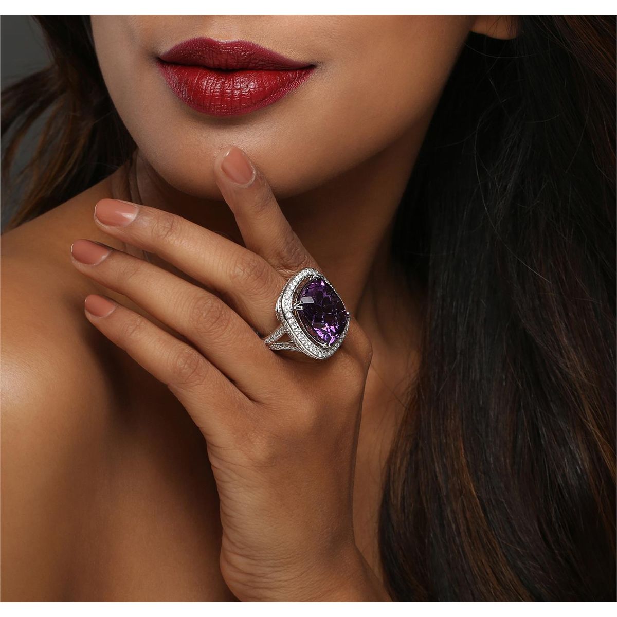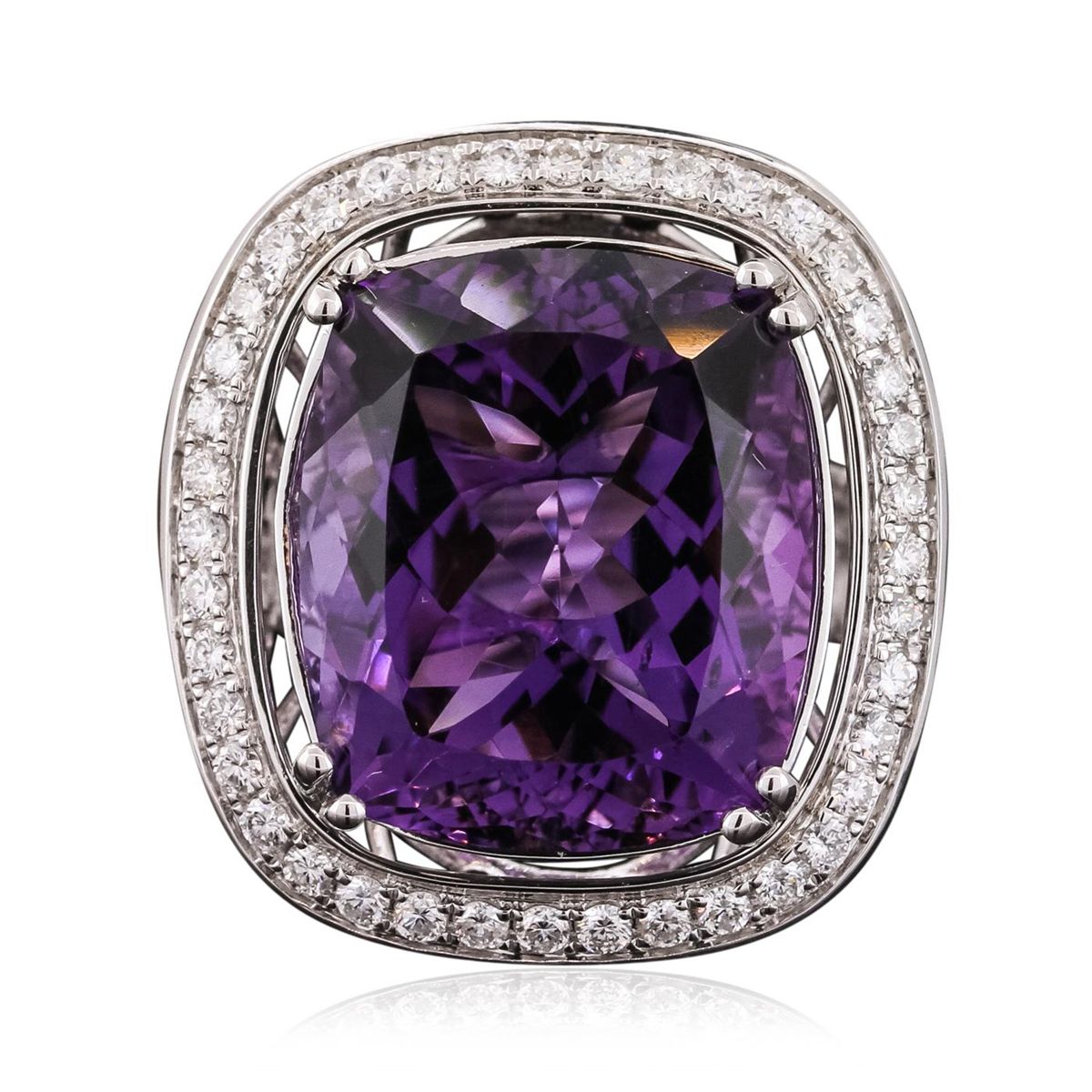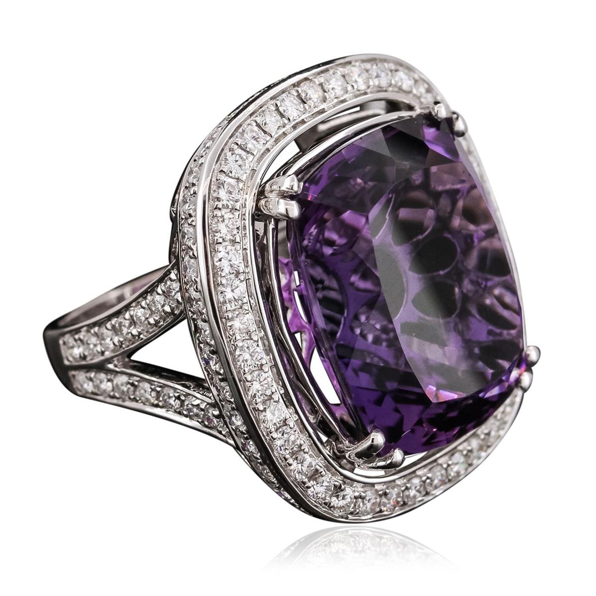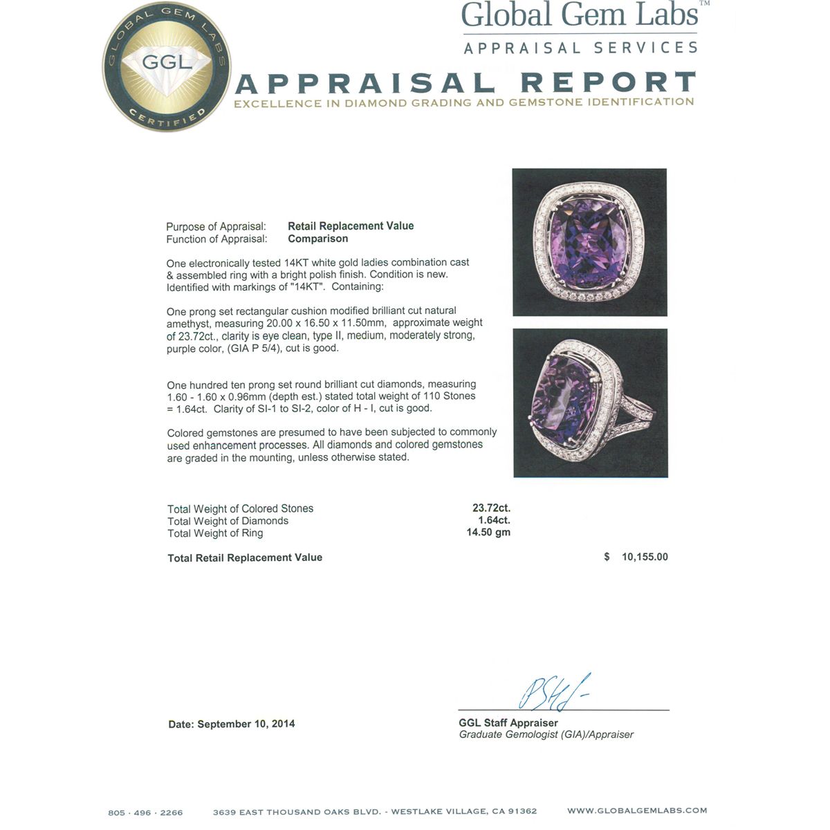 One electronically tested 14KT white gold ladies combination cast & assembled ring with a bright polish finish. Identified with markings of "14KT". Condition is new. Containing: One prong set rectangular cushion modified brilliant cut natural amethyst, measuring 20.00 x 16.50 x 11.50mm, approximate weight of 23.72ct., clarity is eye clean, type II, medium, moderately strong, purple color, (GIA P 5/4), cut is good. One Hundred Ten prong set round brilliant cut diamonds, measuring 1.60 - 1.60 x 0.96mm (depth est.) stated. Total Weight of 110 Stones = 1.64ct. Clarity: SI-1 to SI-2. Color: H - I, Cut is Good. Colored gemstones are presumed to have been subjected to commonly used enhancement processes. All diamonds and colored gemstones are graded in the mounting, unless otherwise stated. Total Weight of Colored Stones 23.72ct. Total Weight of Diamonds 1.64ct. Total Weight of Ring 14.50 grams. GGL Appraised at $10,155.00.