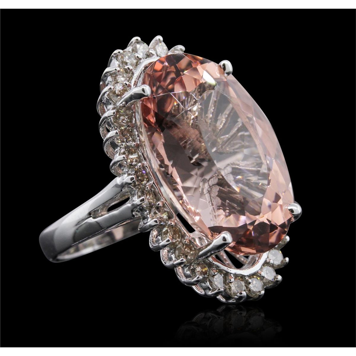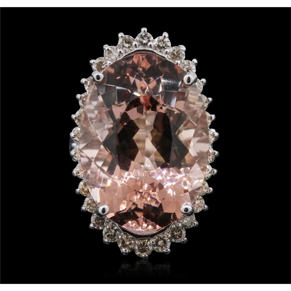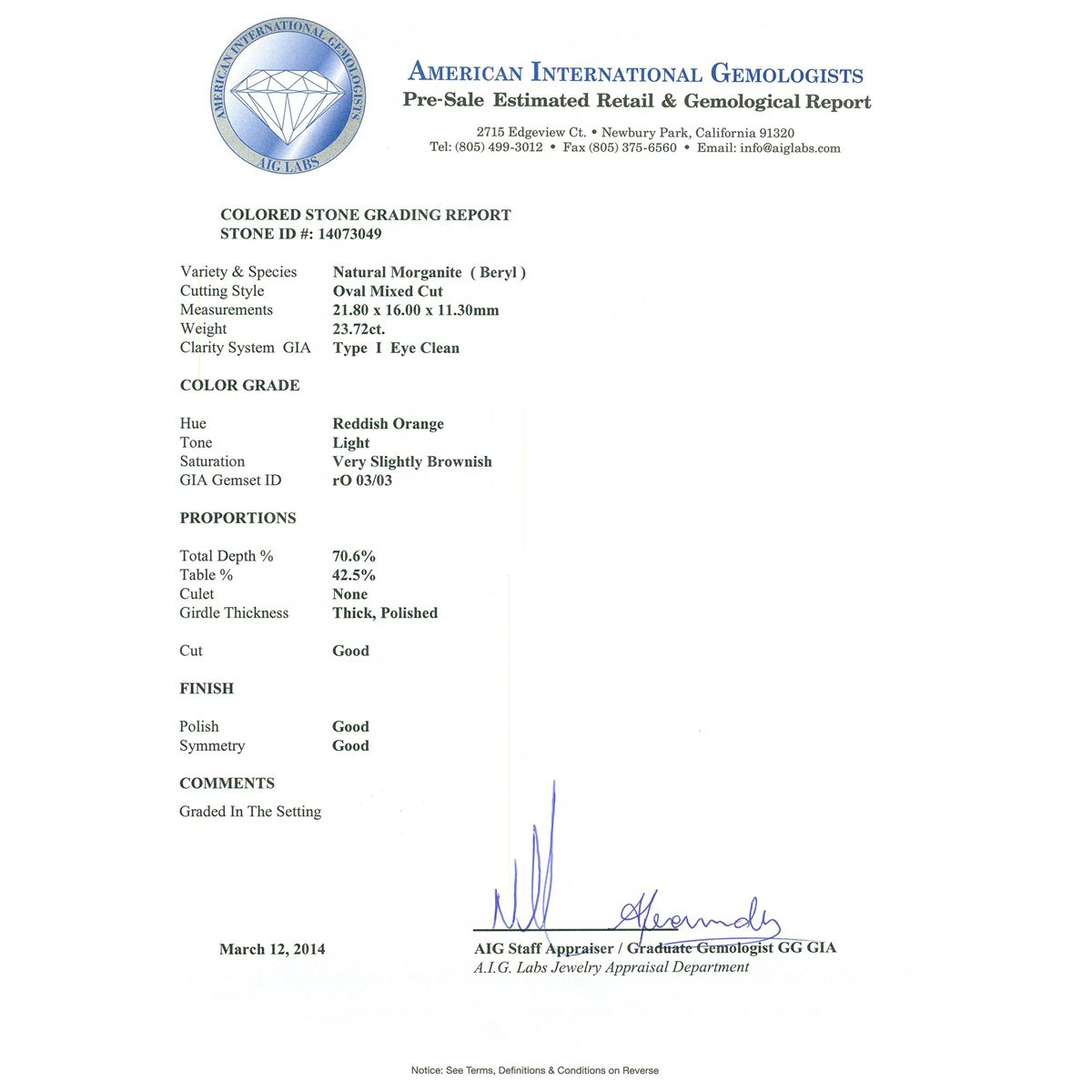 One electronically tested 14KT white gold ladies cast morganite and diamond ring with a bright polish finish. Condition is new, good workmanship. The featured morganite is set within a diamond bezel, supported by split shoulders and completed by a three millimeter wide band. Identified with markings of "14K". Containing: One prong set oval mixed cut natural morganite, measuring 21.80 x 16.00 x 11.30mm, 8%. bulge factor, approximate weight of 23.72ct., clarity is eye clean, type I, light, very slightly brownish, reddish orange color, (GIA rO 3/3), cut is good. Transmitting light with no distortion, transparent. Colored Stone Grading Report attached. Graded in the setting. Thirty prong set round brilliant cut diamonds, measuring 2.10 - 2.10 x 1.26mm (depth est.) approximate. Total Weight of 30 Stones = 1.11ct. Graded in the setting. Clarity: SI-2 to I-1. Total Weight of Colored Stones 23.72ct. Total Weight of Diamonds 1.11ct. Total Weight of Ring 11.80 grams. AIG Appraised at $19,755.00.