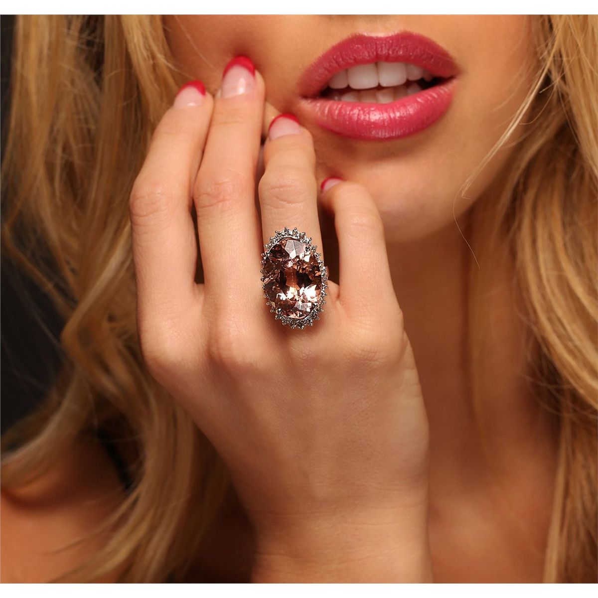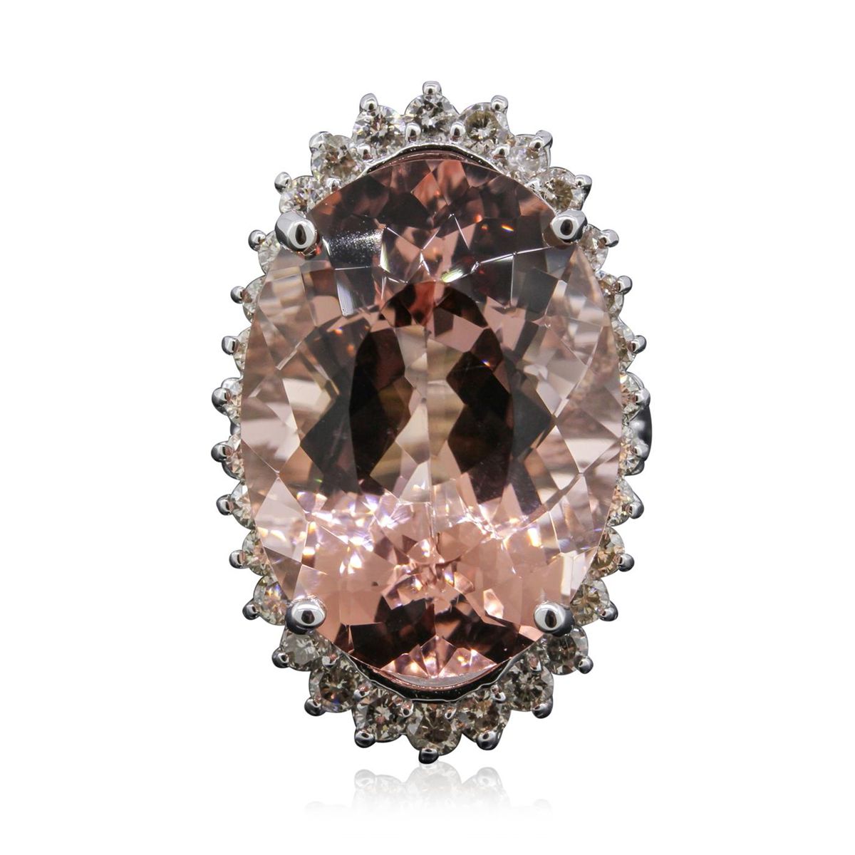 One electronically tested 14KT white gold ladies cast morganite and diamond ring with a bright polish finish. Condition is new, good workmanship. The featured morganite is set within a diamond bezel, supported by split shoulders and completed by a three millimeter wide band. Identified with markings of "14K". Containing: One prong set oval mixed cut natural morganite, measuring 21.80 x 16.00 x 11.30mm, 8%. bulge factor, approximate weight of 23.72ct., clarity is eye clean, type I, light, very slightly brownish, reddish orange color, (GIA rO 3/3), cut is good. Transmitting light with no distortion, transparent. Colored Stone Grading Report attached. Graded in the setting. Thirty prong set round brilliant cut diamonds, measuring 2.10 - 2.10 x 1.26mm (depth est.) approximate. Total Weight of 30 Stones = 1.11ct. Graded in the setting. Clarity: SI-2 to I-1. Total Weight of Colored Stones 23.72ct. Total Weight of Diamonds 1.11ct. Total Weight of Ring 11.80 grams. AIG Appraised at $19,755.00.
