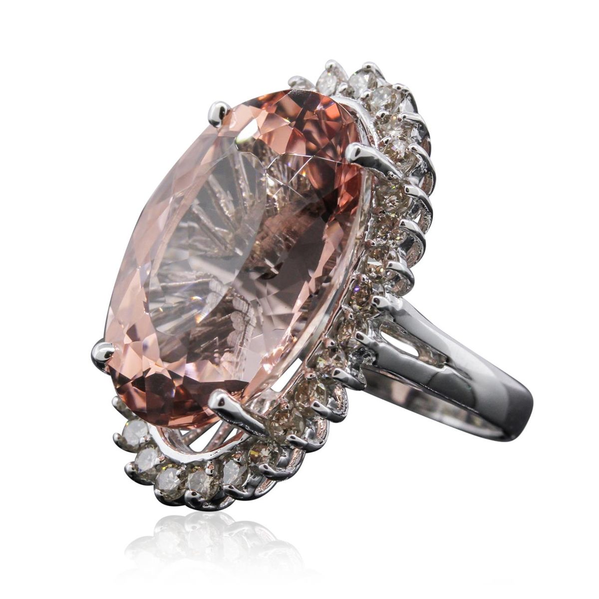One electronically tested 14KT white gold ladies cast morganite and diamond ring with a bright polish finish. Condition is new, good workmanship. The featured morganite is set within a diamond bezel, supported by split shoulders and completed by a three millimeter wide band. Identified with markings of "14K". Containing: One prong set oval mixed cut natural morganite, measuring 21.80 x 16.00 x 11.30mm, 8%. bulge factor, approximate weight of 23.72ct., clarity is eye clean, type I, light, very slightly brownish, reddish orange color, (GIA rO 3/3), cut is good. Transmitting light with no distortion, transparent. Colored Stone Grading Report attached. Graded in the setting. Thirty prong set round brilliant cut diamonds, measuring 2.10 - 2.10 x 1.26mm (depth est.) approximate. Total Weight of 30 Stones = 1.11ct. Graded in the setting. Clarity: SI-2 to I-1. Total Weight of Colored Stones 23.72ct. Total Weight of Diamonds 1.11ct. Total Weight of Ring 11.80 grams. AIG Appraised at $19,755.00.