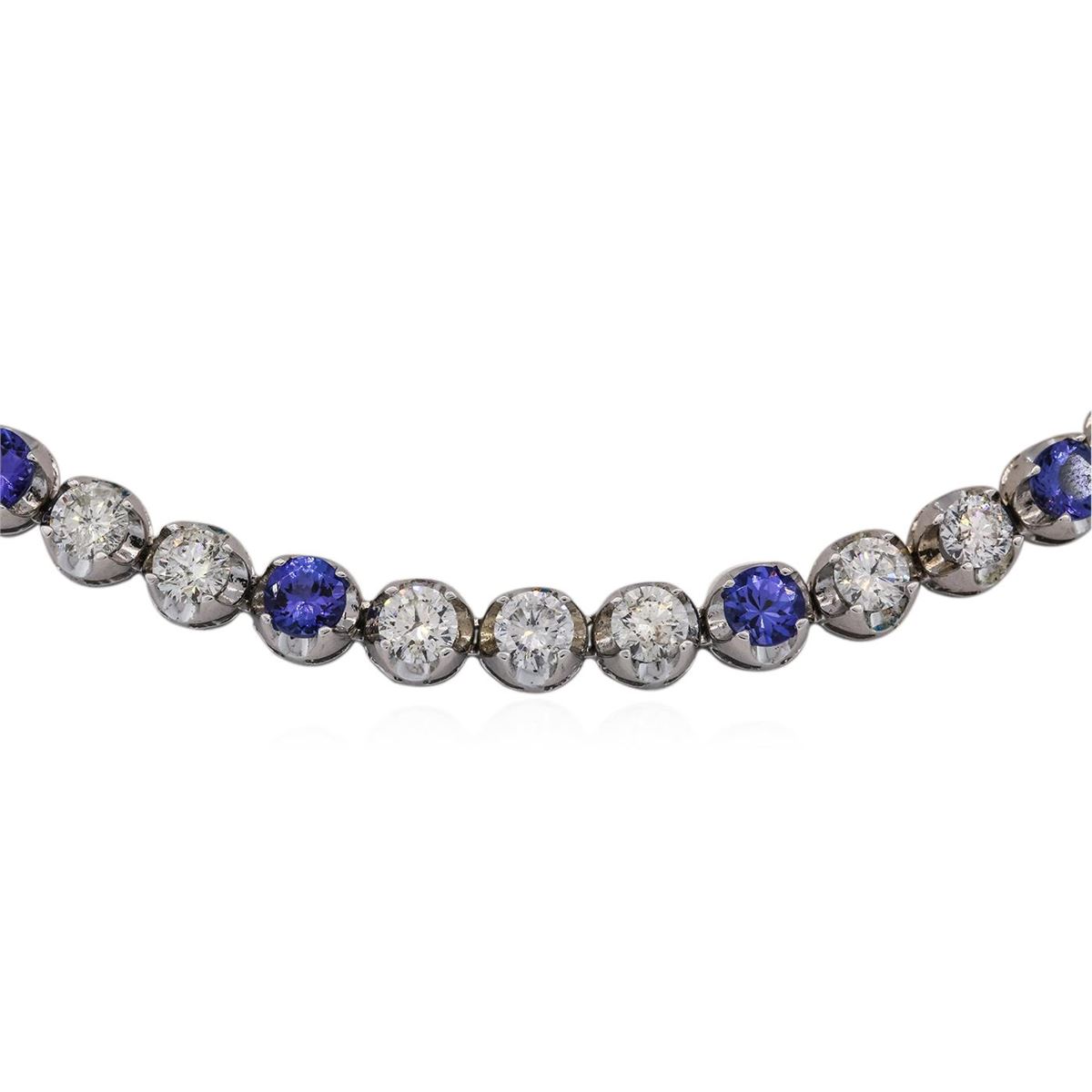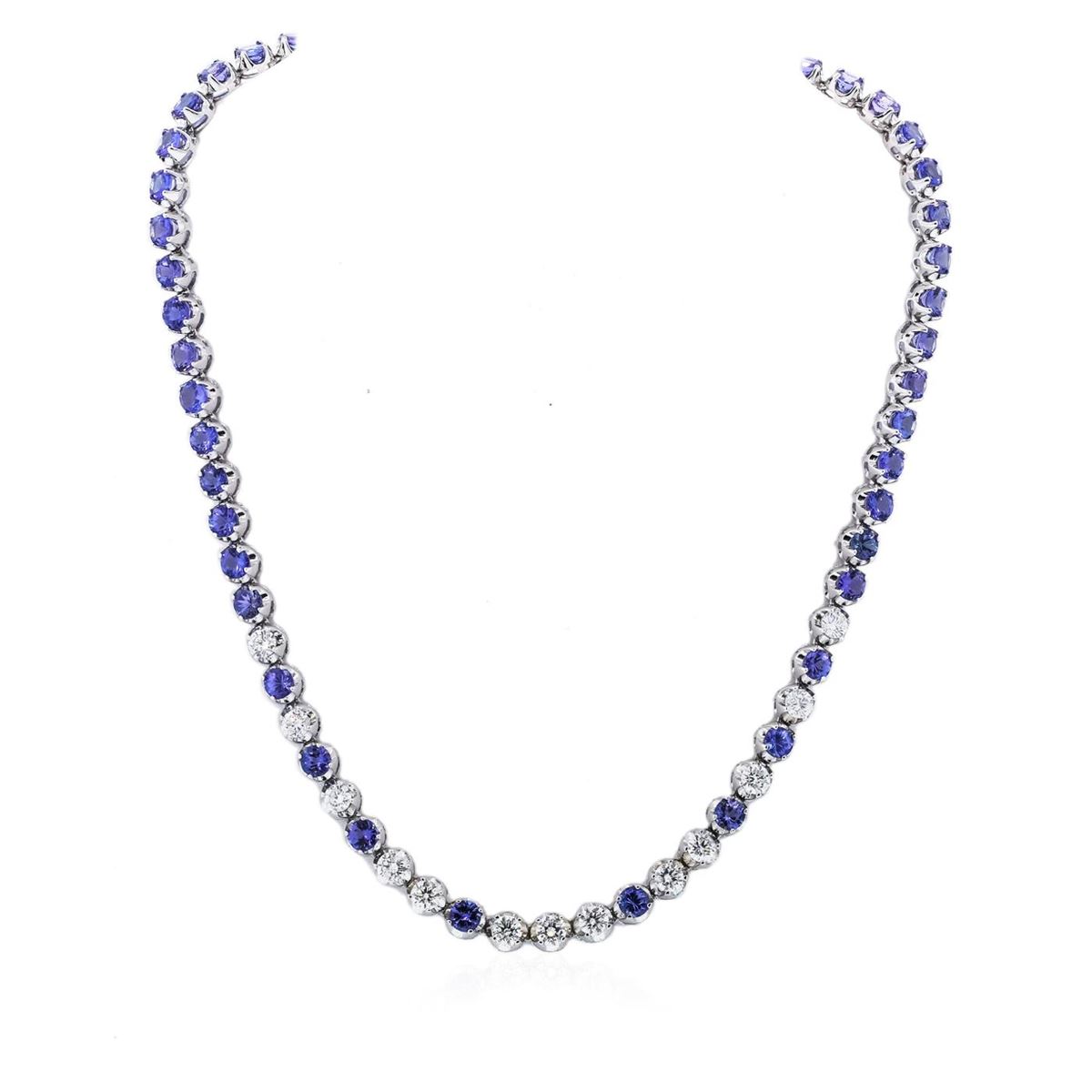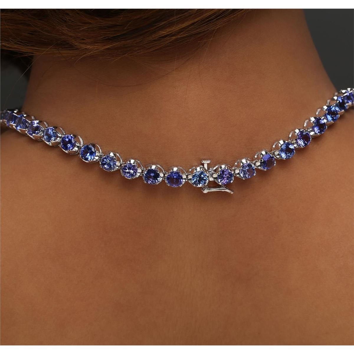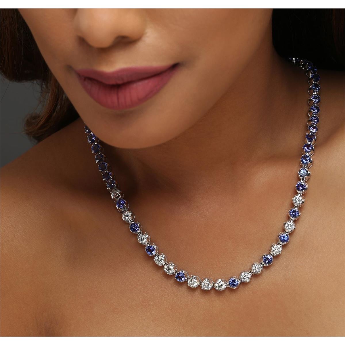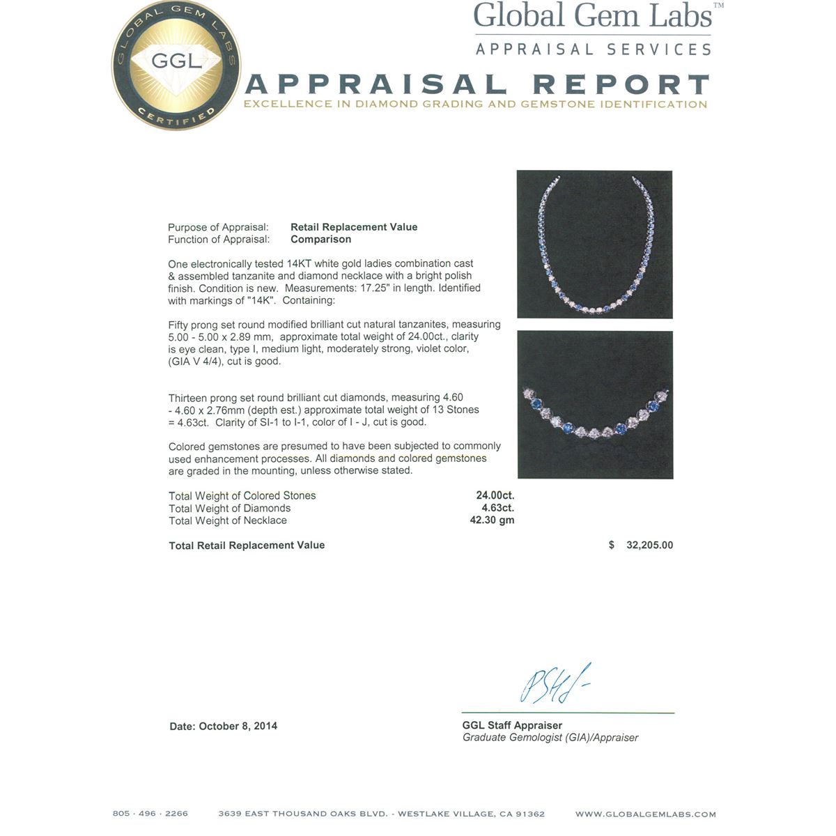 One electronically tested 14KT white gold ladies combination cast & assembled tanzanite and diamond necklace with a bright polish finish. Measurements: 17.25" in length. Identified with markings of "14K". Condition is new. Containing: Fifty prong set round modified brilliant cut natural tanzanites, measuring 5.00 - 5.00 x 2.89 mm, approximate total weight of 24.00ct., clarity is eye clean, type I, medium light, moderately strong, violet color, (GIA V 4/4), cut is good. Thirteen prong set round brilliant cut diamonds, measuring 4.60 - 4.60 x 2.76mm (depth est.) approximate total weight of 13 Stones = 4.63ct. Clarity: SI-1 to I-1. Color: I - J, Cut is Good. Colored gemstones are presumed to have been subjected to commonly used enhancement processes. All diamonds and colored gemstones are graded in the mounting, unless otherwise stated. Total Weight of Colored Stones 24.00ct. Total Weight of Diamonds 4.63ct. Total Weight of Necklace 42.30 grams. GGL Appraised at $32,205.00.