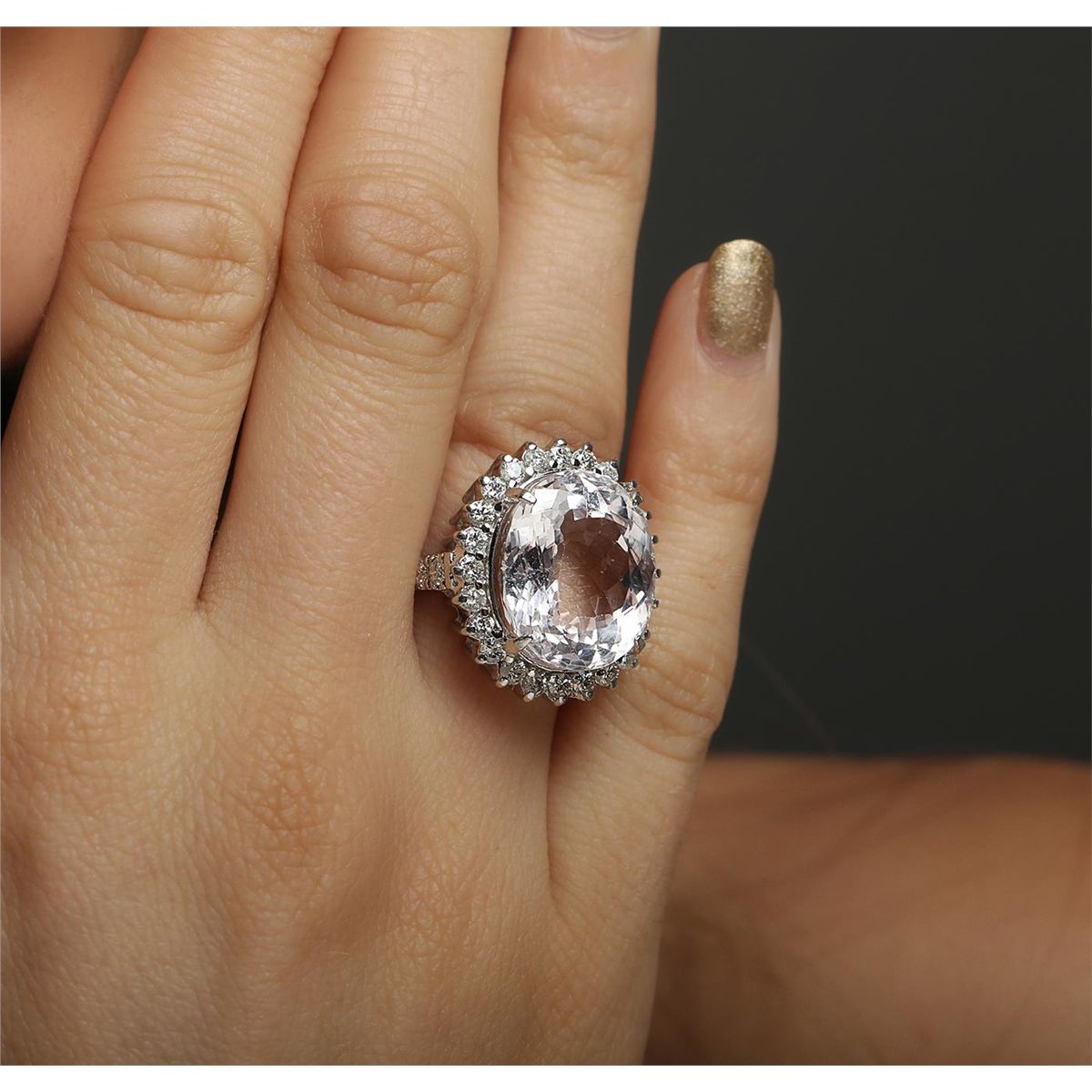 One electronically tested 14KT white gold ladies combination cast & assembled engagement ring with a bright polish finish. Identified with markings of "14K". Condition is new. Containing: One prong set oval modified brilliant cut natural kunzite, measuring 26.80 x 14.00 x 9.10mm, approximate weight of 24.09ct., clarity is eye clean, type I, very light, grayish, purple color, (GIA P 2/1), cut is good. Thirty-Three prong set round brilliant cut diamonds, measuring 2.50 - 2.50 x 1.50mm (depth est.) approximate total weight of 33 Stones = 1.88ct. Clarity: SI-2 to I-1. Color: I - J, Cut is Good. Colored gemstones are presumed to have been subjected to commonly used enhancement processes. All diamonds and colored gemstones are graded in the mounting, unless otherwise stated. Total Weight of Colored Stones 24.09ct. Total Weight of Diamonds 1.88ct. Total Weight of Ring 10.50 grams. GGL Appraised at $8,135.00.