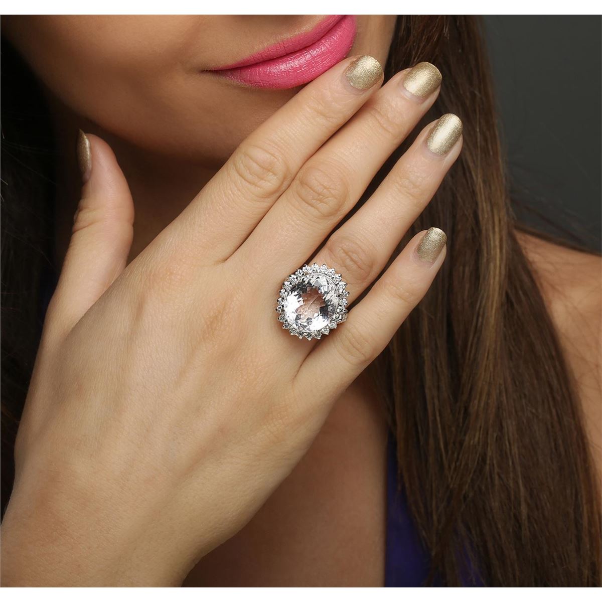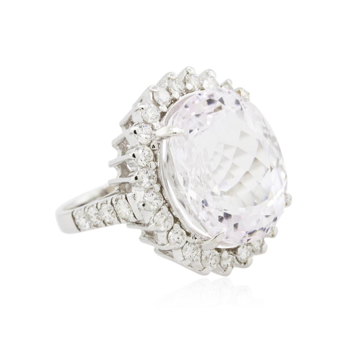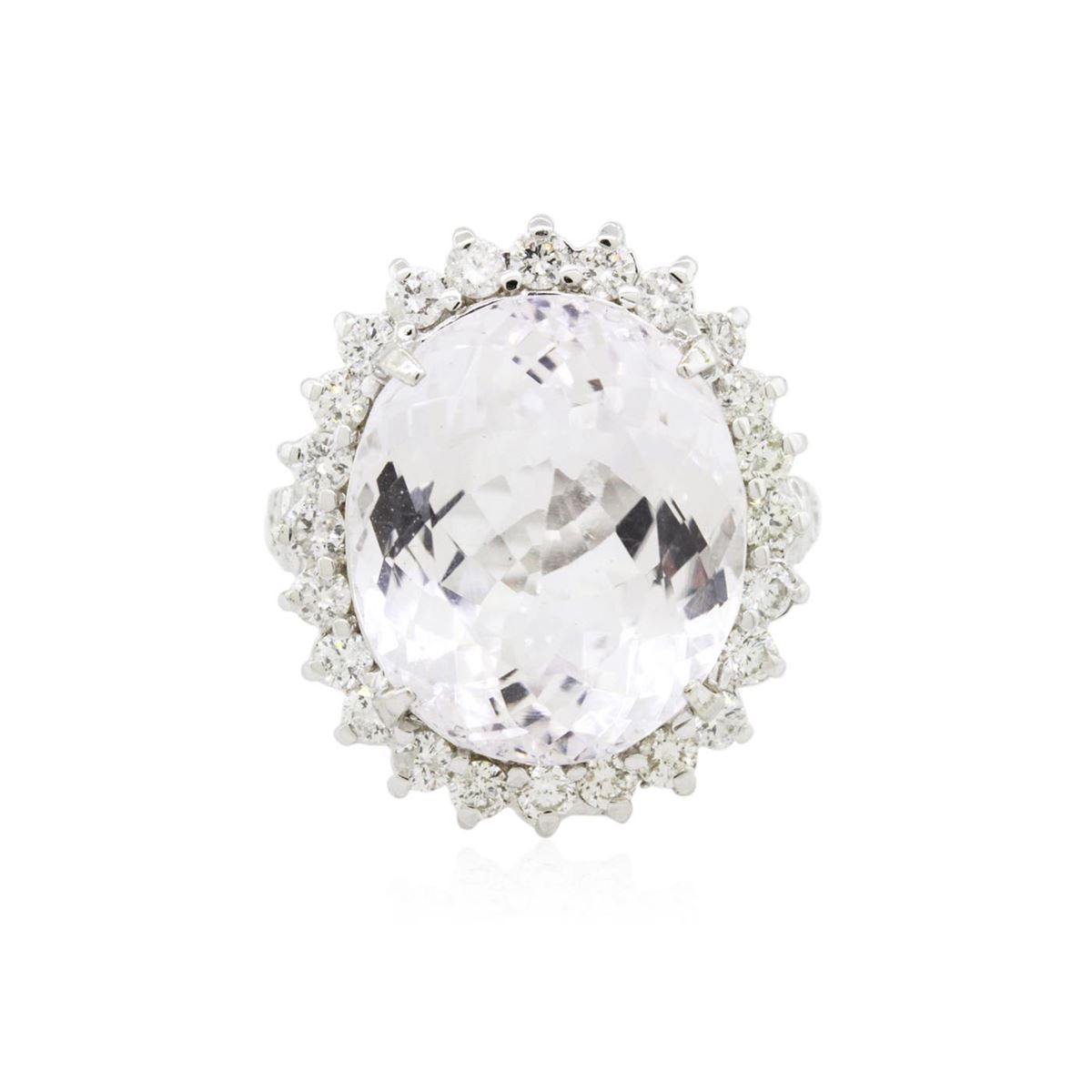 One electronically tested 14KT white gold ladies combination cast & assembled engagement ring with a bright polish finish. Identified with markings of "14K". Condition is new. Containing: One prong set oval modified brilliant cut natural kunzite, measuring 26.80 x 14.00 x 9.10mm, approximate weight of 24.09ct., clarity is eye clean, type I, very light, grayish, purple color, (GIA P 2/1), cut is good. Thirty-Three prong set round brilliant cut diamonds, measuring 2.50 - 2.50 x 1.50mm (depth est.) approximate total weight of 33 Stones = 1.88ct. Clarity: SI-2 to I-1. Color: I - J, Cut is Good. Colored gemstones are presumed to have been subjected to commonly used enhancement processes. All diamonds and colored gemstones are graded in the mounting, unless otherwise stated. Total Weight of Colored Stones 24.09ct. Total Weight of Diamonds 1.88ct. Total Weight of Ring 10.50 grams. GGL Appraised at $8,135.00.