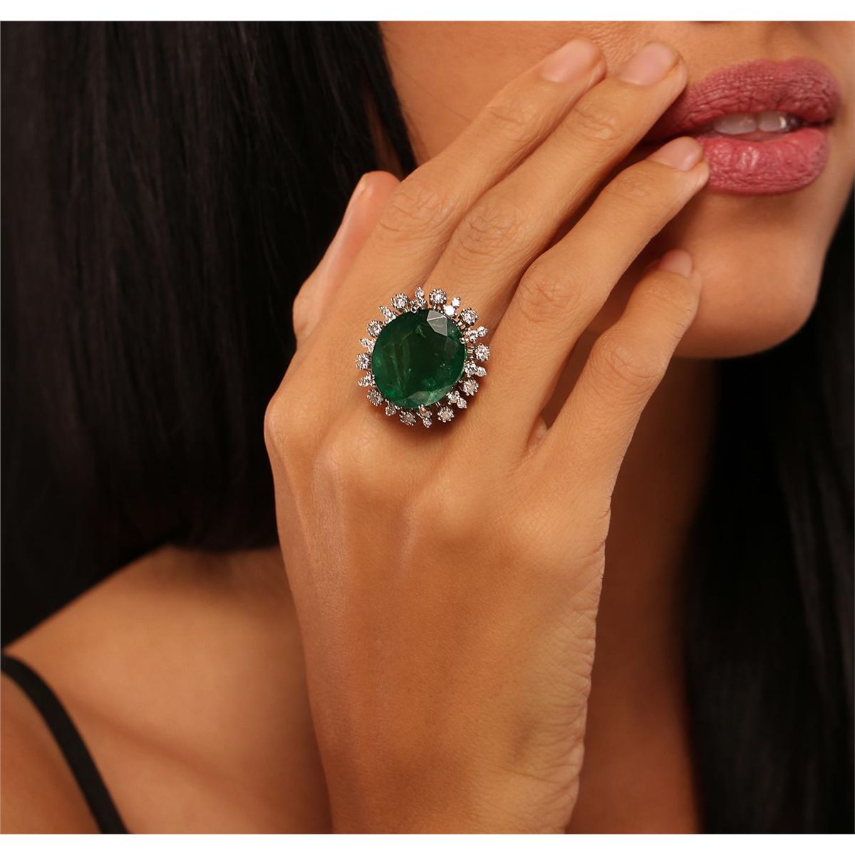 One electronically tested 14KT white gold Ladies combination cast & assembled ring with a bright polish finish. Condition is new. Identified with markings of "14K". Containing: One prong set oval modified brilliant cut natural emerald, measuring 19.69 x 17.25 x 10.24mm, exact weight 24.27ct., clarity is heavily included, type III, medium, moderately strong, green color, (GIA G 5/4), cut is good. GIA Report: 1156953479.Ten prong set round brilliant cut diamonds, measuring 1.80 - 1.80 x 1.08mm (depth est.) approximate. Total Weight of 10 Stones = 0.21ct. Clarity: I-1 to I-2. Color: J - K, Cut is Good. Twenty prong set round brilliant cut diamonds, measuring 2.50 - 2.30 x 1.44mm (depth est.) approximate. Total Weight of 20 Stones = 1.01ct. Clarity: I-1 to I-2. Color: J - K, Cut is Good. Total Weight of Colored Stones 24.27ct. Total Weight of Diamonds 1.23ct. Total Weight of Ring 11.80 grams. GGL Appraised at $34,295.00.