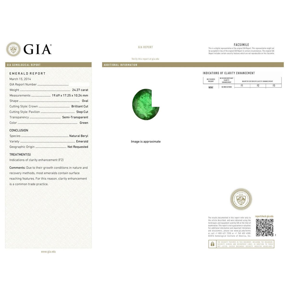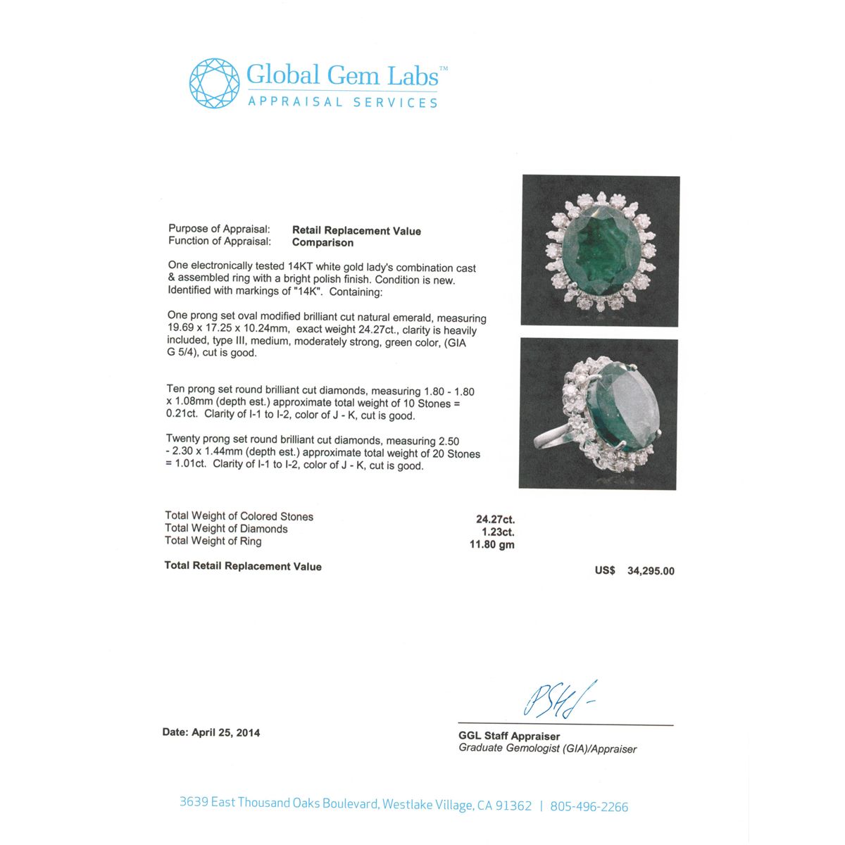 One electronically tested 14KT white gold Ladies combination cast & assembled ring with a bright polish finish. Condition is new. Identified with markings of "14K". Containing: One prong set oval modified brilliant cut natural emerald, measuring 19.69 x 17.25 x 10.24mm, exact weight 24.27ct., clarity is heavily included, type III, medium, moderately strong, green color, (GIA G 5/4), cut is good. GIA Report: 1156953479.Ten prong set round brilliant cut diamonds, measuring 1.80 - 1.80 x 1.08mm (depth est.) approximate. Total Weight of 10 Stones = 0.21ct. Clarity: I-1 to I-2. Color: J - K, Cut is Good. Twenty prong set round brilliant cut diamonds, measuring 2.50 - 2.30 x 1.44mm (depth est.) approximate. Total Weight of 20 Stones = 1.01ct. Clarity: I-1 to I-2. Color: J - K, Cut is Good. Total Weight of Colored Stones 24.27ct. Total Weight of Diamonds 1.23ct. Total Weight of Ring 11.80 grams. GGL Appraised at $34,295.00.