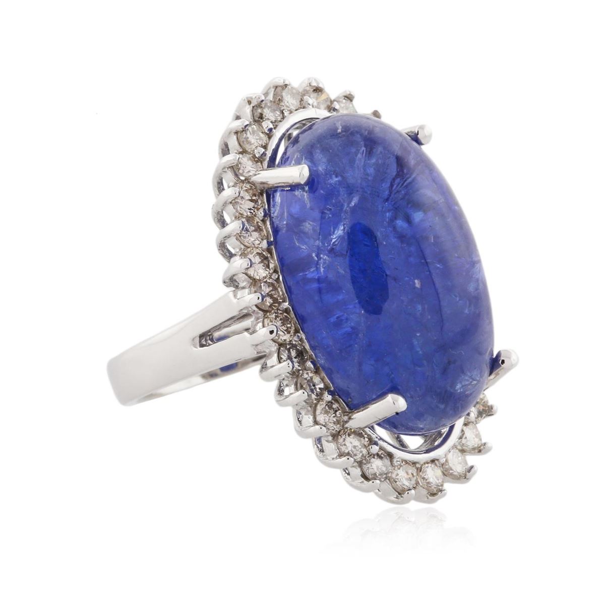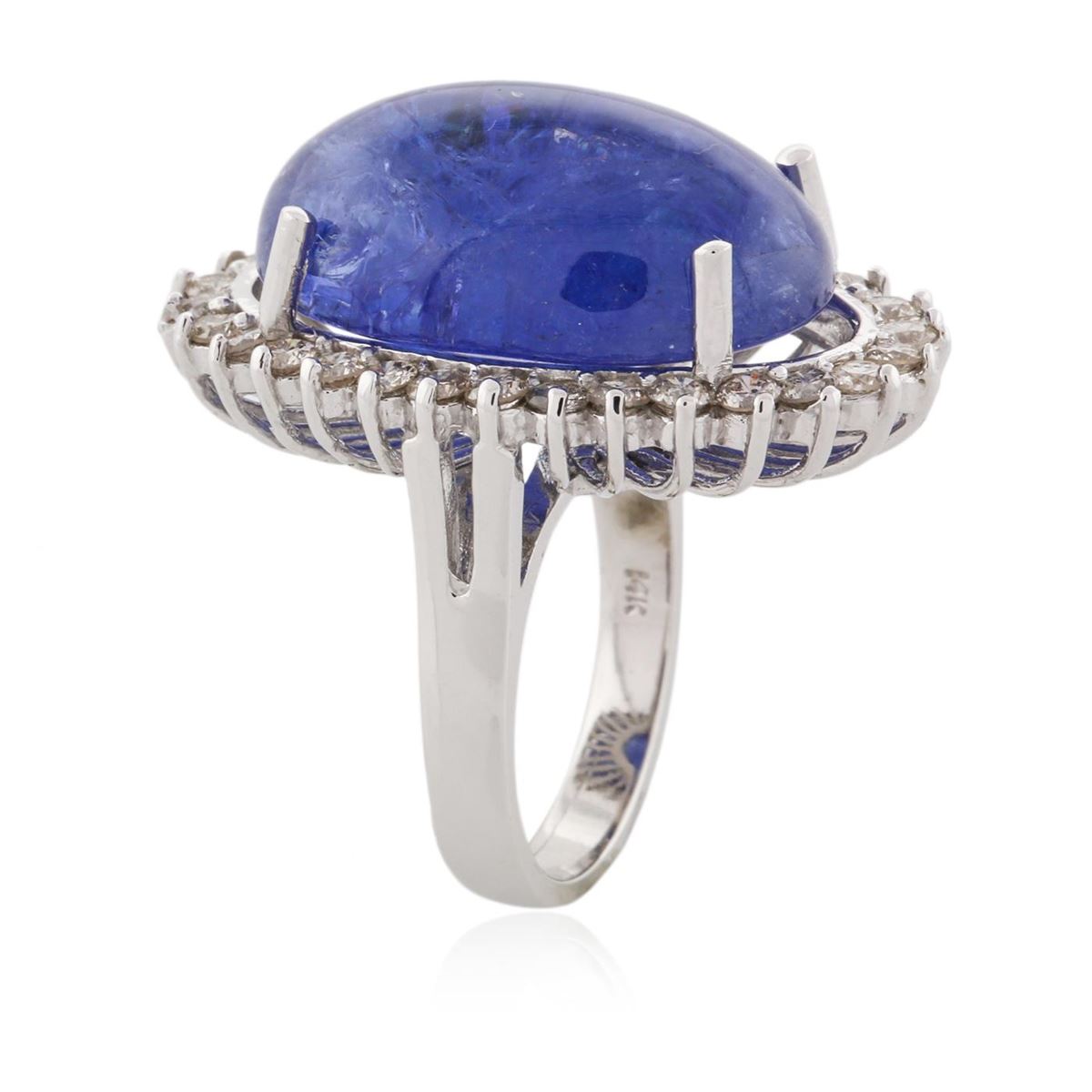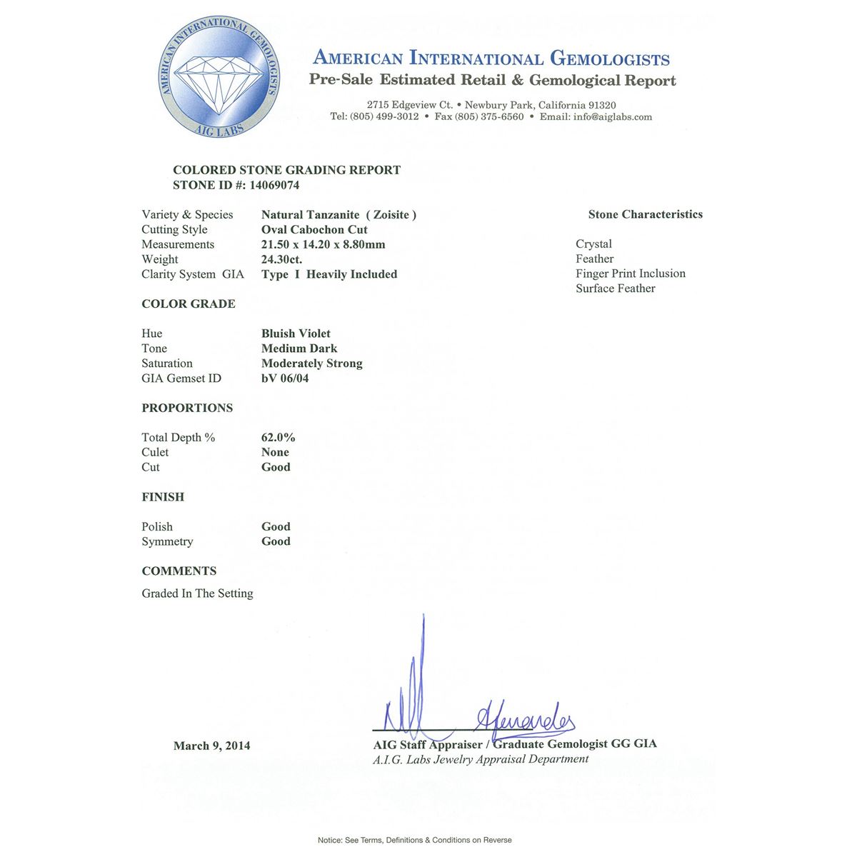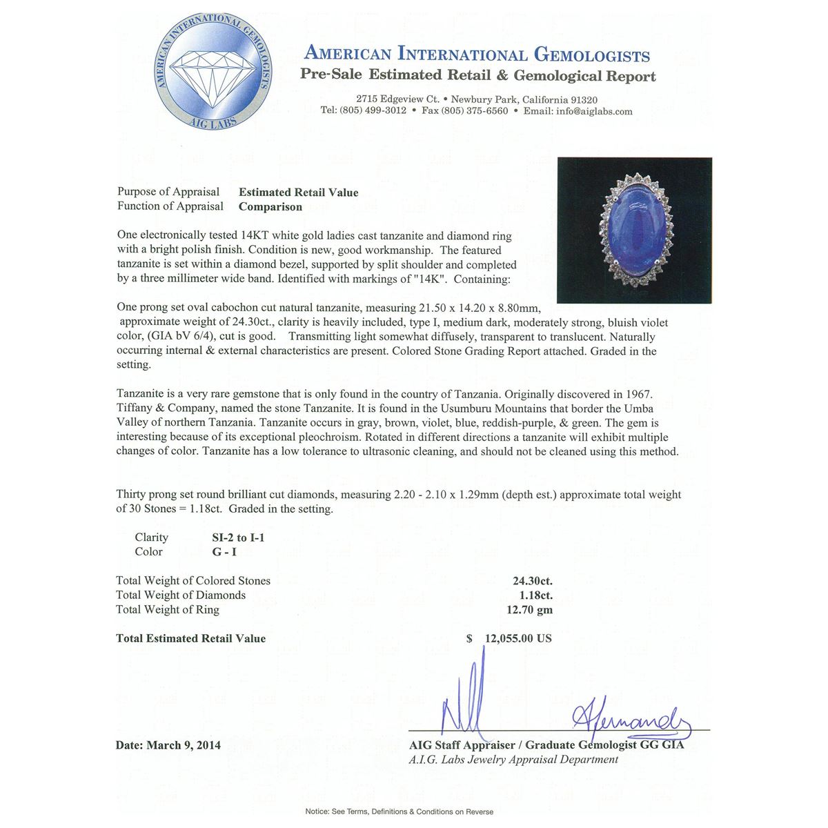 One electronically tested 14KT white gold ladies cast tanzanite and diamond ring with a bright polish finish. The featured tanzanite is set within a diamond bezel, supported by split shoulder and completed by a three millimeter wide band. Identified with markings of "14K". Condition is new, good workmanship. Containing: One prong set oval cabochon cut natural tanzanite, measuring 21.50 x 14.20 x 8.80mm, approximate weight of 24.30ct., clarity is heavily included, type I, medium dark, moderately strong, bluish violet color, (GIA bV 6/4), cut is good. Transmitting light somewhat diffusely, transparent to translucent. Naturally occurring internal & external characteristics are present. Colored Stone Grading Report attached. Graded in the setting. Tanzanite is a very rare gemstone that is only found in the country of Tanzania. Originally discovered in 1967. Tiffany & Company, named the stone Tanzanite. It is found in the Usumburu Mountains that border the Umba Valley of northern Tanzania. Tanzanite occurs in gray, brown, violet, blue, reddish-purple, & green. The gem is interesting because of its exceptional pleochroism. Rotated in different directions a tanzanite will exhibit multiple changes of color. Tanzanite has a low tolerance to ultrasonic cleaning, and should not be cleaned using this method. Thirty prong set round brilliant cut diamonds, measuring 2.20 - 2.10 x 1.29mm (depth est.) approximate. Total Weight of 30 Stones = 1.18ct. Graded in the setting. Clarity: SI-2 to I-1. Color: G - I. Total Weight of Colored Stones 24.30ct. Total Weight of Diamonds 1.18ct. AIG Appraised at $12,055.00.