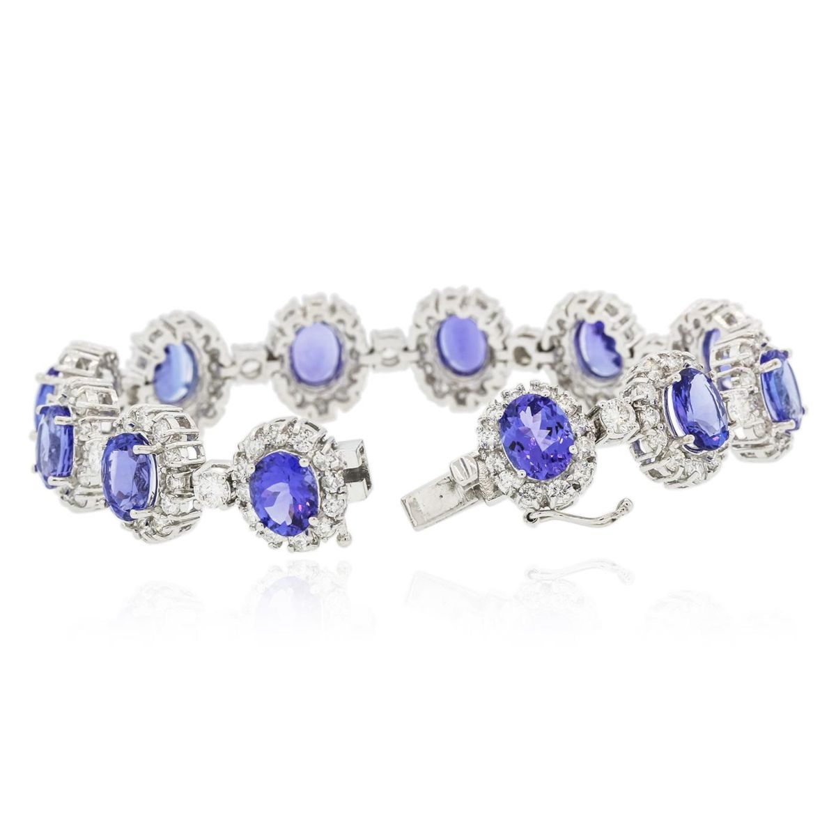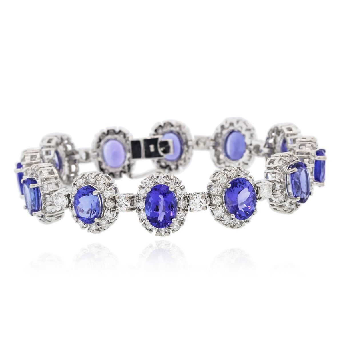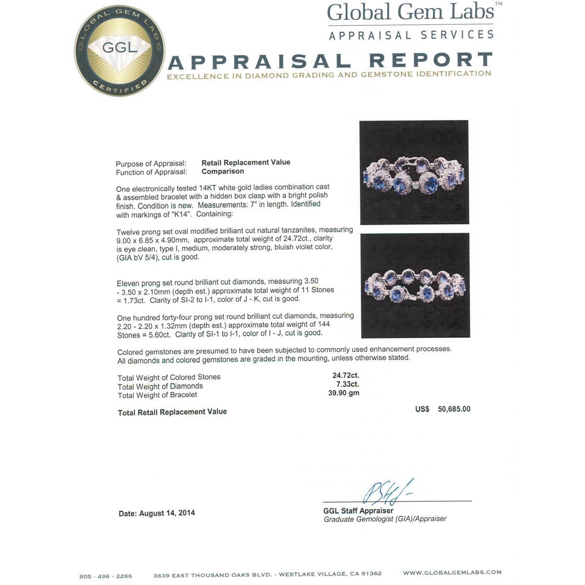 One electronically tested 14KT white gold ladies combination cast & assembled bracelet with a hidden box clasp with a bright polish finish. Condition is new. Measurements: 7" in length. Identified with markings of "K14". Containing: Twelve prong set oval modified brilliant cut natural tanzanites, measuring 9.00 x 6.85 x 4.90mm, approximate total weight of 24.72ct., clarity is eye clean, type I, medium, moderately strong, bluish violet color, (GIA bV 5/4), cut is good. Eleven prong set round brilliant cut diamonds, measuring 3.50 - 3.50 x 2.10mm (depth est.) approximate total weight of 11 Stones = 1.73ct. Clarity: SI-2 to I-1. Color: J - K, Cut is Good. One Hundred Forty-Four prong set round brilliant cut diamonds, measuring 2.20 - 2.20 x 1.32mm (depth est.) approximate total weight of 144 Stones = 5.60ct. Clarity: SI-1 to I-1. Color: I - J, Cut is Good. Colored gemstones are presumed to have been subjected to commonly used enhancement processes. All diamonds and colored gemstones are graded in the mounting, unless otherwise stated. Total Weight of Colored Stones 24.72ct. Total Weight of Diamonds 7.33ct. Total Weight of Bracelet 39.90 grams. GGL Appraised at $50,685.00.
