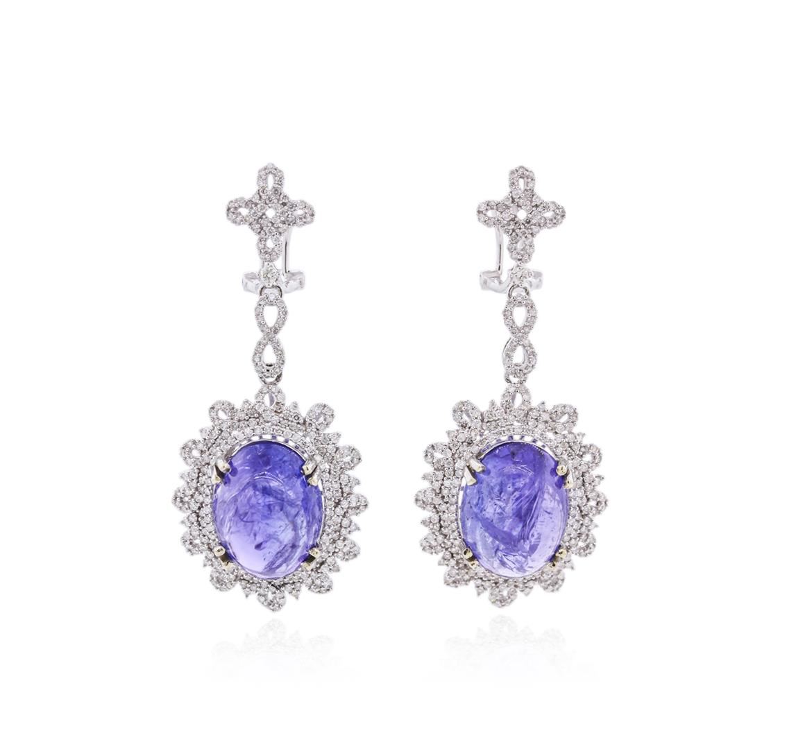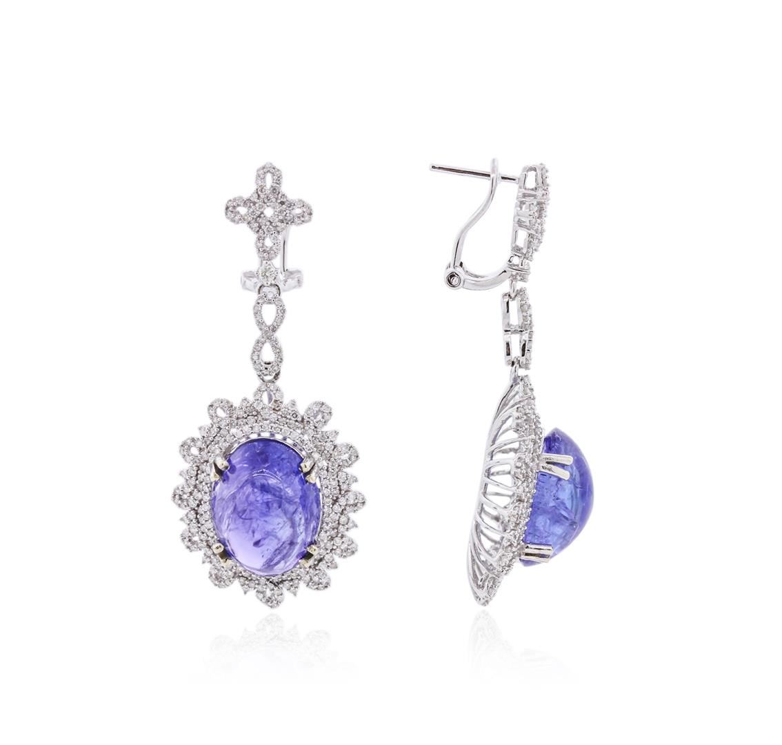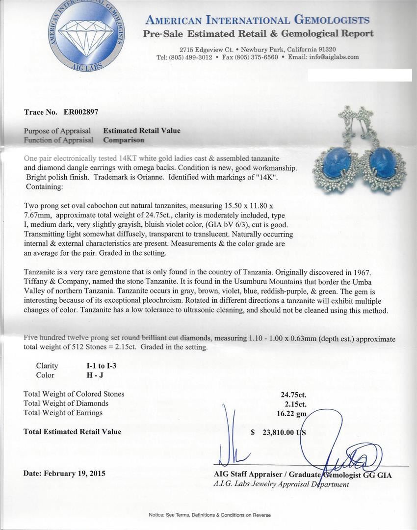 One pair electronically tested 14KT white gold ladies cast & assembled tanzanite and diamond dangle earrings with omega backs. Bright polish finish. Trademark is Orianne. Identified with markings of "14K". Condition is new, good workmanship. Containing: Two prong set oval cabochon cut natural tanzanites, measuring 15.50 x 11.80 x 7.67mm, approximate total weight of 24.75ct., clarity is moderately included, type I, medium dark, very slightly grayish, bluish violet color, (GIA bV 6/3), cut is good. Transmitting light somewhat diffusely, transparent to translucent. Naturally occurring internal & external characteristics are present. Measurements & the color grade are an average for the pair. Graded in the setting. Tanzanite is a very rare gemstone that is only found in the country of Tanzania. Originally discovered in 1967. Tiffany & Company, named the stone Tanzanite. It is found in the Usumburu Mountains that border the Umba Valley of northern Tanzania. Tanzanite occurs in gray, brown, violet, blue, reddish-purple, & green. The gem is interesting because of its exceptional pleochroism. Rotated in different directions a tanzanite will exhibit multiple changes of color. Tanzanite has a low tolerance to ultrasonic cleaning, and should not be cleaned using this method. Five Hundred Twelve prong set round brilliant cut diamonds, measuring 1.10 - 1.00 x 0.63mm (depth est.) approximate total weight of 512 Stones = 2.15ct. Graded in the setting. Clarity: I-1 to I-3. Color: H - J. Total Weight of Colored Stones 24.75ct. Total Weight of Diamonds 2.15ct. Total Weight of Earrings 16.22gm. AIG Appraised at $23,810.00.