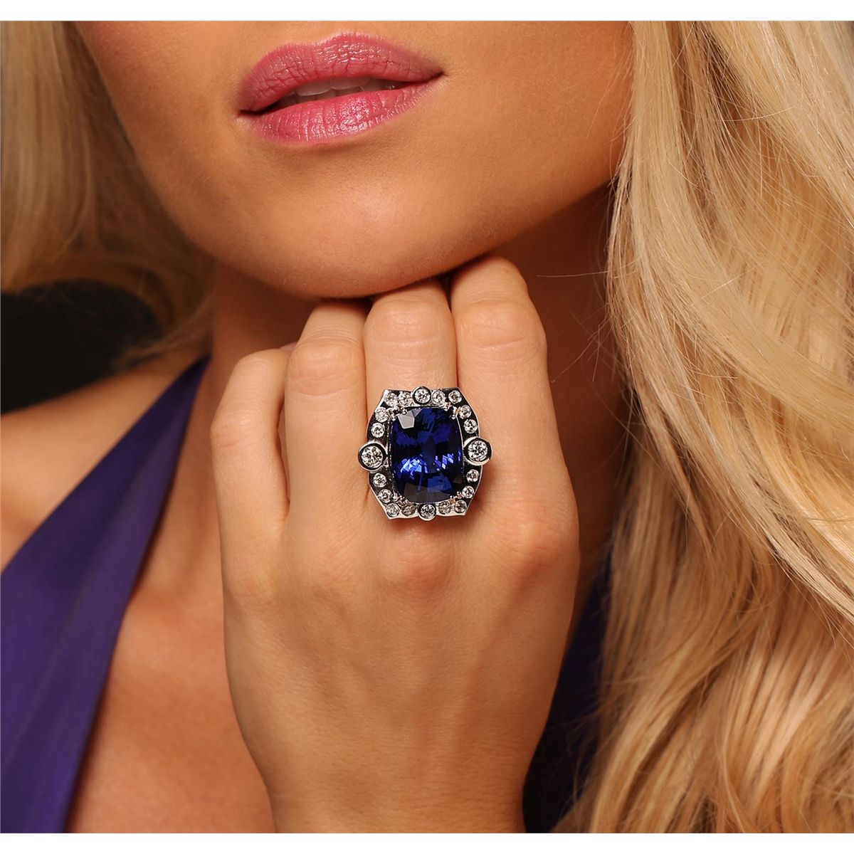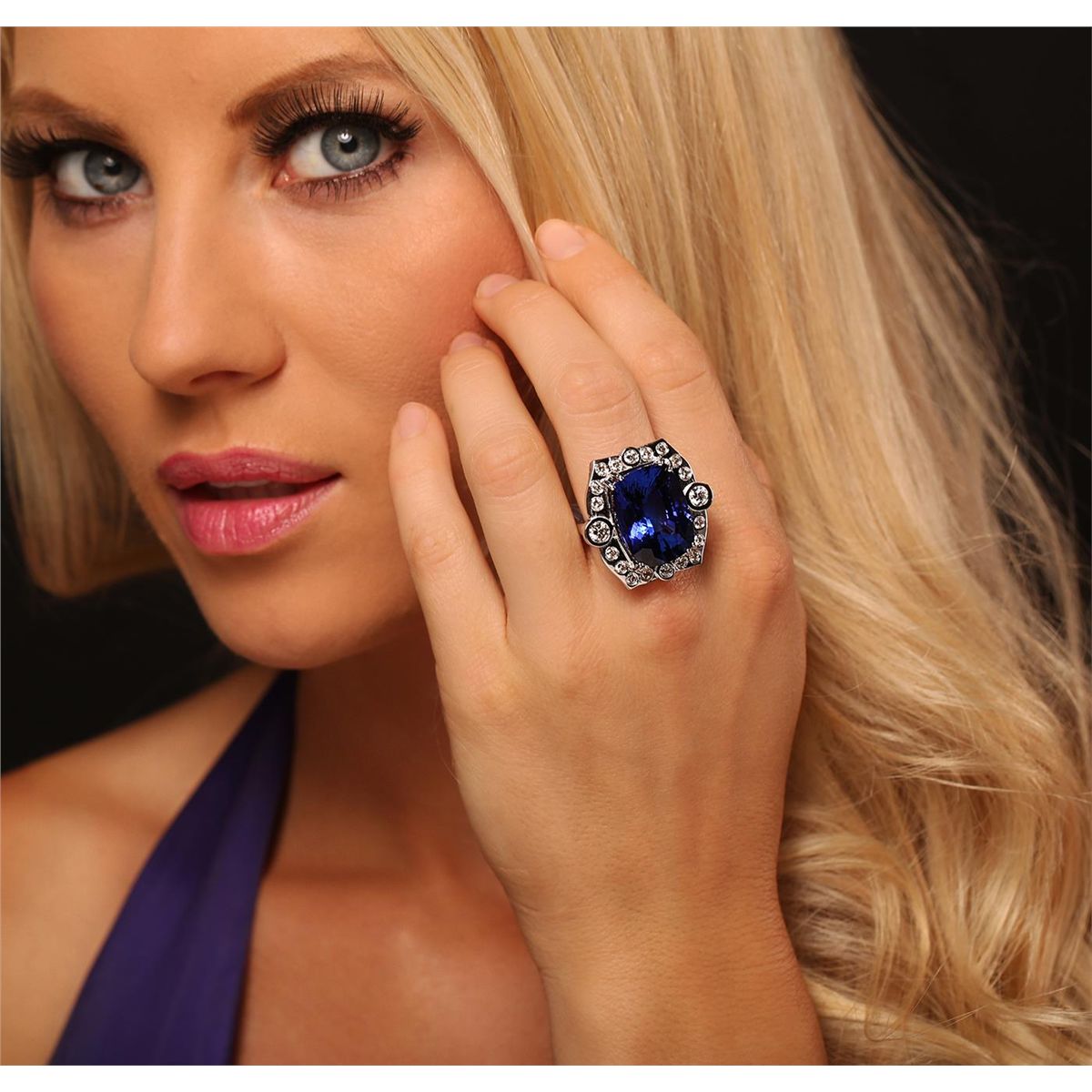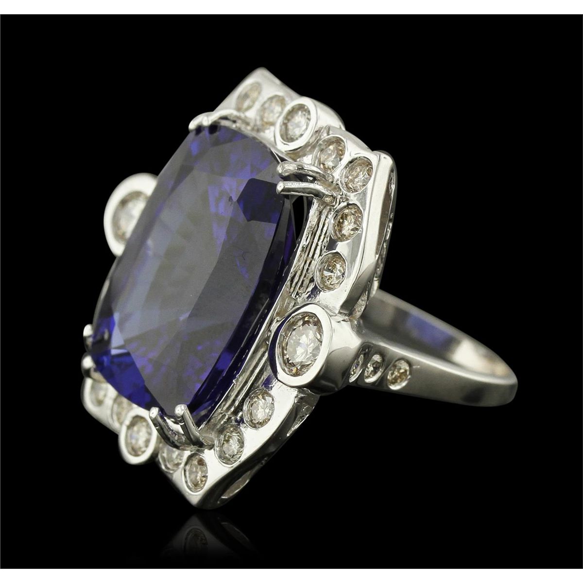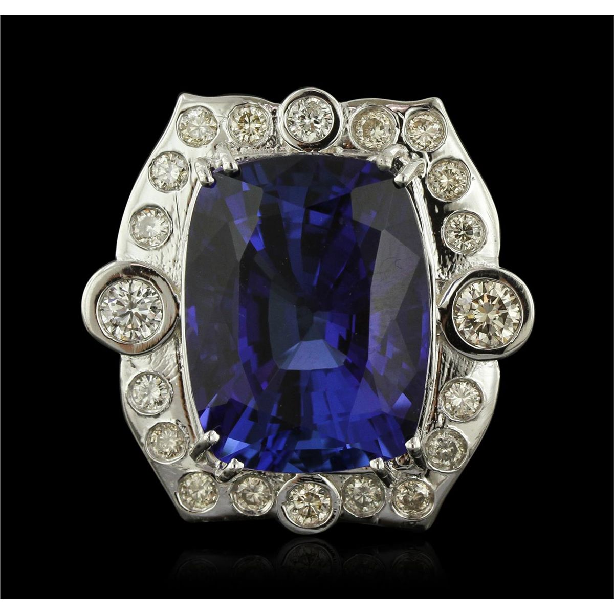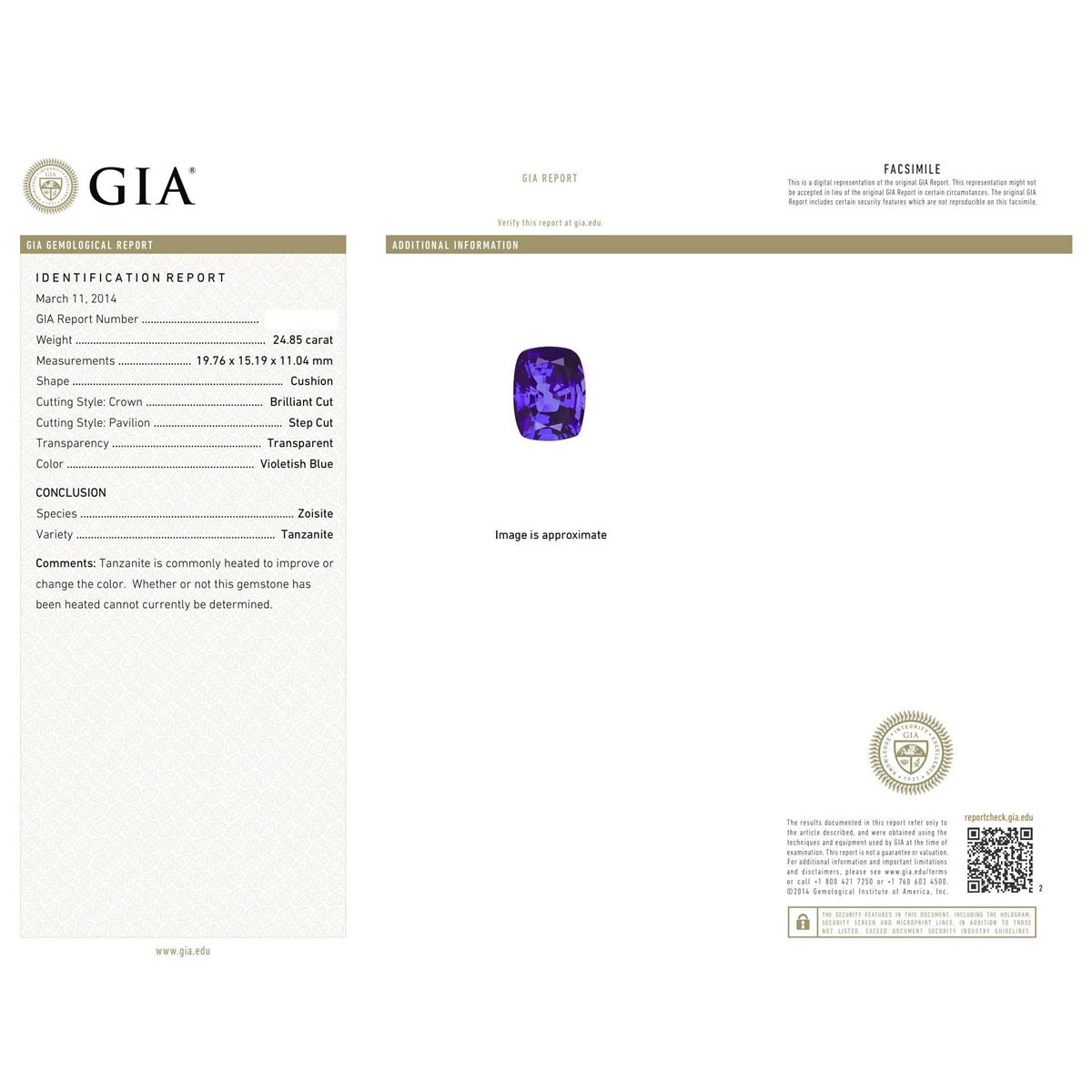 One electronically tested 14KT white gold ladies cast tanzanite and diamond ring with a bright polish finish. Condition is new, good workmanship. The featured tanzanite is set within a diamond lattice gallery, supported by diamond set shoulders and completed by a two millimeter wide band. Identified with markings of "K14". Containing: One prong set rectangular cushion modified brilliant cut natural tanzanite, measuring 19.76 x 15.19 x 11.04mm, exact weight 24.85ct., clarity is eye clean, type I, medium dark, moderately strong, violetish blue color, (GIA vB 6/4), cut is good. Transmitting light with no distortion, transparent. GIA Gemological Report attached. Graded loose prior to setting in the GIA Laboratory, Report #2151962520.Tanzanite is a very rare gemstone that is only found in the country of Tanzania. Originally discovered in 1967. Tiffany & Company, named the stone Tanzanite. It is found in the Usumburu Mountains that border the Umba Valley of northern Tanzania. Tanzanite occurs in gray, brown, violet, blue, reddish-purple, & green. The gem is interesting because of its exceptional pleochroism. Rotated in different directions a tanzanite will exhibit multiple changes of color. Tanzanite has a low tolerance to ultrasonic cleaning, and should not be cleaned using this method. Twenty-Six bezel & flush set round brilliant cut diamonds, measuring 3.70 - 1.70 x 1.62mm (depth est.) approximate. Total Weight of 26 Stones = 1.44ct. Graded in the setting. Clarity: SI-1 to I-1. Color: G - I. Total Weight of Colored Stones 24.85ct. Total Weight of Diamonds 1.44ct. Total Weight of Ring 16.30 grams. AIGAppraised at $75,010.00.