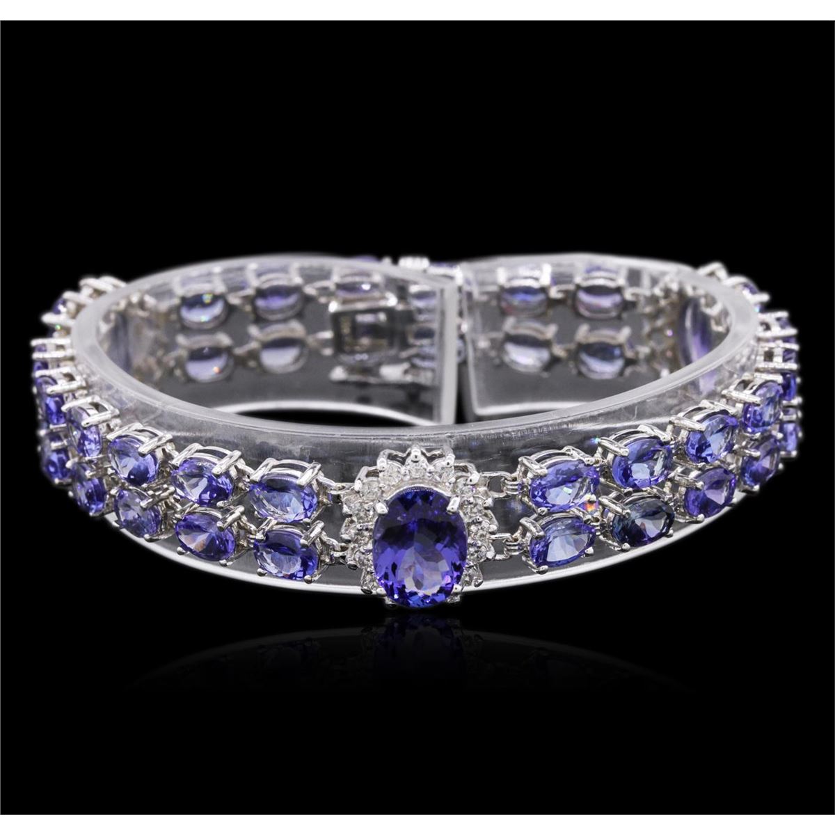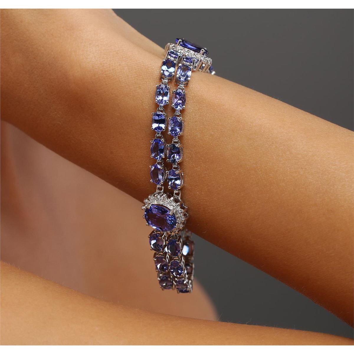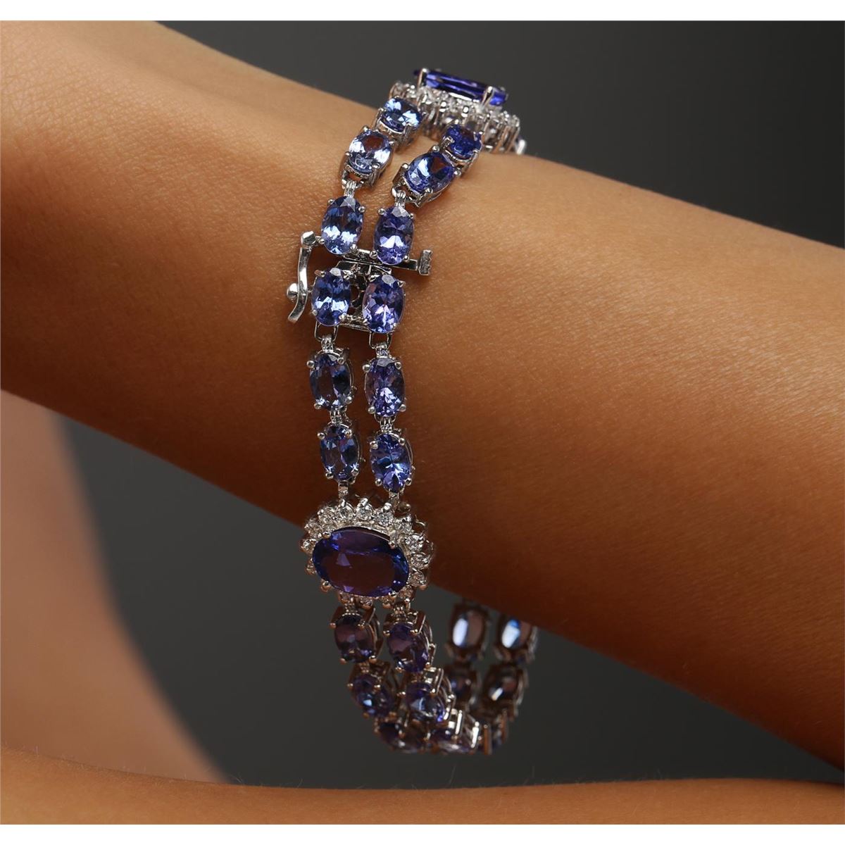 One electronically tested 14KT white gold ladies combination cast & assembled tanzanite and diamond bracelet with a hidden box clasp with a bright polish finish. Measurements: 7.25" in length. Identified with markings of "14K". Condition is new. Containing: Three prong set oval modified brilliant cut natural tanzanites, measuring 10.50 x 8.00 x 5.20mm, approximate total weight of 9.21ct., clarity is eye clean, type I, medium light, very slightly grayish, violet color, (GIA V 4/3), cut is good. Thirty-six prong set oval modified brilliant cut natural tanzanites, measuring 6.00 x 4.00 x 2.60mm, approximate total weight of 15.84ct., clarity is eye clean, type I, medium light, very slightly grayish, violet color, (GIA V 4/3), cut is good. Forty-Eight prong set round brilliant cut diamonds, measuring 1.70 - 1.70 x 1.02mm (depth est.) approximate total weight of 48 Stones = 0.86ct. Clarity: SI-1 to I-1. Color: J - K, Cut is Good. Colored gemstones are presumed to have been subjected to commonly used enhancement processes. All diamonds and colored gemstones are graded in the mounting, unless otherwise stated. Total Weight of Colored Stones 25.05ct. Total Weight of Diamonds 0.86ct. Total Weight of Bracelet 21.70 grams. GGL Appraised at $19,580.00.