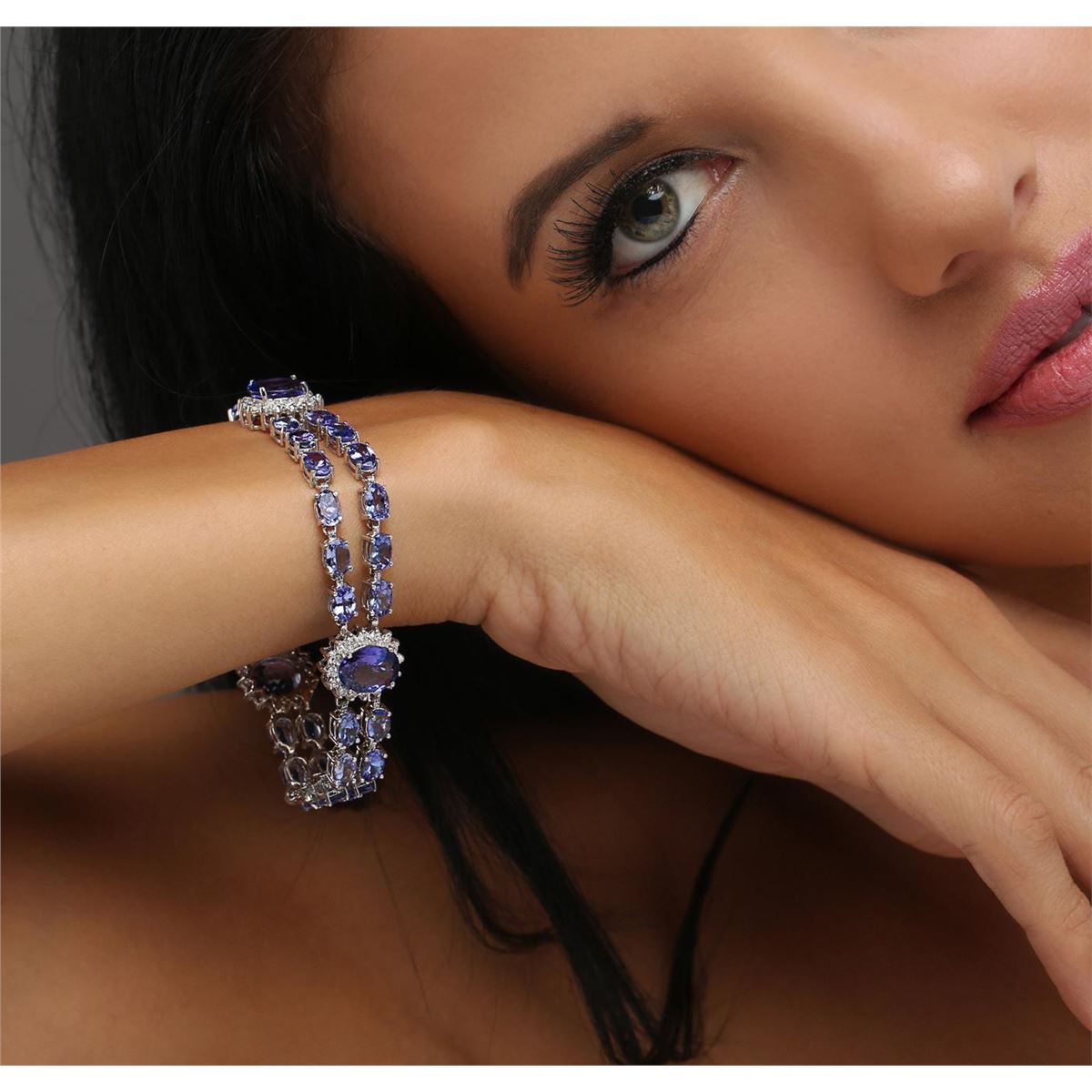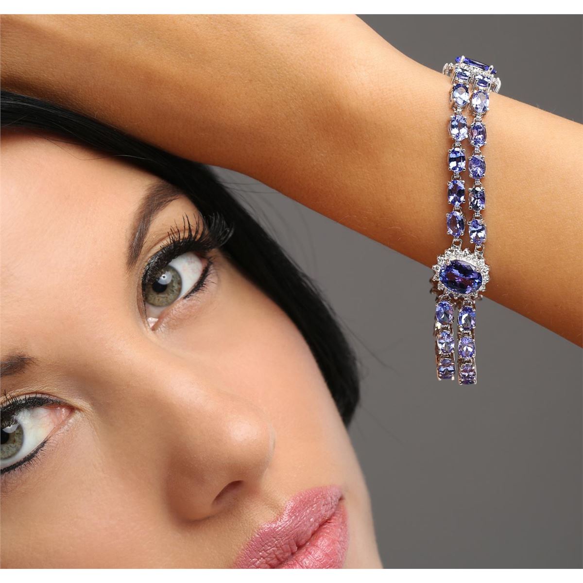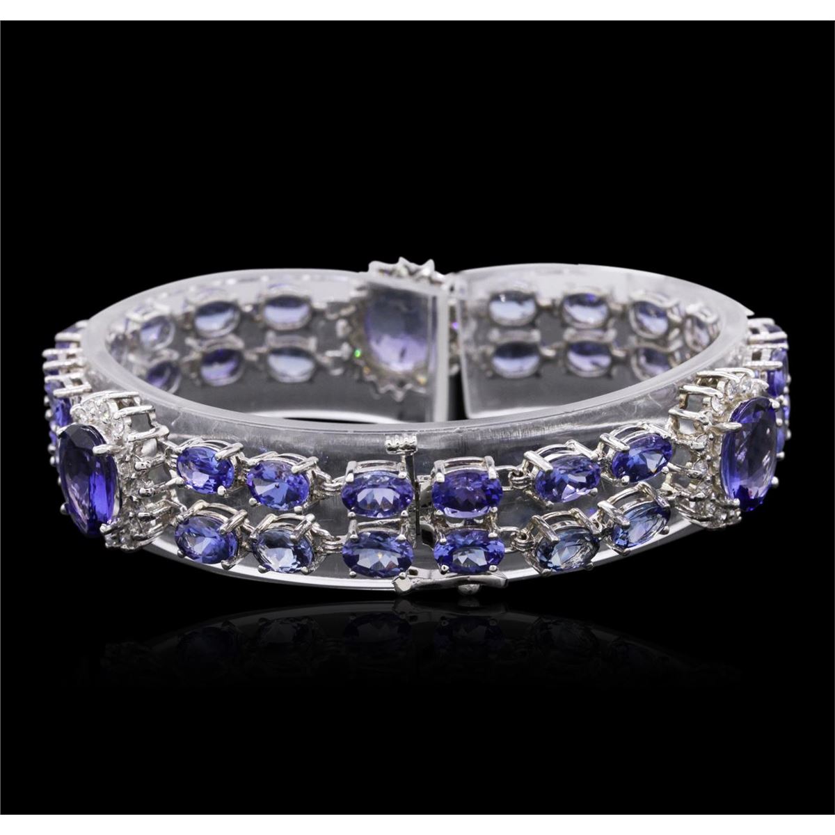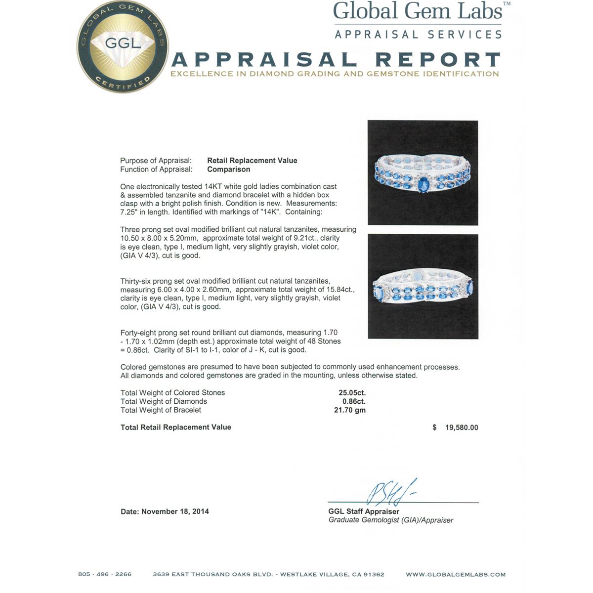 One electronically tested 14KT white gold ladies combination cast & assembled tanzanite and diamond bracelet with a hidden box clasp with a bright polish finish. Measurements: 7.25" in length. Identified with markings of "14K". Condition is new. Containing: Three prong set oval modified brilliant cut natural tanzanites, measuring 10.50 x 8.00 x 5.20mm, approximate total weight of 9.21ct., clarity is eye clean, type I, medium light, very slightly grayish, violet color, (GIA V 4/3), cut is good. Thirty-six prong set oval modified brilliant cut natural tanzanites, measuring 6.00 x 4.00 x 2.60mm, approximate total weight of 15.84ct., clarity is eye clean, type I, medium light, very slightly grayish, violet color, (GIA V 4/3), cut is good. Forty-Eight prong set round brilliant cut diamonds, measuring 1.70 - 1.70 x 1.02mm (depth est.) approximate total weight of 48 Stones = 0.86ct. Clarity: SI-1 to I-1. Color: J - K, Cut is Good. Colored gemstones are presumed to have been subjected to commonly used enhancement processes. All diamonds and colored gemstones are graded in the mounting, unless otherwise stated. Total Weight of Colored Stones 25.05ct. Total Weight of Diamonds 0.86ct. Total Weight of Bracelet 21.70 grams. GGL Appraised at $19,580.00.