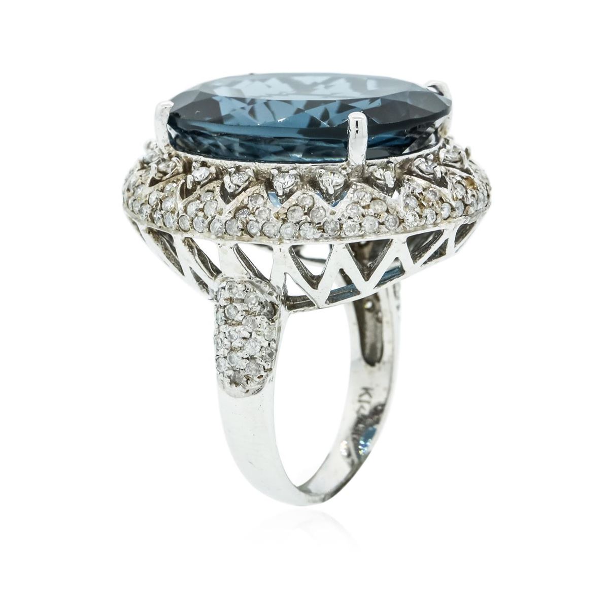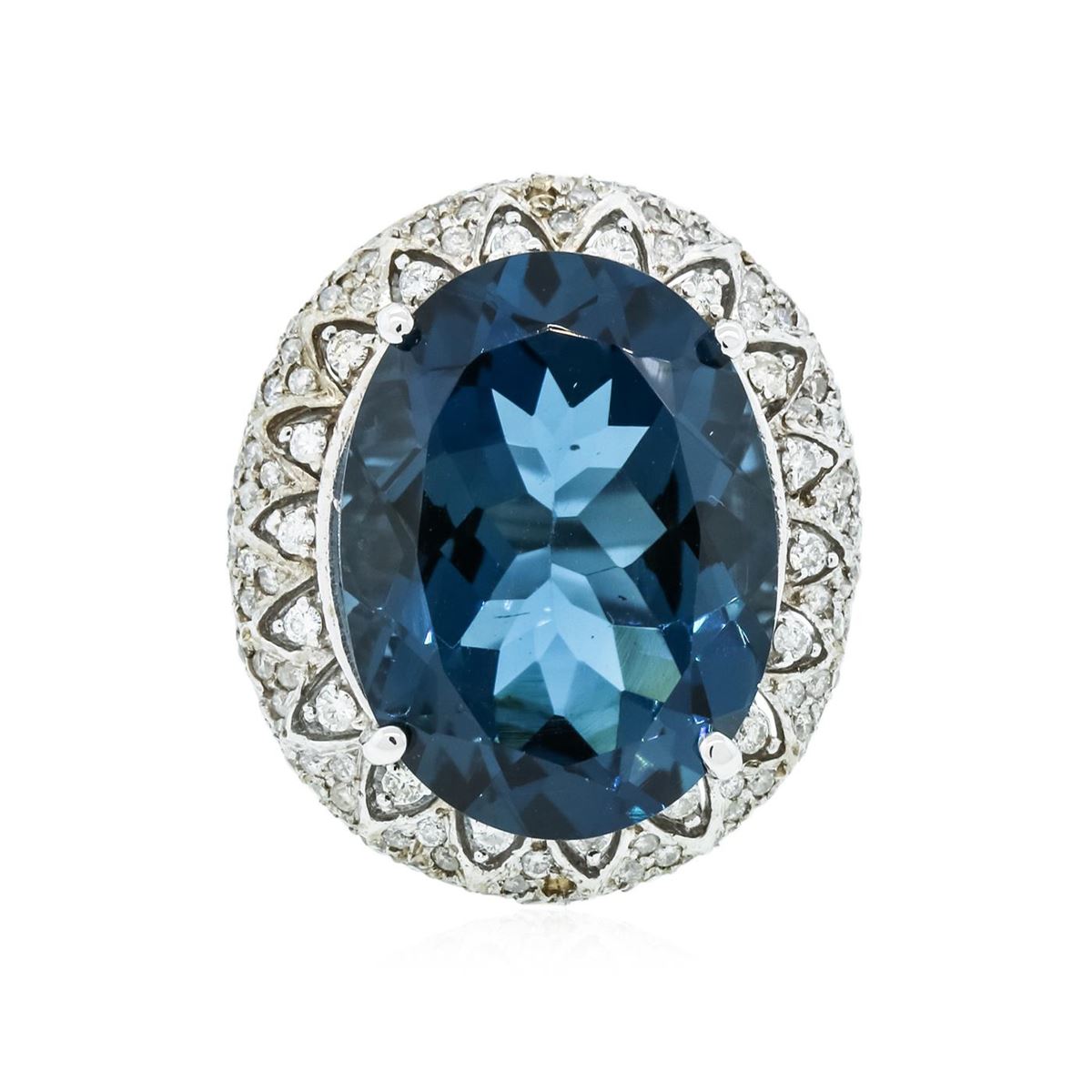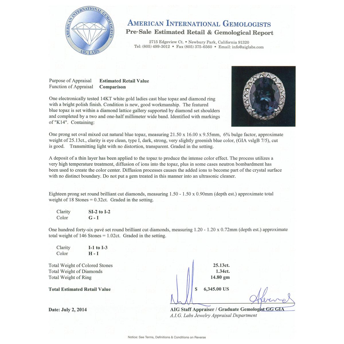 One electronically tested 14KT white gold ladies cast blue topaz and diamond ring with a bright polish finish. Condition is new, good workmanship. The featured blue topaz is set within a diamond lattice gallery supported by diamond set shoulders and completed by a two and one-half millimeter wide band. Identified with markings of "K14". Containing: One prong set oval mixed cut natural blue topaz, measuring 21.50 x 16.00 x 9.55mm, 6%. bulge factor, approximate weight of 25.13ct., clarity is eye clean, type I, dark, strong, very slightly greenish blue color, (GIA vslgB 7/5), cut is good. Transmitting light with no distortion, transparent. Graded in the setting. A deposit of a thin layer has been applied to the topaz to produce the intense color effect. The process utilizes a very high temperature treatment, diffusion of ions into the topaz, plus in some cases neutron bombardment has been used to create the color center. Diffusion processes causes the added ions to become part of the crystal surface with no distinct boundary. Do not put a gem treated in this manner into an ultrasonic cleaner. Eighteen prong set round brilliant cut diamonds, measuring 1.50 - 1.50 x 0.90mm (depth est.) approximate total weight of 18 Stones = 0.32ct. Graded in the setting. Clarity: SI-2 to I-2. Color: G - I One Hundred Forty-Six pave set round brilliant cut diamonds, measuring 1.20 - 1.20 x 0.72mm (depth est.) approximate total weight of 146 Stones = 1.02ct. Graded in the setting. Clarity: I-1 to I-3. Color: H - I. Total Weight of Colored Stones 25.13ct. Total Weight of Diamonds 1.34ct. Total Weight of Ring 14.80 grams. AIG Appraised at $6,345.00.