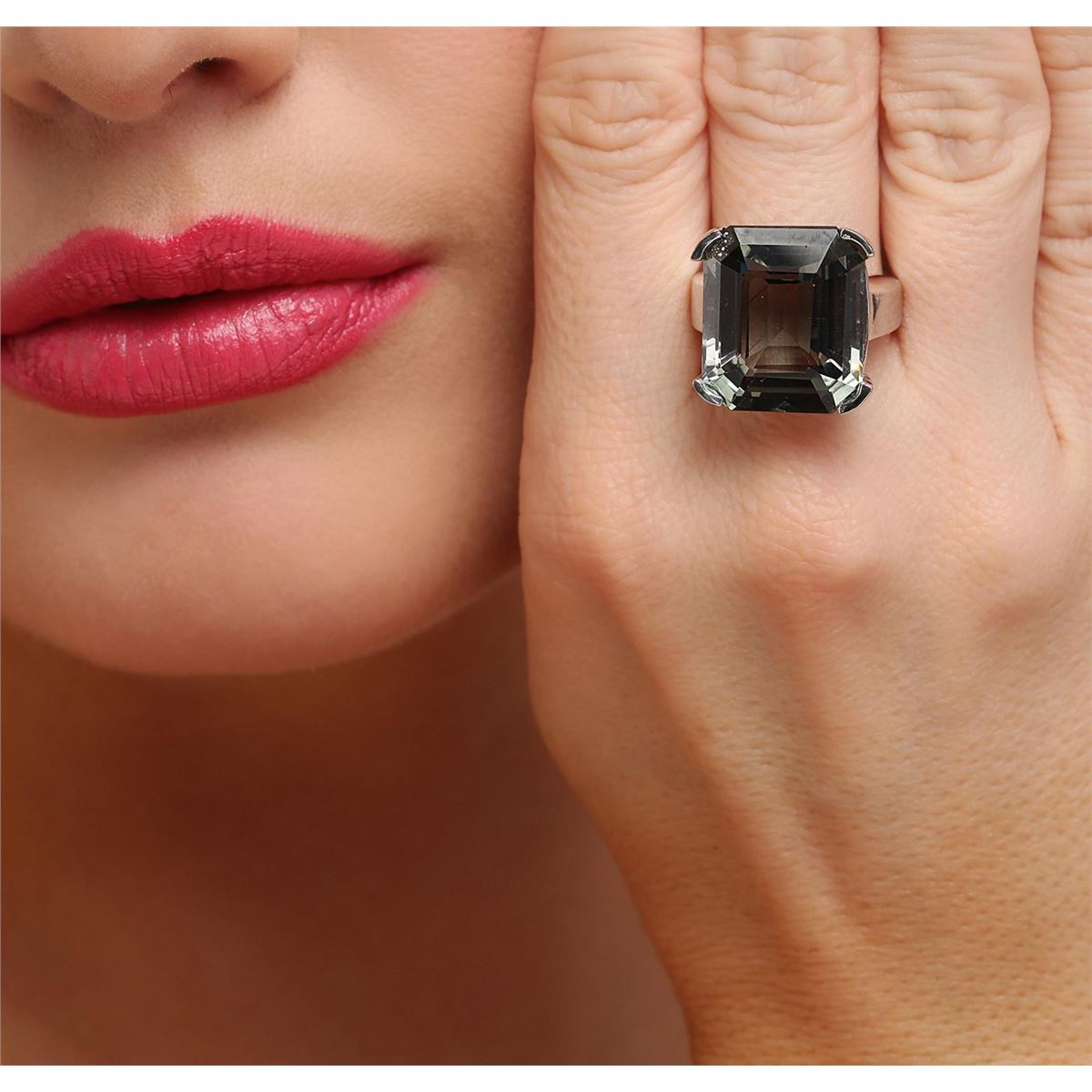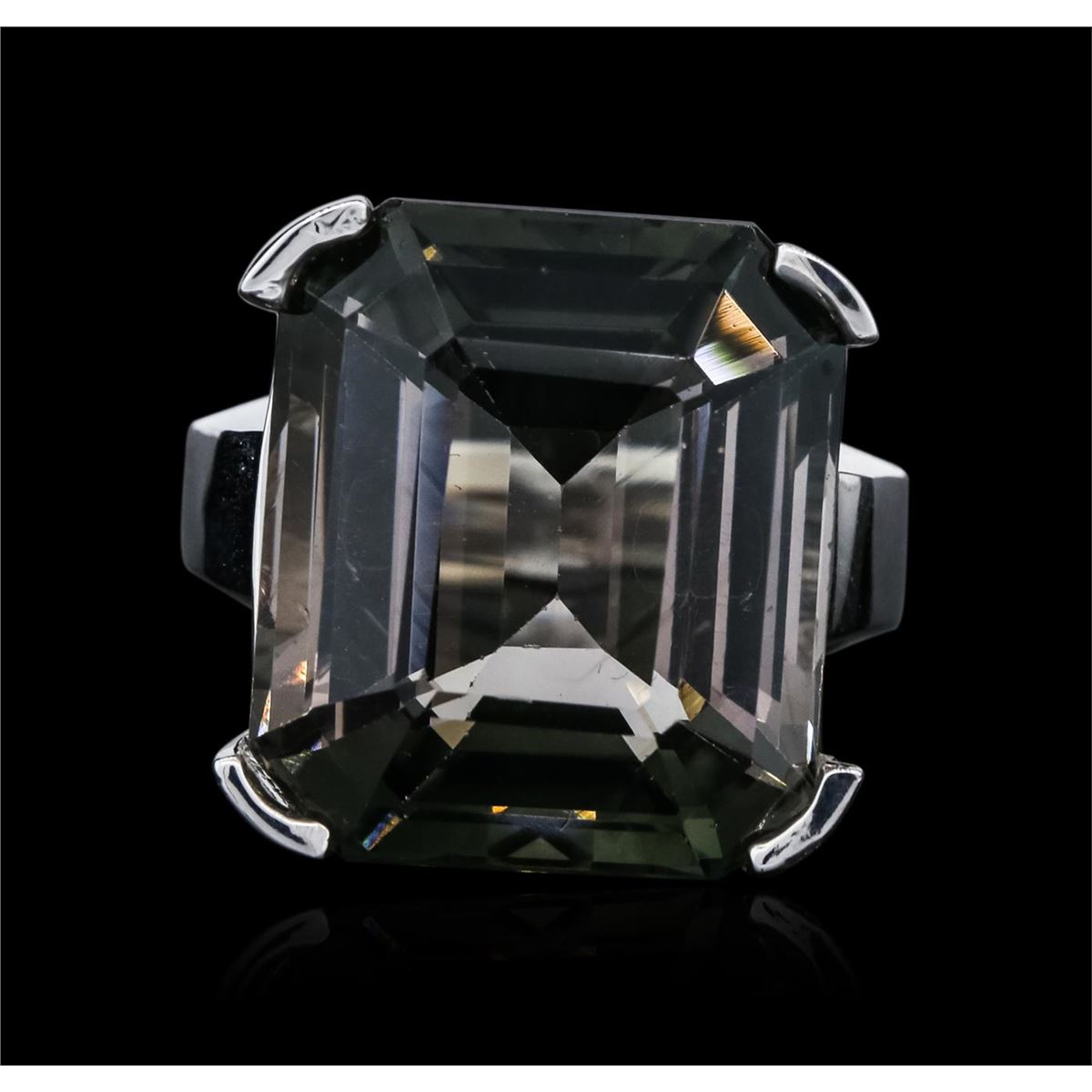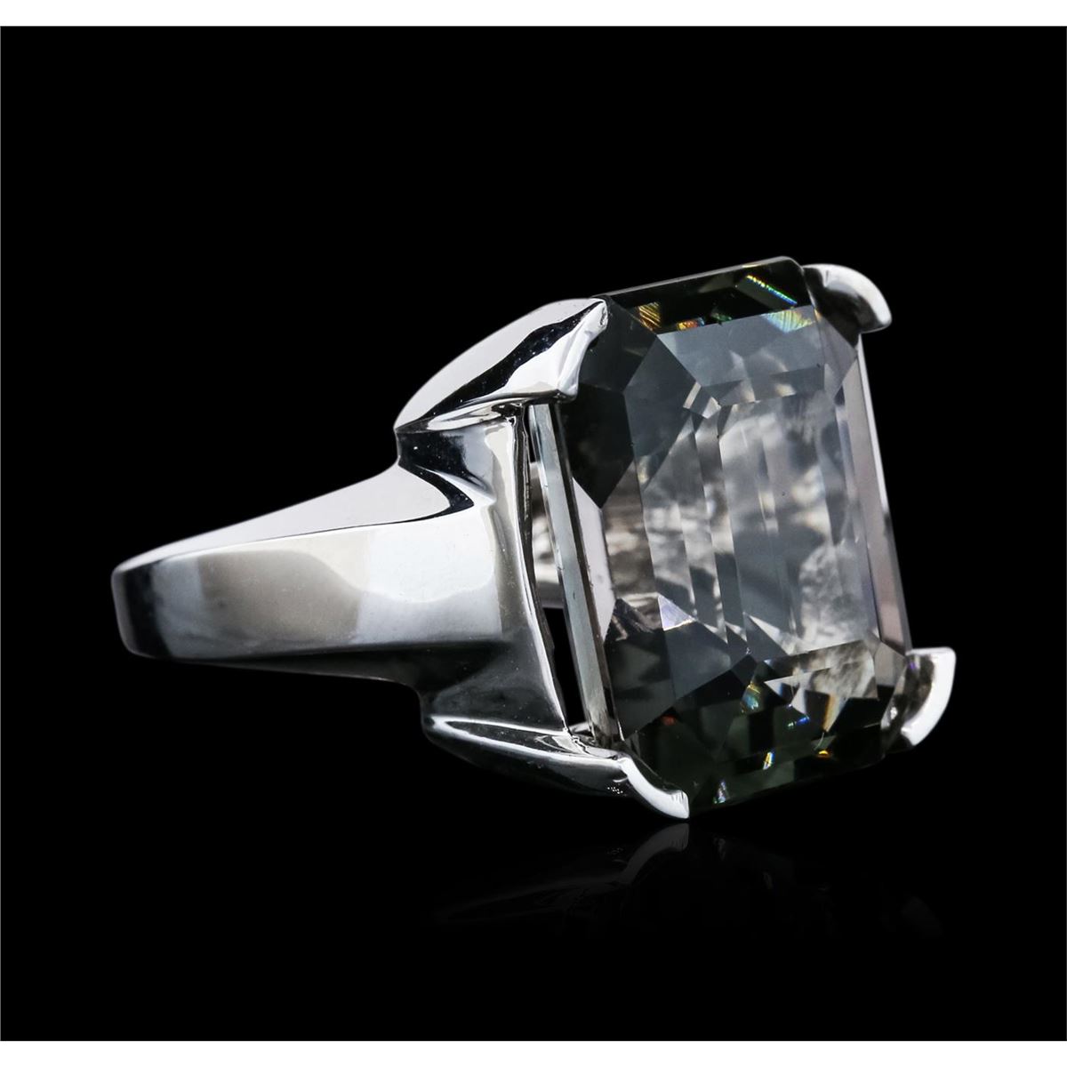One electronically tested 14KT white gold ladies combination cast & assembled tourmaline ring with a bright polish finish. Identified with markings of "14K". Condition is new. Containing: One prong set emerald standard step cut natural green tourmaline, measuring 18.64 x 15.97 x 10.27mm, approximate weight of 25.26ct., clarity is eye clean, type I, light, very slightly grayish, bluish green color, (GIA bG 3/3), cut is good. Colored gemstones are presumed to have been subjected to commonly used enhancement processes. All colored gemstones are graded in the mounting, unless otherwise stated. Total Weight of Colored Stones 25.26ct. Total Weight of Ring 16.10 grams. GGL Appraised at $12,185.00.