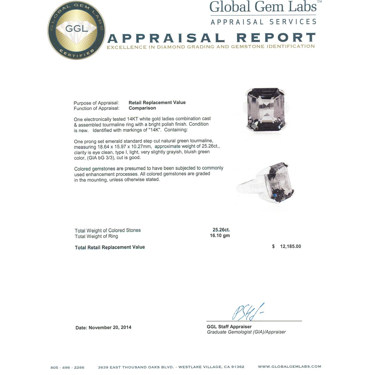 One electronically tested 14KT white gold ladies combination cast & assembled tourmaline ring with a bright polish finish. Identified with markings of "14K". Condition is new. Containing: One prong set emerald standard step cut natural green tourmaline, measuring 18.64 x 15.97 x 10.27mm, approximate weight of 25.26ct., clarity is eye clean, type I, light, very slightly grayish, bluish green color, (GIA bG 3/3), cut is good. Colored gemstones are presumed to have been subjected to commonly used enhancement processes. All colored gemstones are graded in the mounting, unless otherwise stated. Total Weight of Colored Stones 25.26ct. Total Weight of Ring 16.10 grams. GGL Appraised at $12,185.00.
