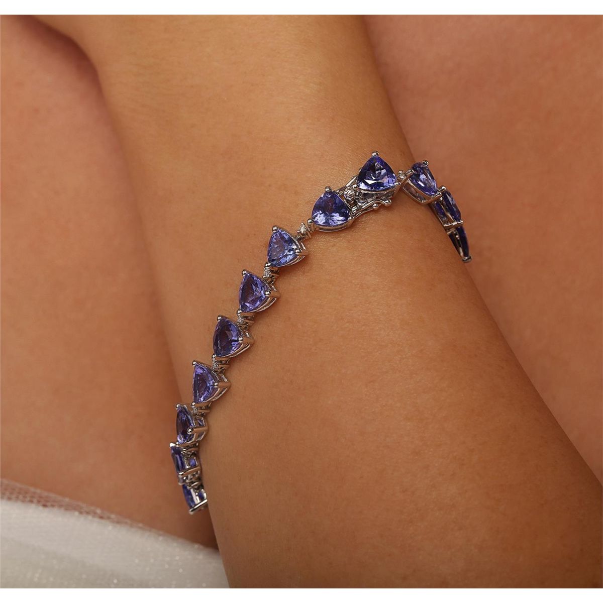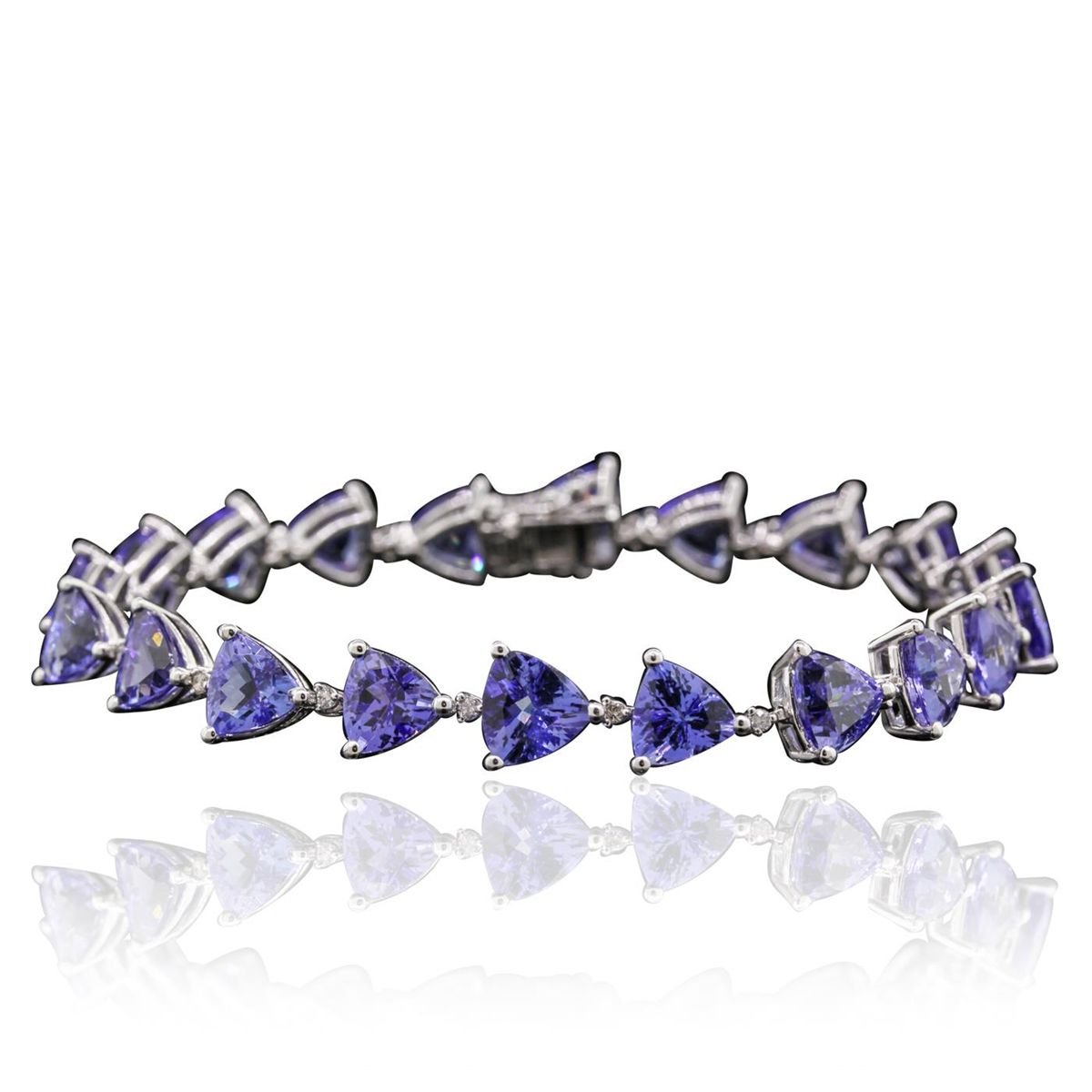 One electronically tested 14KT white gold ladies cast & assembled tanzanite and diamond bracelet with a bright polish finish. Condition is new, good workmanship. Seven and one-half inch length bracelet feature a flexible tanzanite and diamond ribbon, terminating in a concealed clasp with twin safeties. Trademark is CJ. Identified with markings of "14K". Containing: Twenty prong set triangle mixed cut natural tanzanites, measuring 7.00 x 6.80 x 4.20mm, 6% bulge factor, approximate total weight of 25.60ct., clarity is eye clean, type I, medium dark, moderately strong, violetish blue color, (GIA vB 6/4), cut is good. Transmitting light with no distortion, transparent. Measurements & the color grade are an average for the group. Graded in the setting. Tanzanite is a very rare gemstone that is only found in the country of Tanzania. Originally discovered in 1967. Tiffany & Company, named the stone Tanzanite. It is found in the Usumburu Mountains that border the Umba Valley of northern Tanzania. Tanzanite occurs in gray, brown, violet, blue, reddish-purple, & green. The gem is interesting because of its exceptional pleochroism. Rotated in different directions a tanzanite will exhibit multiple changes of color. Tanzanite has a low tolerance to ultrasonic cleaning, and should not be cleaned using this method. Twenty prong set round brilliant cut diamonds, measuring 1.50 - 1.40 x 0.87mm (depth est.) approximate total weight of 20 Stones = 0.32ct. Graded in the setting. Clarity SI-1 to I-1. Color G - I. Total Weight of Colored Stones 25.60 ct. Total Weight of Diamonds 0.32 ct. Total Weight of Bracelet 15.47 grams. AIG Appraised at $20,365.00.