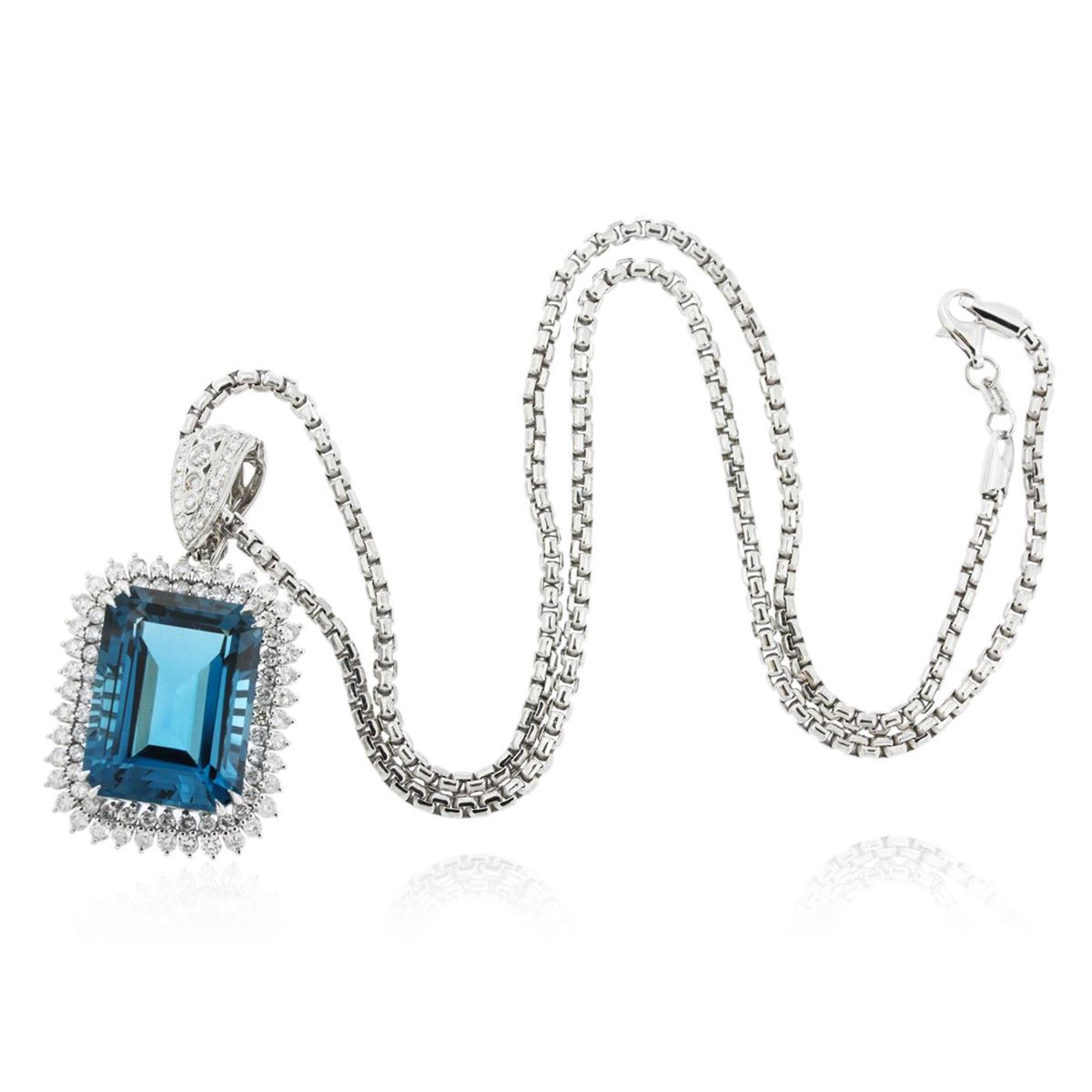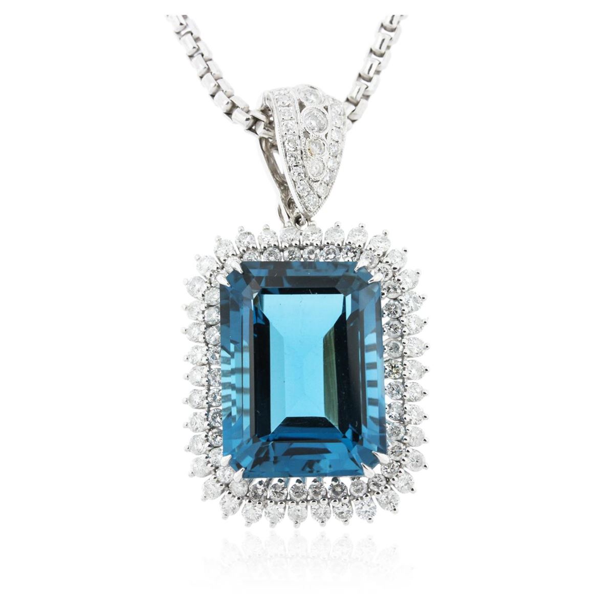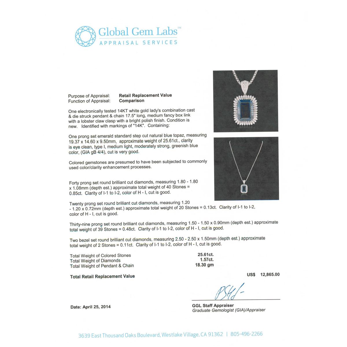 One electronically tested 14KT white gold Ladies combination cast & die struck pendant & chain 17.5" long, medium fancy box link with a lobster claw clasp with a bright polish finish. Condition is new. Identified with markings of "14K". Containing: One prong set emerald standard step cut natural blue topaz, measuring 19.37 x 14.60 x 9.50mm, approximate weight of 25.61ct., clarity is eye clean, type I, medium light, moderately strong, greenish blue color, (GIA gB 4/4), cut is very good. Colored gemstones are presumed to have been subjected to commonly used color/clarity enhancement processes. Forty prong set round brilliant cut diamonds, measuring 1.80 - 1.80 x 1.08mm (depth est.) approximate. Total Weight of 40 Stones = 0.85ct. Clarity: I-1 to I-2. Color: H - I, Cut is Good. Twenty prong set round brilliant cut diamonds, measuring 1.20 - 1.20 x 0.72mm (depth est.) approximate. Total Weight of 20 Stones = 0.13ct. Clarity: I-1 to I-2. Color: H - I, Cut is Good. Thirty-Nine prong set round brilliant cut diamonds, measuring 1.50 - 1.50 x 0.90mm (depth est.) approximate. Total Weight of 39 Stones = 0.48ct. Clarity: I-1 to I-2. Color: H - I, Cut is Good. Two bezel set round brilliant cut diamonds, measuring 2.50 - 2.50 x 1.50mm (depth est.) approximate. Total Weight of 2 Stones = 0.11ct. Clarity: I-1 to I-2. Color: H - I, Cut is Good. Total Weight of Colored Stones 25.61ct. Total Weight of Diamonds 1.57ct. Total Weight of Pendant & Chain 18.30 grams. GGL Appraised at $12,865.00.