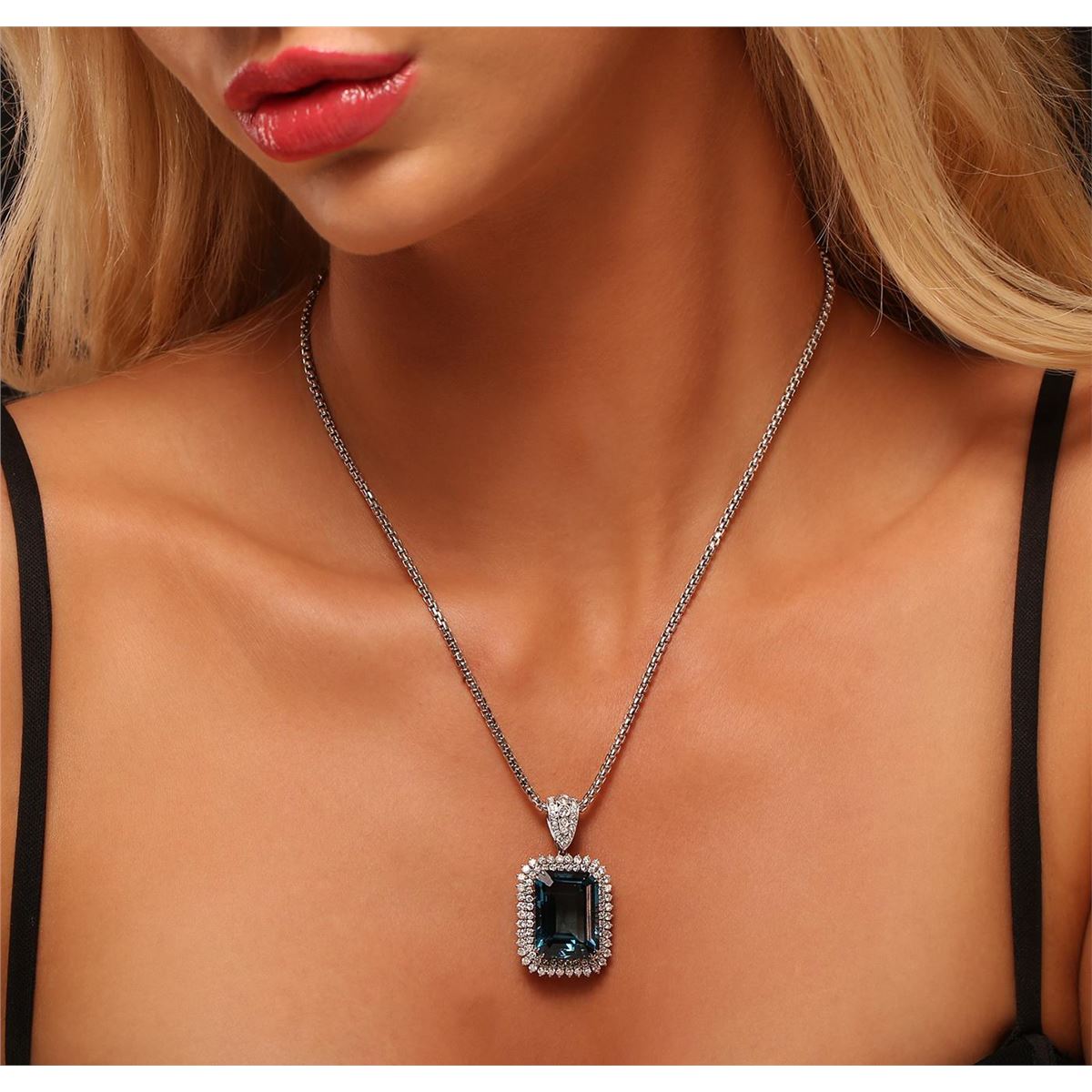 One electronically tested 14KT white gold Ladies combination cast & die struck pendant & chain 17.5" long, medium fancy box link with a lobster claw clasp with a bright polish finish. Condition is new. Identified with markings of "14K". Containing: One prong set emerald standard step cut natural blue topaz, measuring 19.37 x 14.60 x 9.50mm, approximate weight of 25.61ct., clarity is eye clean, type I, medium light, moderately strong, greenish blue color, (GIA gB 4/4), cut is very good. Colored gemstones are presumed to have been subjected to commonly used color/clarity enhancement processes. Forty prong set round brilliant cut diamonds, measuring 1.80 - 1.80 x 1.08mm (depth est.) approximate. Total Weight of 40 Stones = 0.85ct. Clarity: I-1 to I-2. Color: H - I, Cut is Good. Twenty prong set round brilliant cut diamonds, measuring 1.20 - 1.20 x 0.72mm (depth est.) approximate. Total Weight of 20 Stones = 0.13ct. Clarity: I-1 to I-2. Color: H - I, Cut is Good. Thirty-Nine prong set round brilliant cut diamonds, measuring 1.50 - 1.50 x 0.90mm (depth est.) approximate. Total Weight of 39 Stones = 0.48ct. Clarity: I-1 to I-2. Color: H - I, Cut is Good. Two bezel set round brilliant cut diamonds, measuring 2.50 - 2.50 x 1.50mm (depth est.) approximate. Total Weight of 2 Stones = 0.11ct. Clarity: I-1 to I-2. Color: H - I, Cut is Good. Total Weight of Colored Stones 25.61ct. Total Weight of Diamonds 1.57ct. Total Weight of Pendant & Chain 18.30 grams. GGL Appraised at $12,865.00.