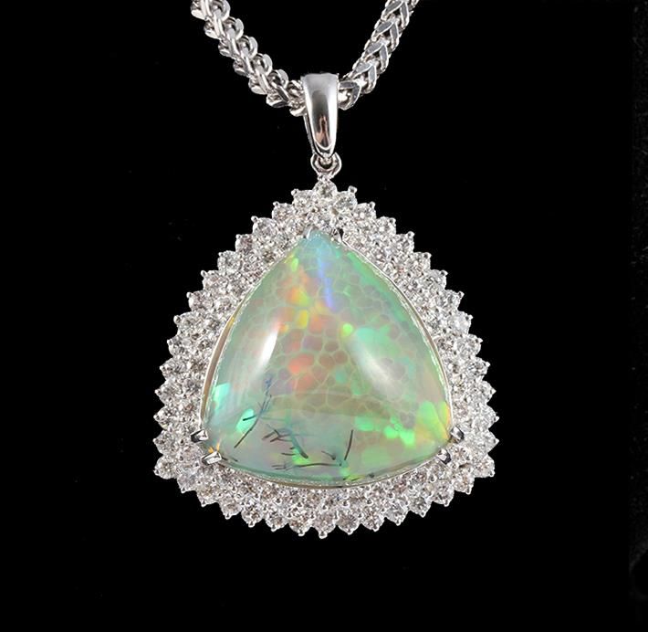 One electronically tested custom cast & assembled opal & diamond pendant with chain. The pendant features an Ethiopian opal is set in an 18KT white gold frame within a tiered diamond gallery. The pendant is supported by a 14KT white gold three millimeter designer style seventeen inch length chain. Condition is new, good workmanship. Containing: One Ethiopian opal that is cut in a triangle shaped cabochon and is prong set, measuring 24.00mm x 24.00mm x 12.00mm, the approximate weight is 25.72 carats. The opal has a quite bright, orange-green play of color (fire) in a rolling flash fire pattern; a high dome; a good cut; slightly included; slight variation in base in its brightness and pattern; and is somewhat directional. Naturally occurring internal & external characteristics are present. Graded in the setting. Eighty-Three prong set round brilliant cut diamonds, measuring 2.30 - 2.00 x 1.33mm (depth est.), 2.00% GTCF approximate total weight of 83 Stones = 3.51ct. Graded in the setting. Clarity VS-2 to SI-2. Color F - H. Total Weight of Opal 25.72 ct. Total Weight of Diamonds 3.51 ct. Total Weight of Pendant with Chain 25.85gm. AIG Appraised at $23,300.00.