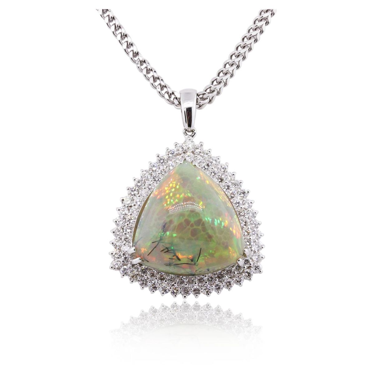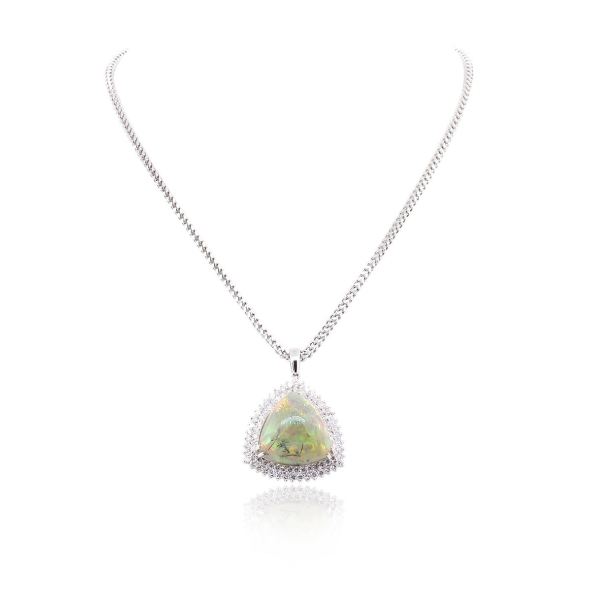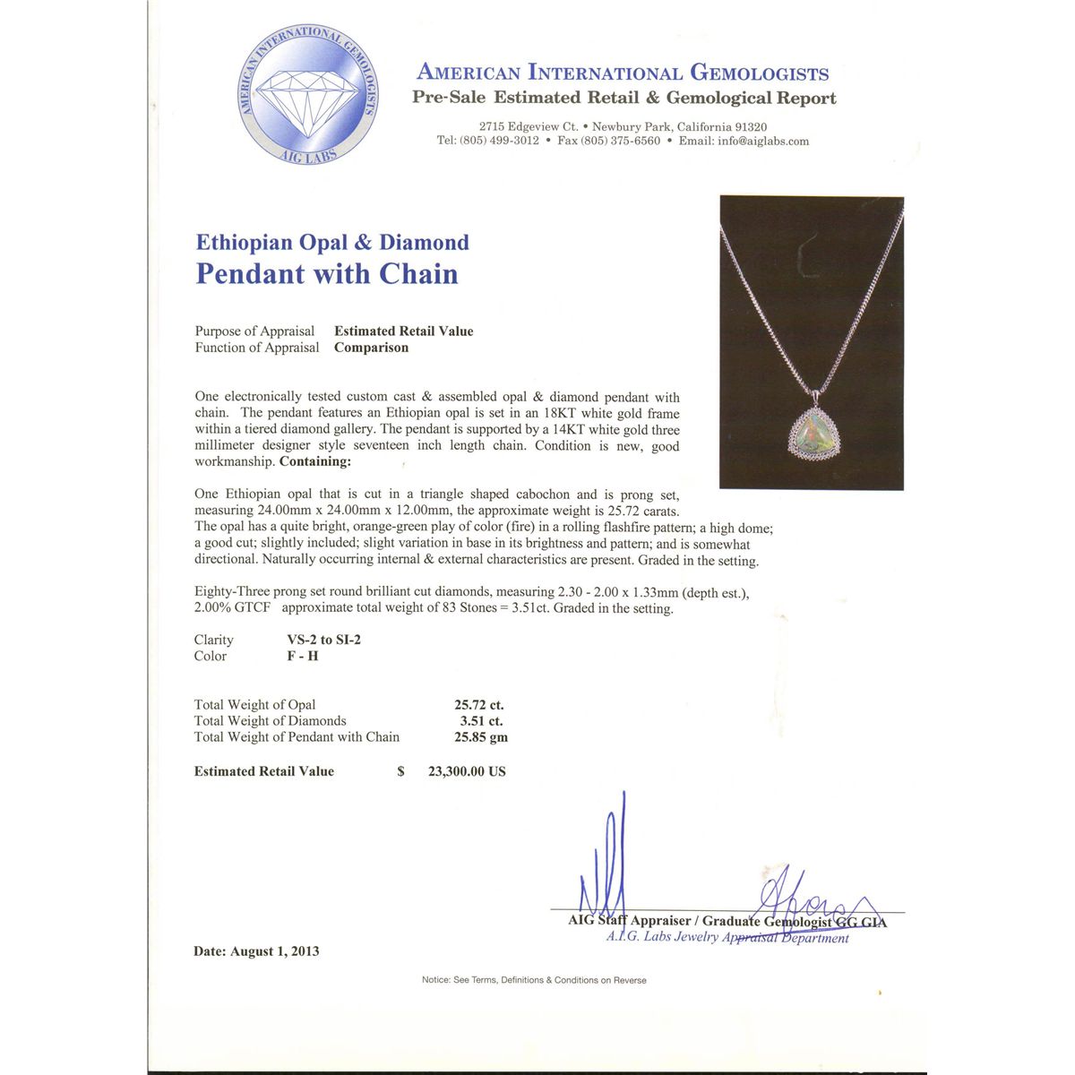 One electronically tested custom cast & assembled opal & diamond pendant with chain. The pendant features an Ethiopian opal is set in an 18KT white gold frame within a tiered diamond gallery. The pendant is supported by a 14KT white gold three millimeter designer style seventeen inch length chain. Condition is new, good workmanship. Containing: One Ethiopian opal that is cut in a triangle shaped cabochon and is prong set, measuring 24.00mm x 24.00mm x 12.00mm, the approximate weight is 25.72 carats. The opal has a quite bright, orange-green play of color (fire) in a rolling flash fire pattern; a high dome; a good cut; slightly included; slight variation in base in its brightness and pattern; and is somewhat directional. Naturally occurring internal & external characteristics are present. Graded in the setting. Eighty-Three prong set round brilliant cut diamonds, measuring 2.30 - 2.00 x 1.33mm (depth est.), 2.00% GTCF approximate total weight of 83 Stones = 3.51ct. Graded in the setting. Clarity VS-2 to SI-2. Color F - H. Total Weight of Opal 25.72 ct. Total Weight of Diamonds 3.51 ct. Total Weight of Pendant with Chain 25.85gm. AIG Appraised at $23,300.00.
