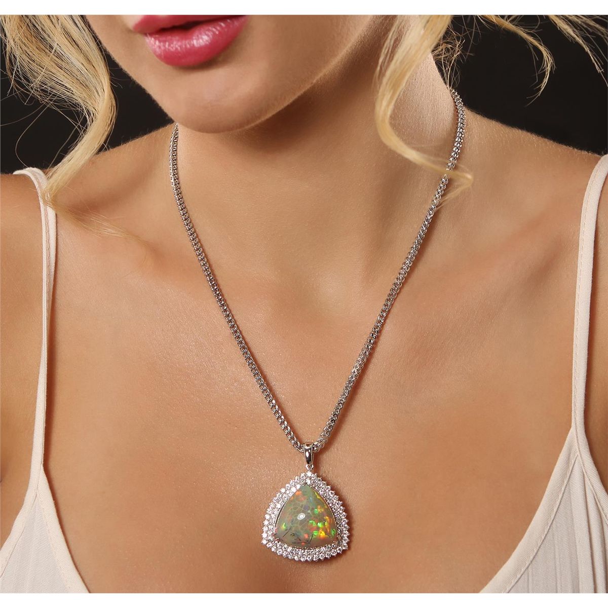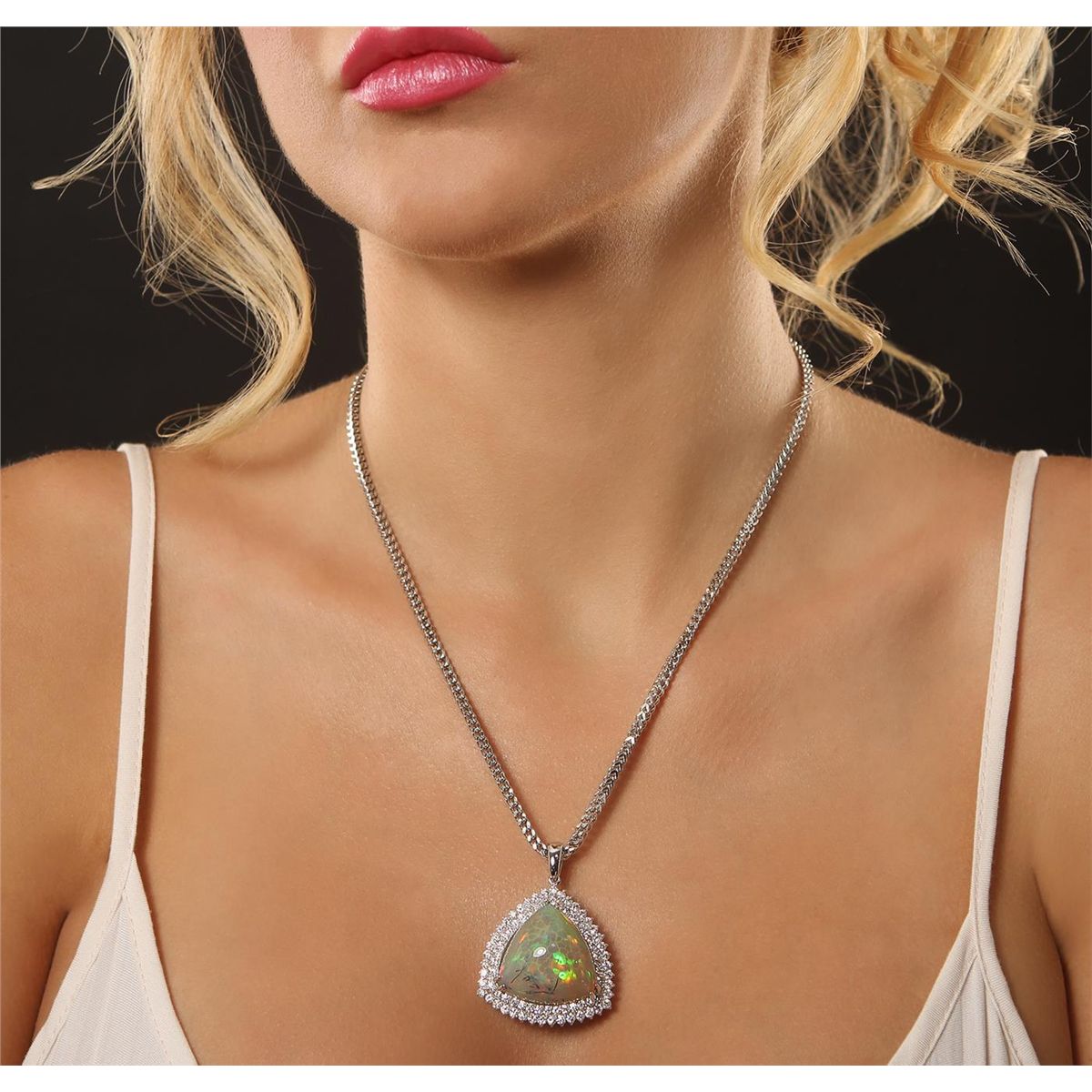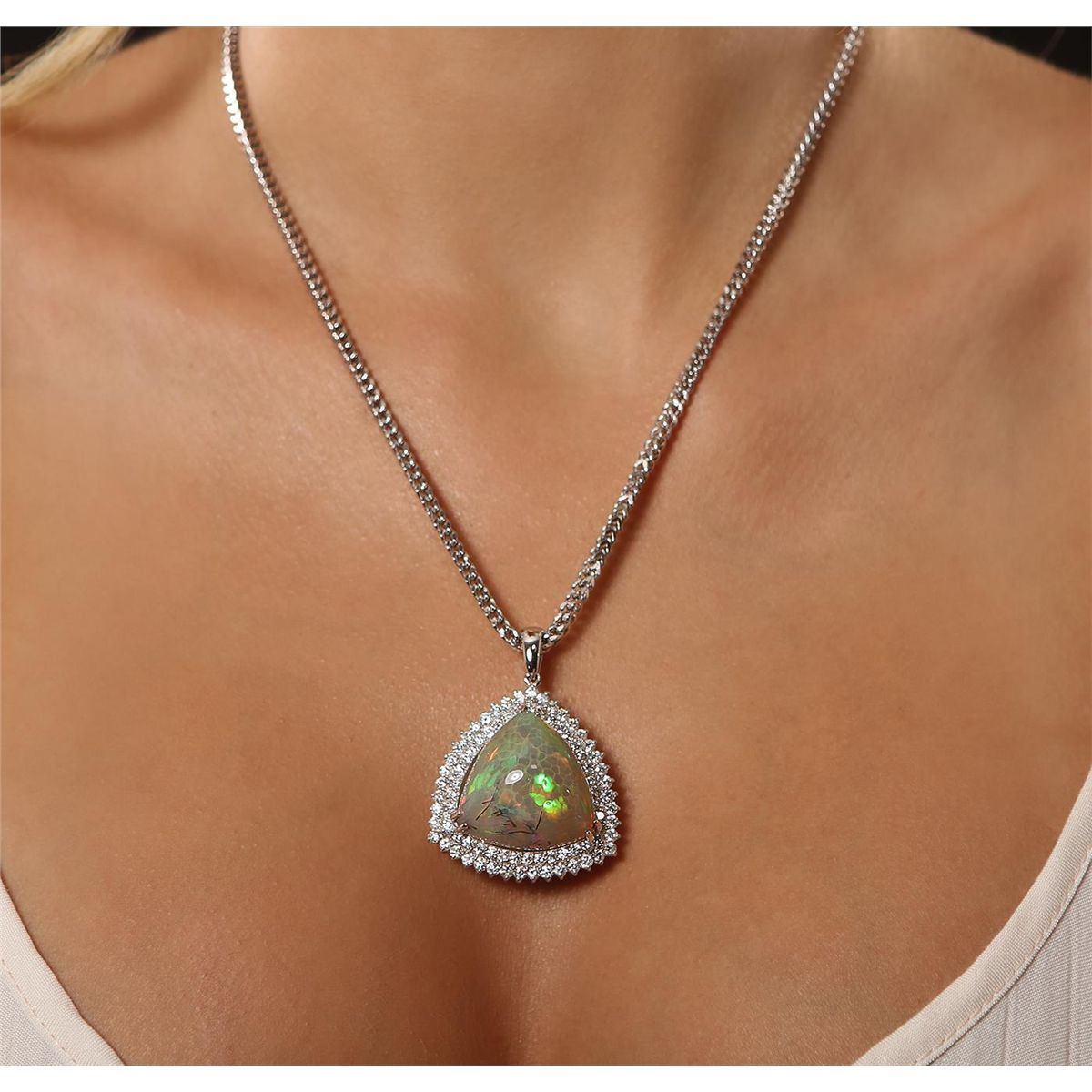 One electronically tested custom cast & assembled opal & diamond pendant with chain. The pendant features an Ethiopian opal is set in an 18KT white gold frame within a tiered diamond gallery. The pendant is supported by a 14KT white gold three millimeter designer style seventeen inch length chain. Condition is new, good workmanship. Containing: One Ethiopian opal that is cut in a triangle shaped cabochon and is prong set, measuring 24.00mm x 24.00mm x 12.00mm, the approximate weight is 25.72 carats. The opal has a quite bright, orange-green play of color (fire) in a rolling flash fire pattern; a high dome; a good cut; slightly included; slight variation in base in its brightness and pattern; and is somewhat directional. Naturally occurring internal & external characteristics are present. Graded in the setting. Eighty-Three prong set round brilliant cut diamonds, measuring 2.30 - 2.00 x 1.33mm (depth est.), 2.00% GTCF approximate total weight of 83 Stones = 3.51ct. Graded in the setting. Clarity VS-2 to SI-2. Color F - H. Total Weight of Opal 25.72 ct. Total Weight of Diamonds 3.51 ct. Total Weight of Pendant with Chain 25.85gm. AIG Appraised at $23,300.00.